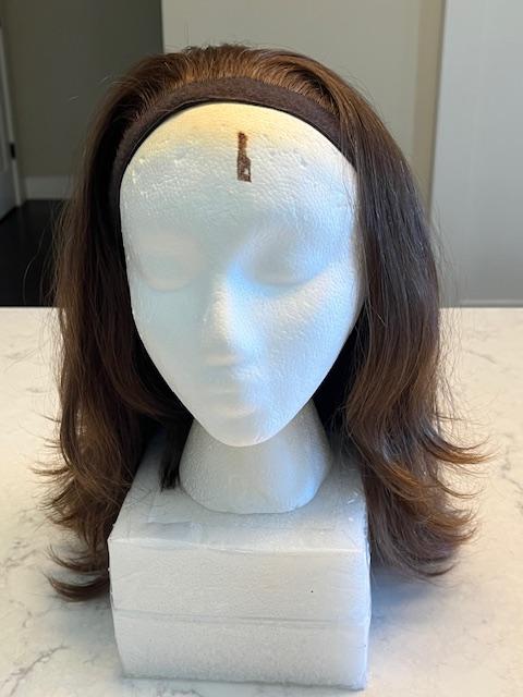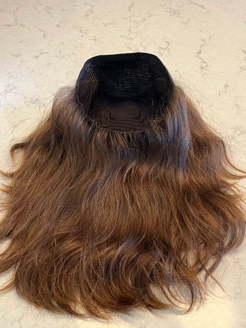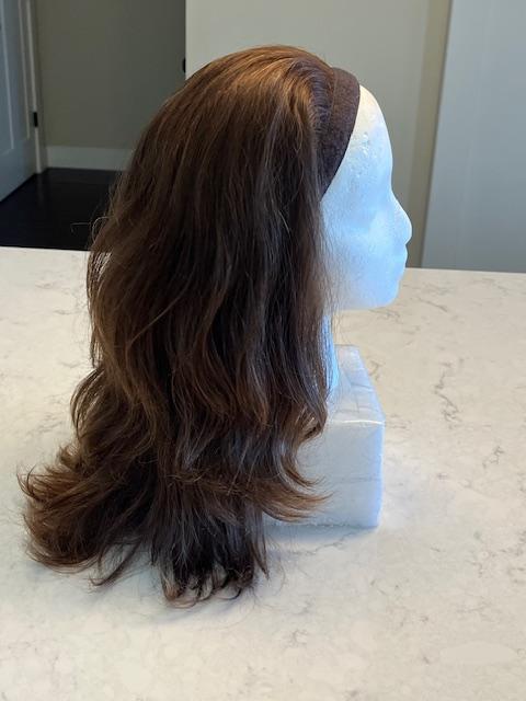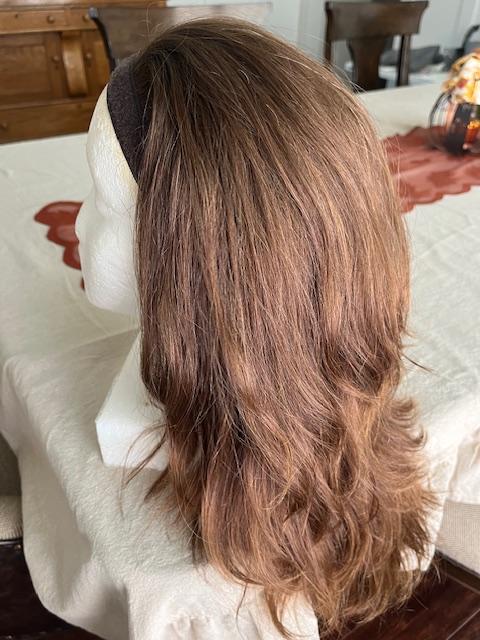 Other: This is a sport bandfall wig meant to be worn up as the wefts are sewn in a circle but I think it could potentially be worn up or down depending on how you style it. I have only tried this piece on a few times never worn out. Hair is virgin European and very soft. I am usually a size extra small, 20.5" circumference and this piece fits too big on me.