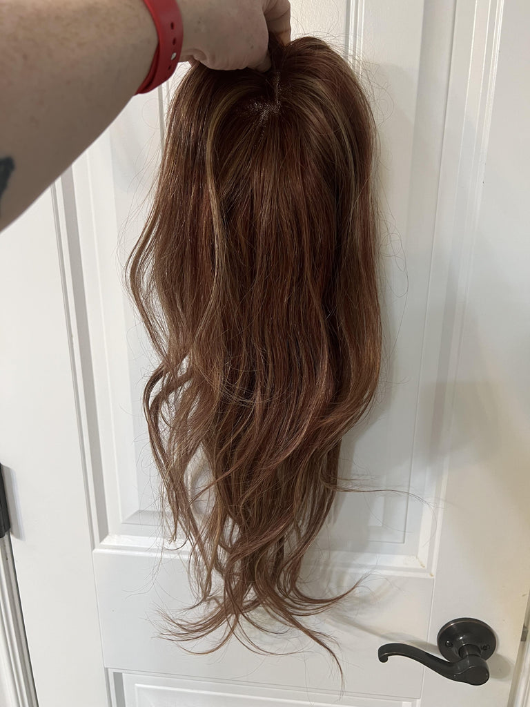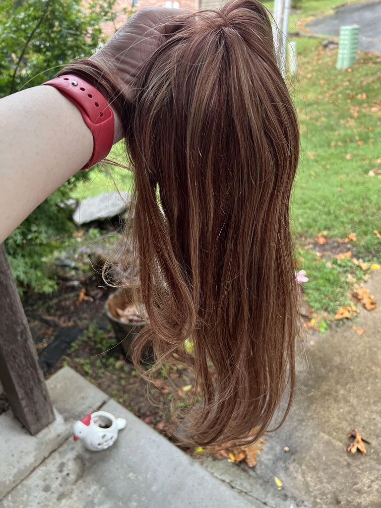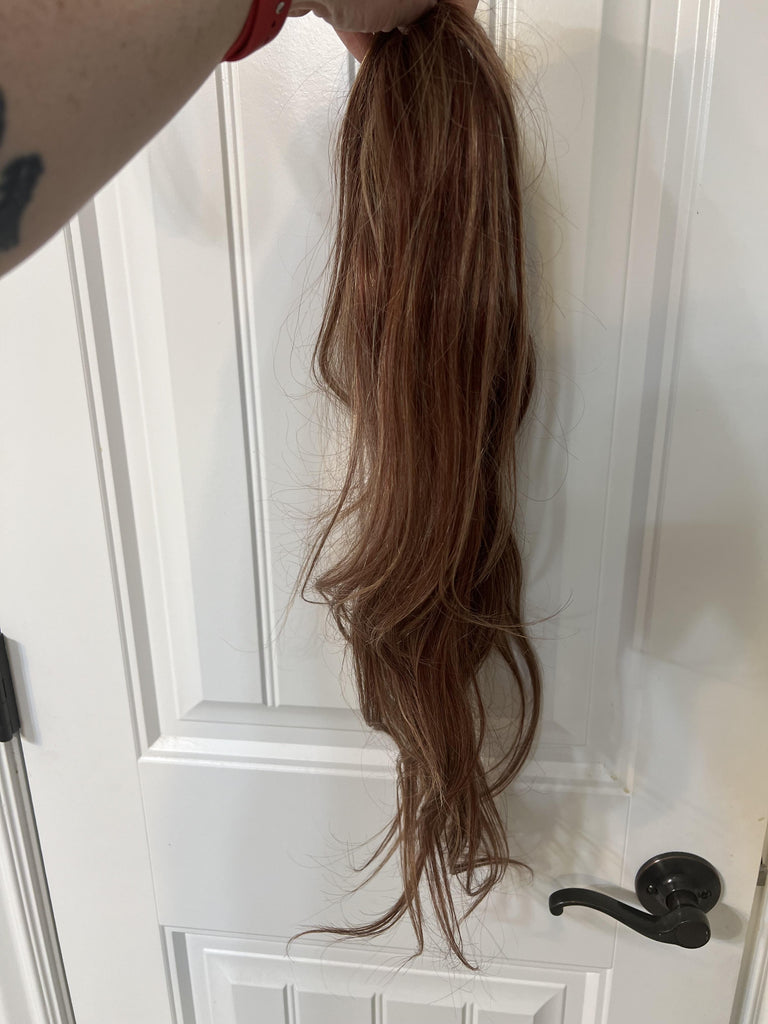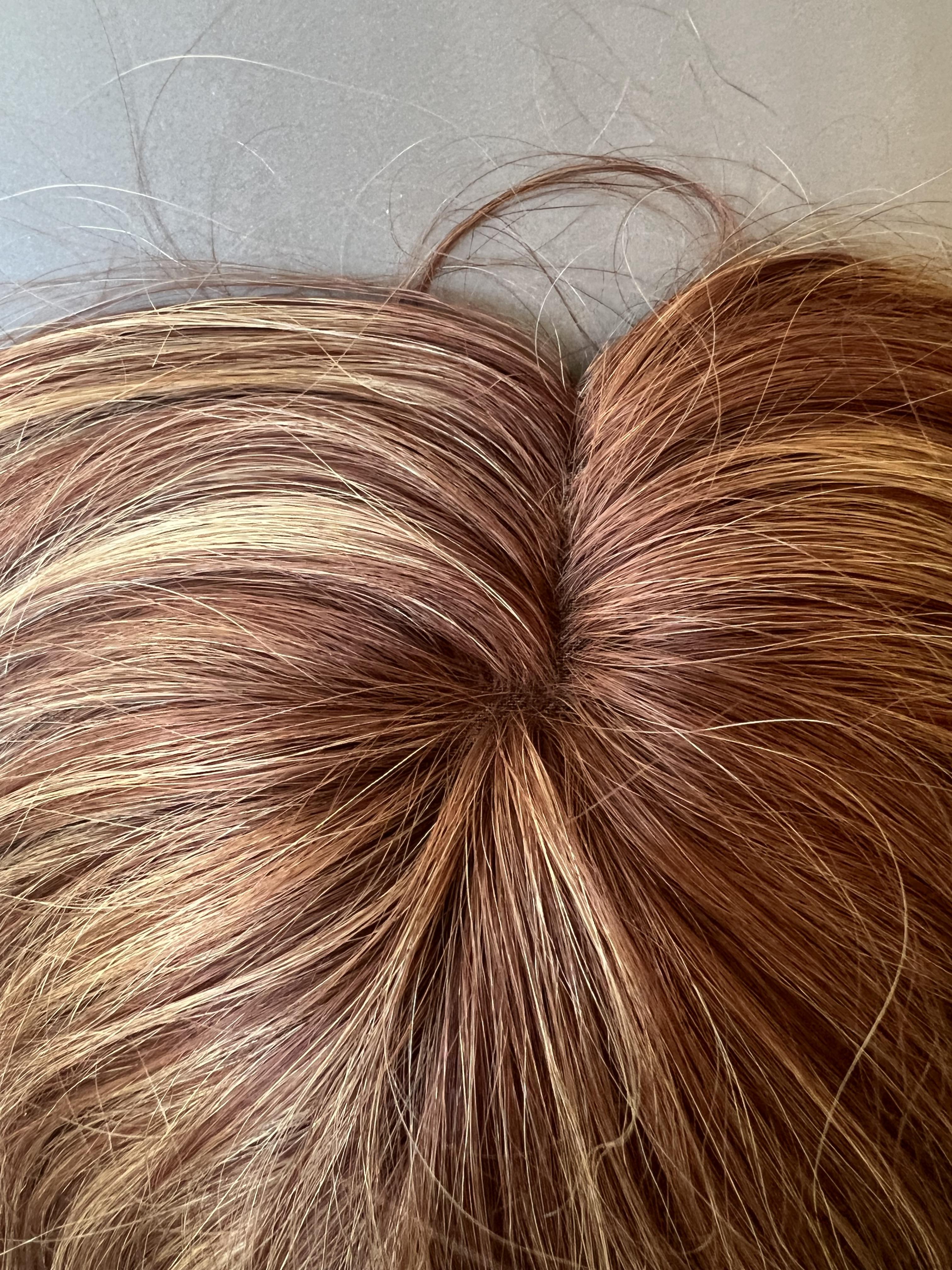 Color: Warm medium red with golden blonde highlights and a warm red 1" root