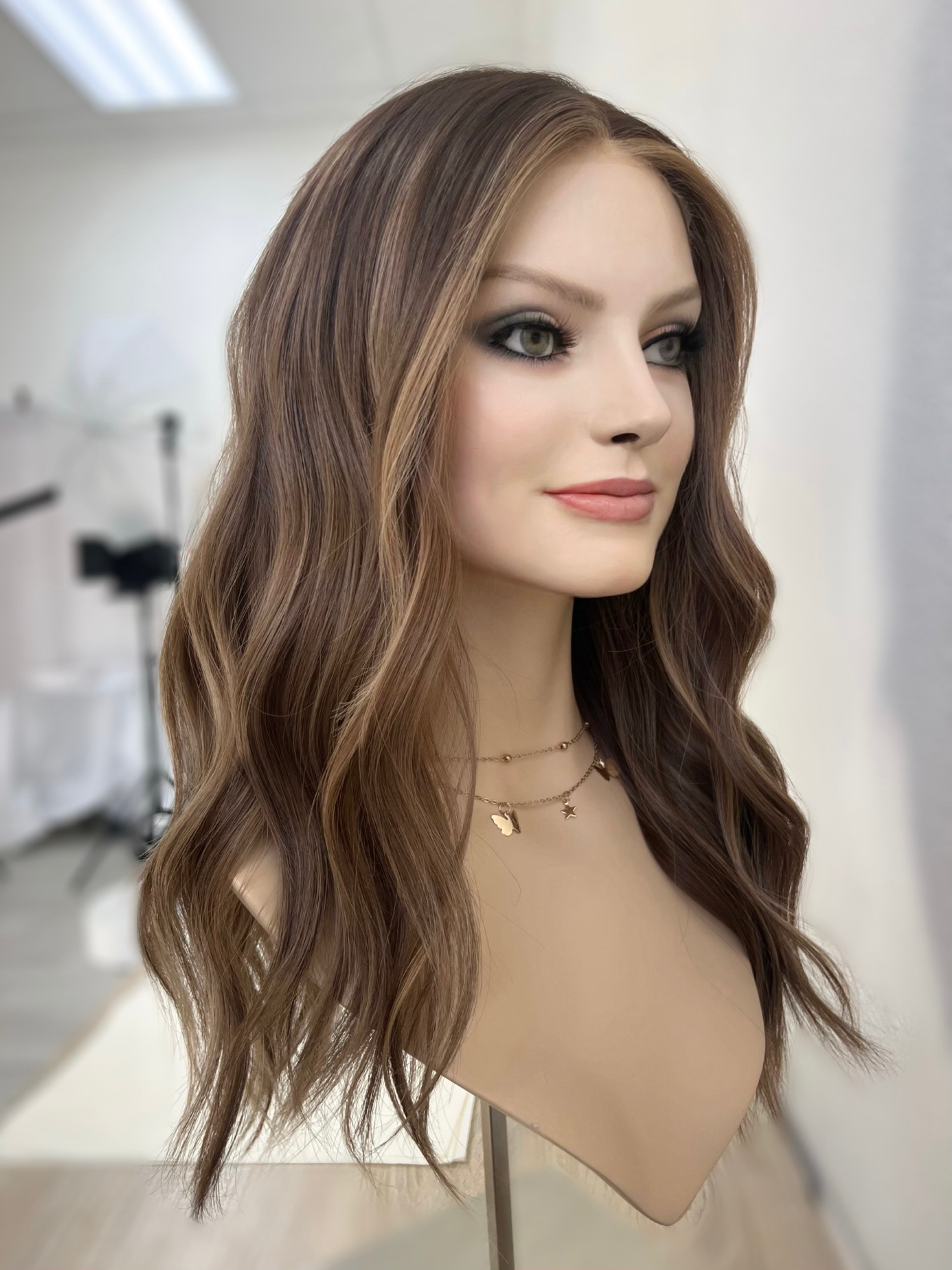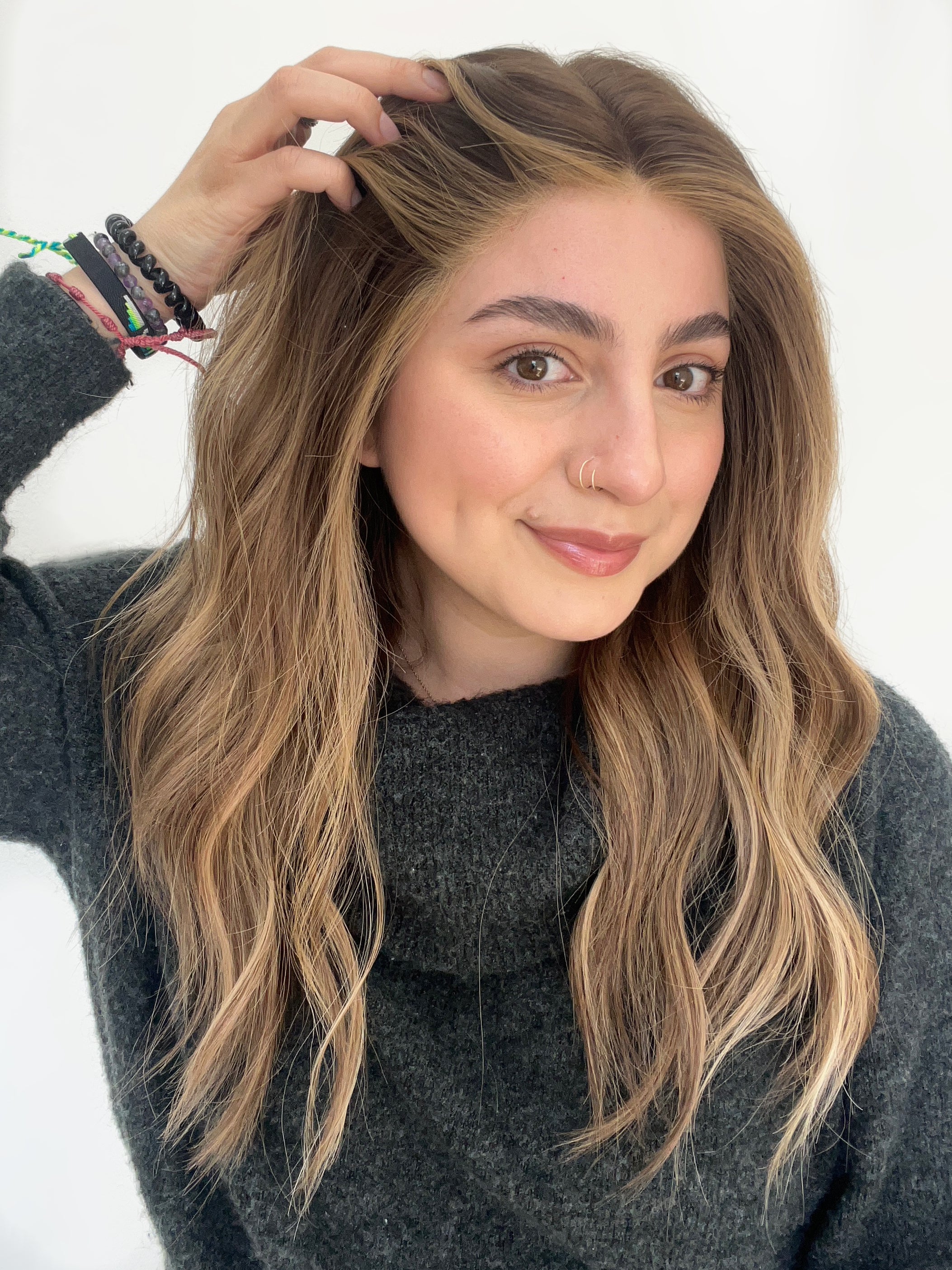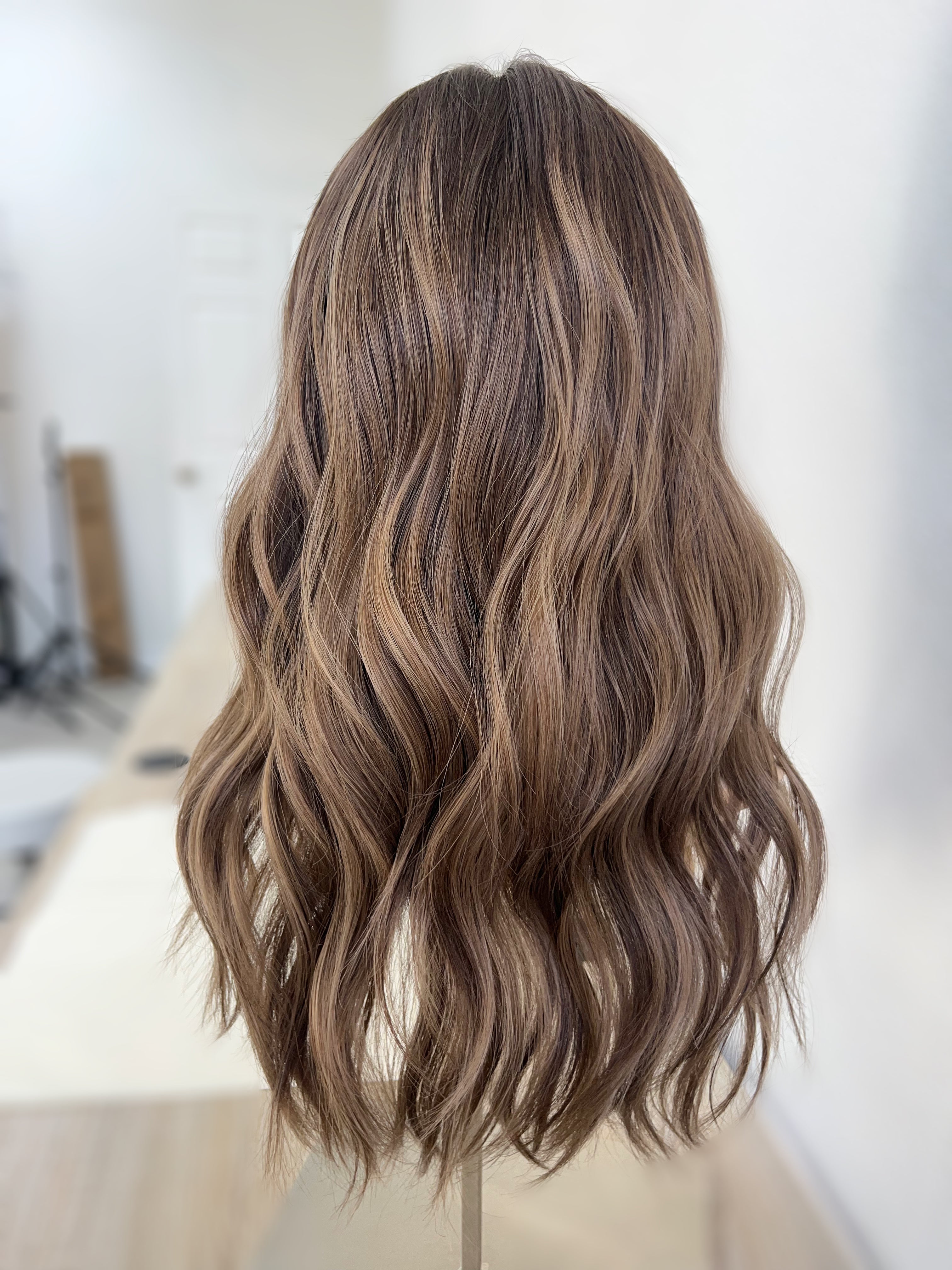 Color: Medium brown root and base into a light honey blonde balayage with blend of light, warm and slightly ashy tones throughout and blonde money pieces