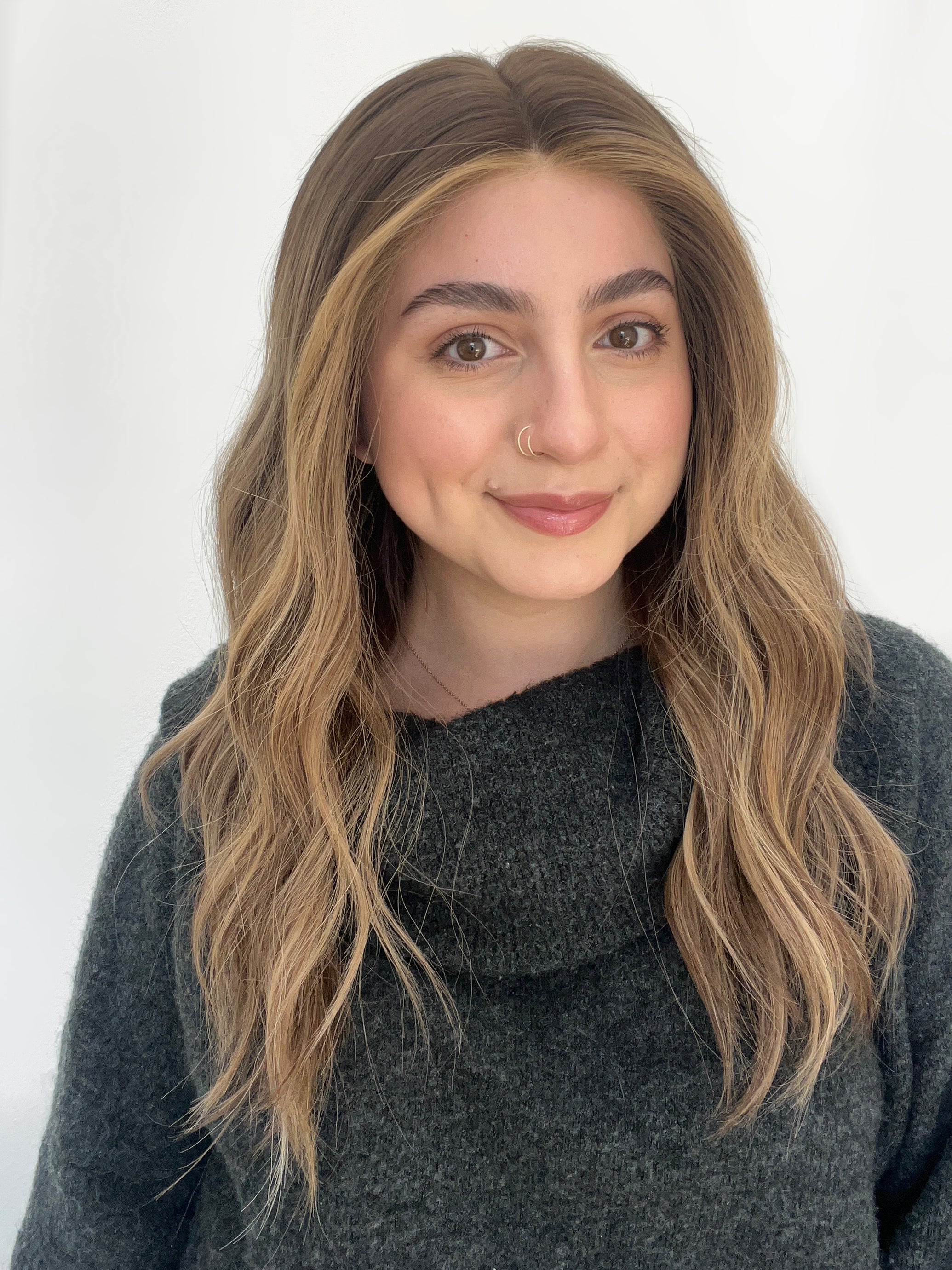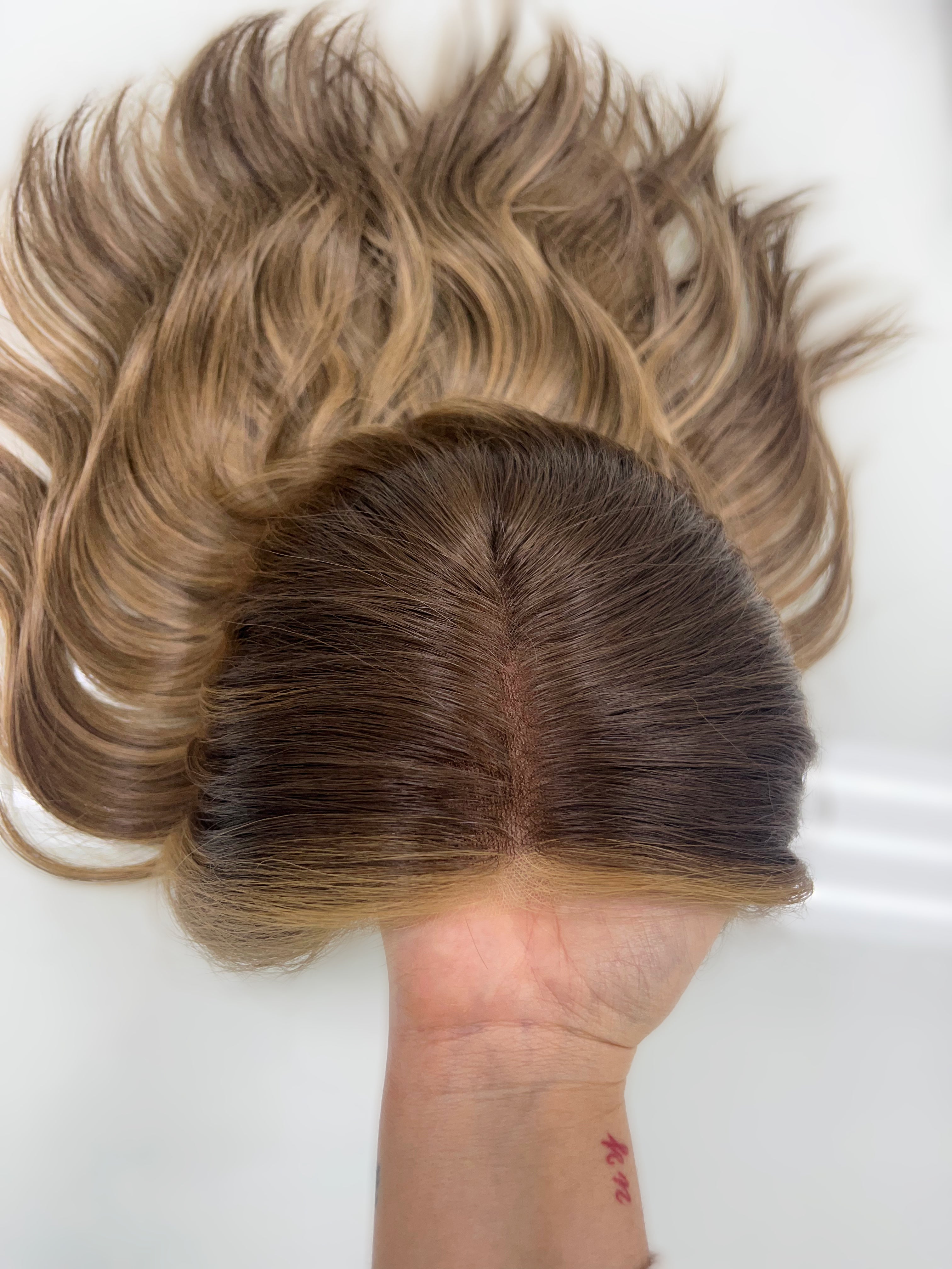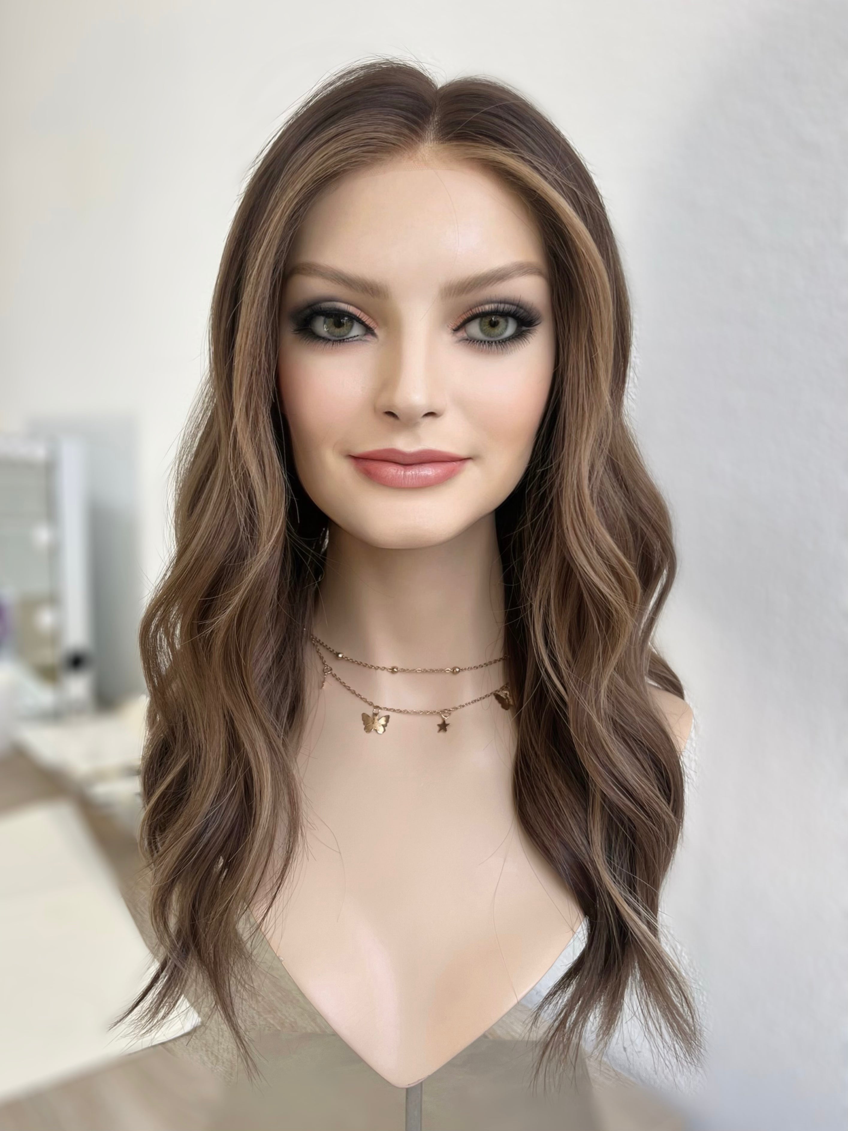 Color: Medium brown root and base into a light honey blonde balayage with blend of light, warm and slightly ashy tones throughout and blonde money pieces