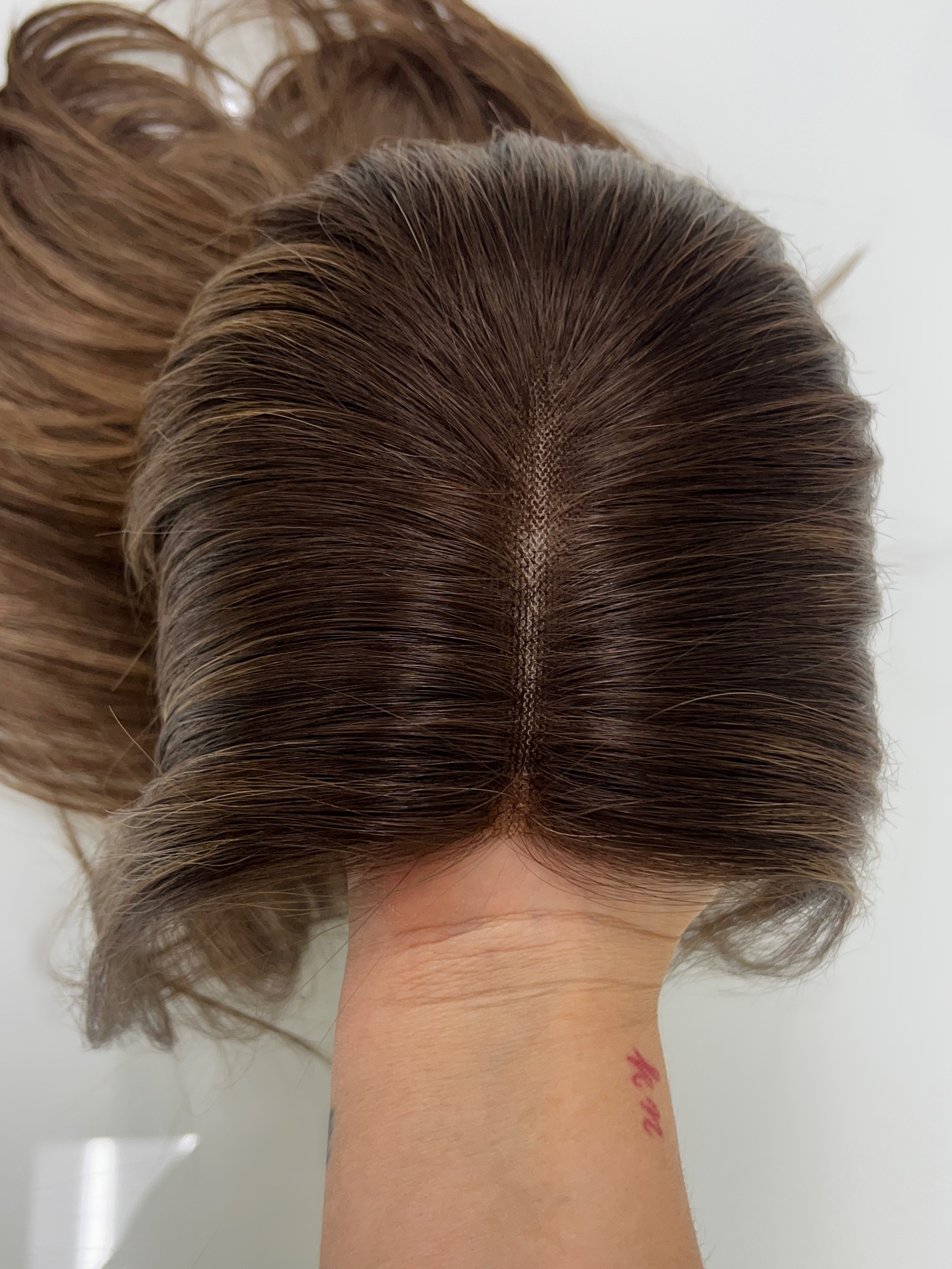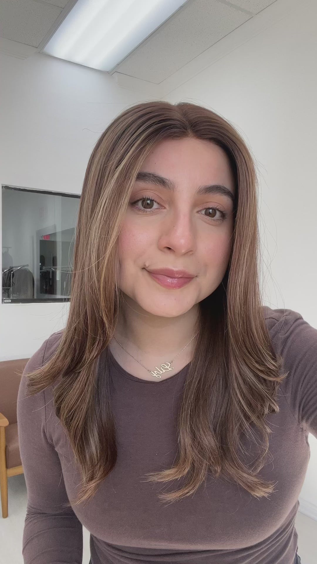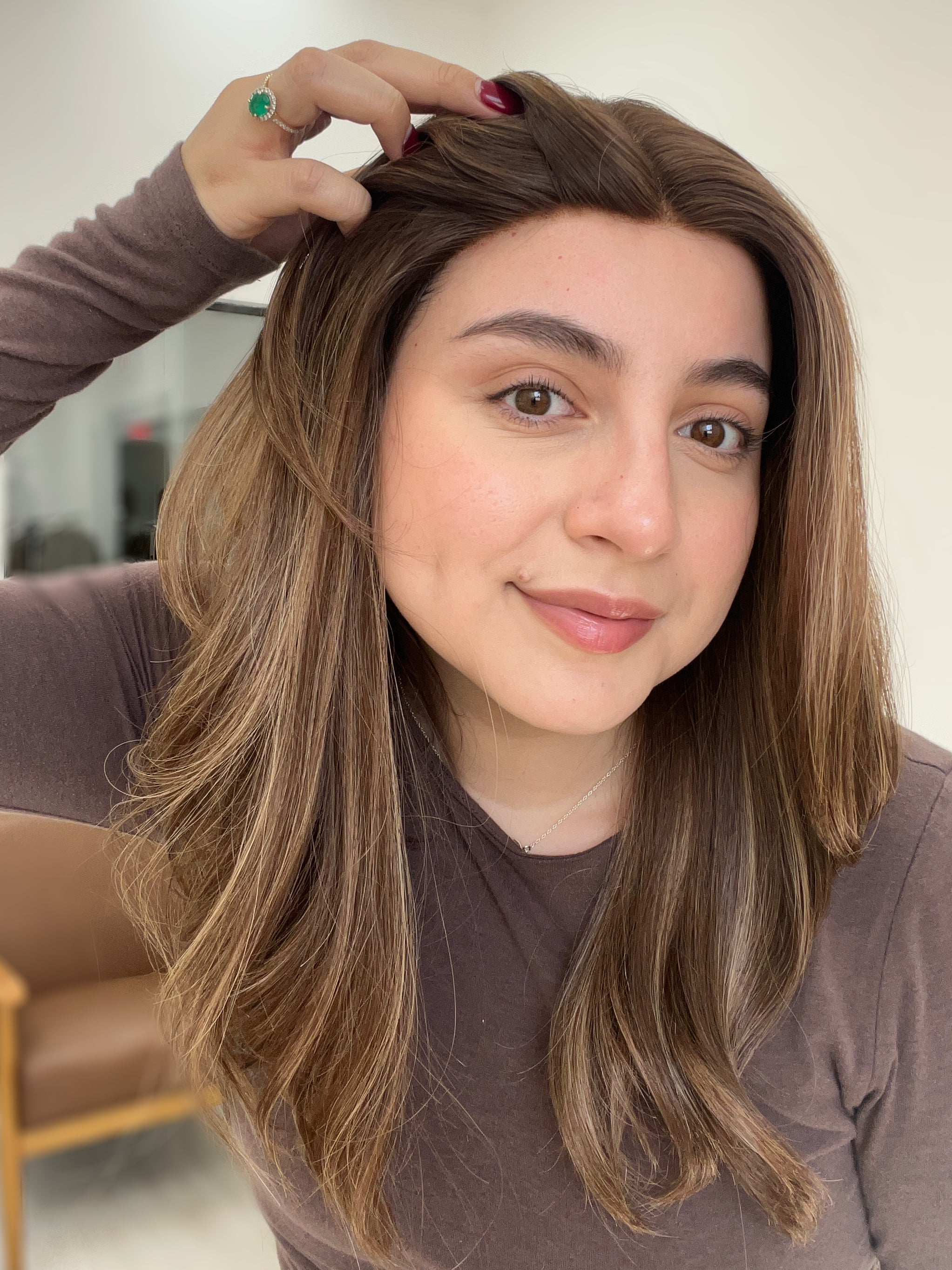 Color: Medium brown base with subtle cool to warmer tones and a darker medium brown root smudge