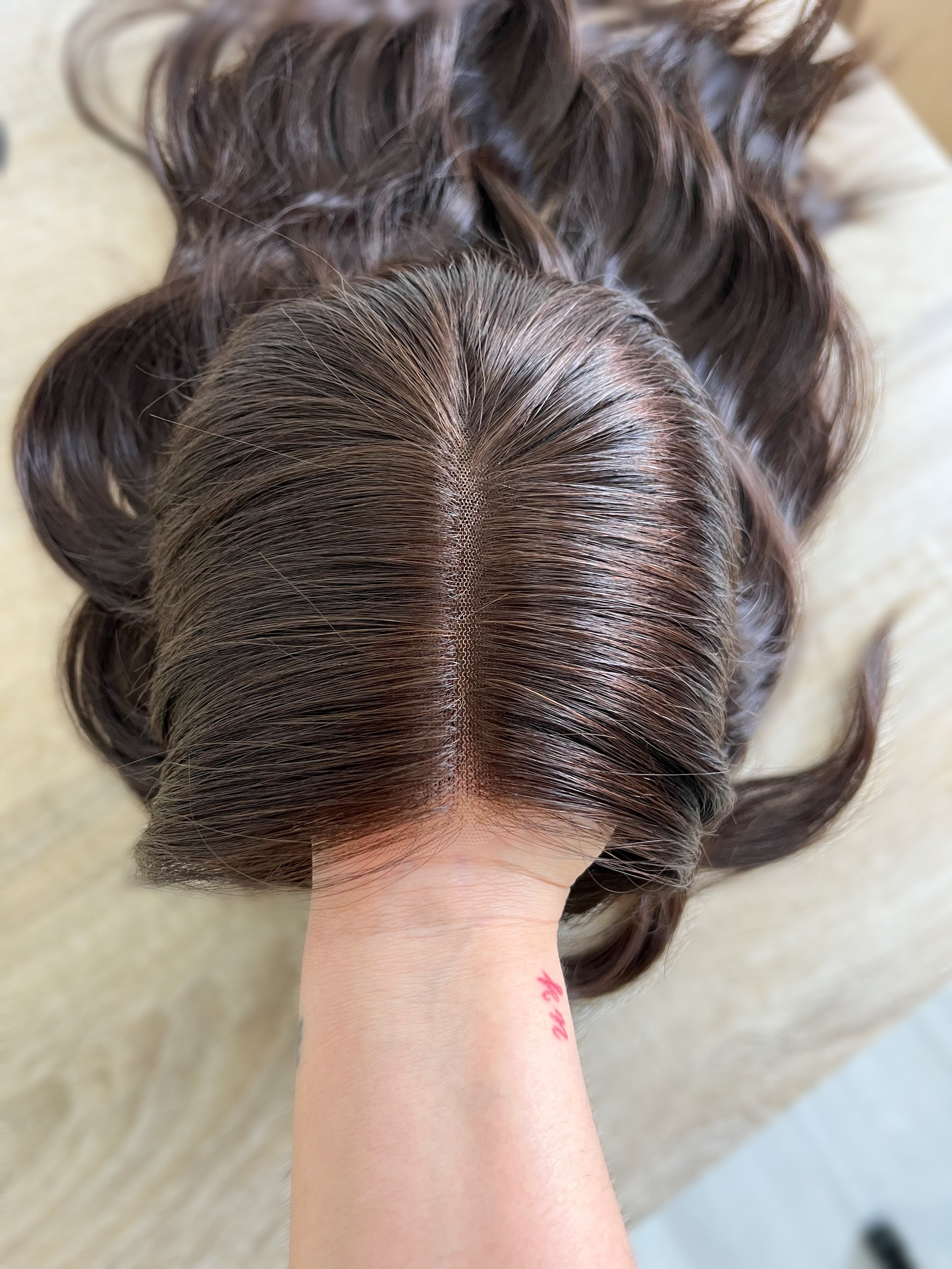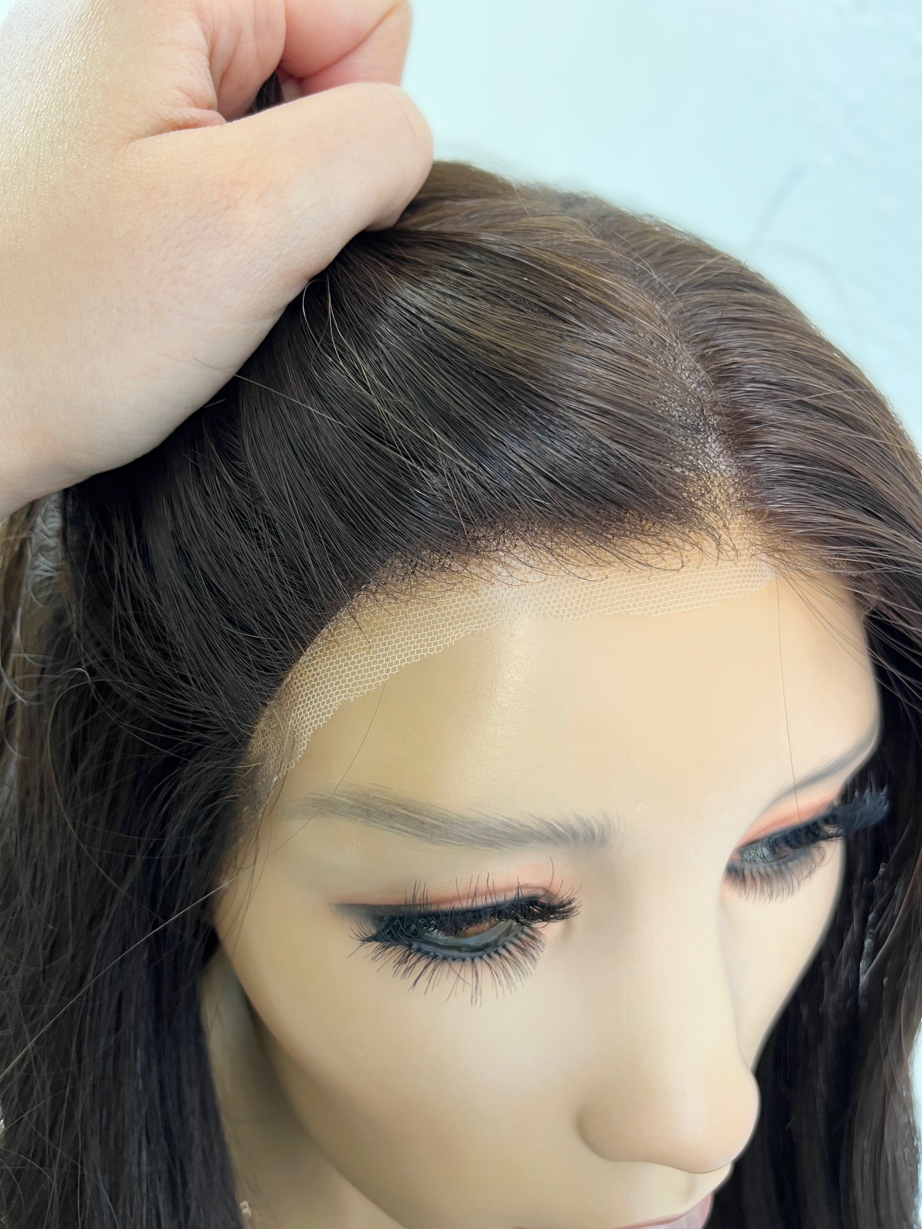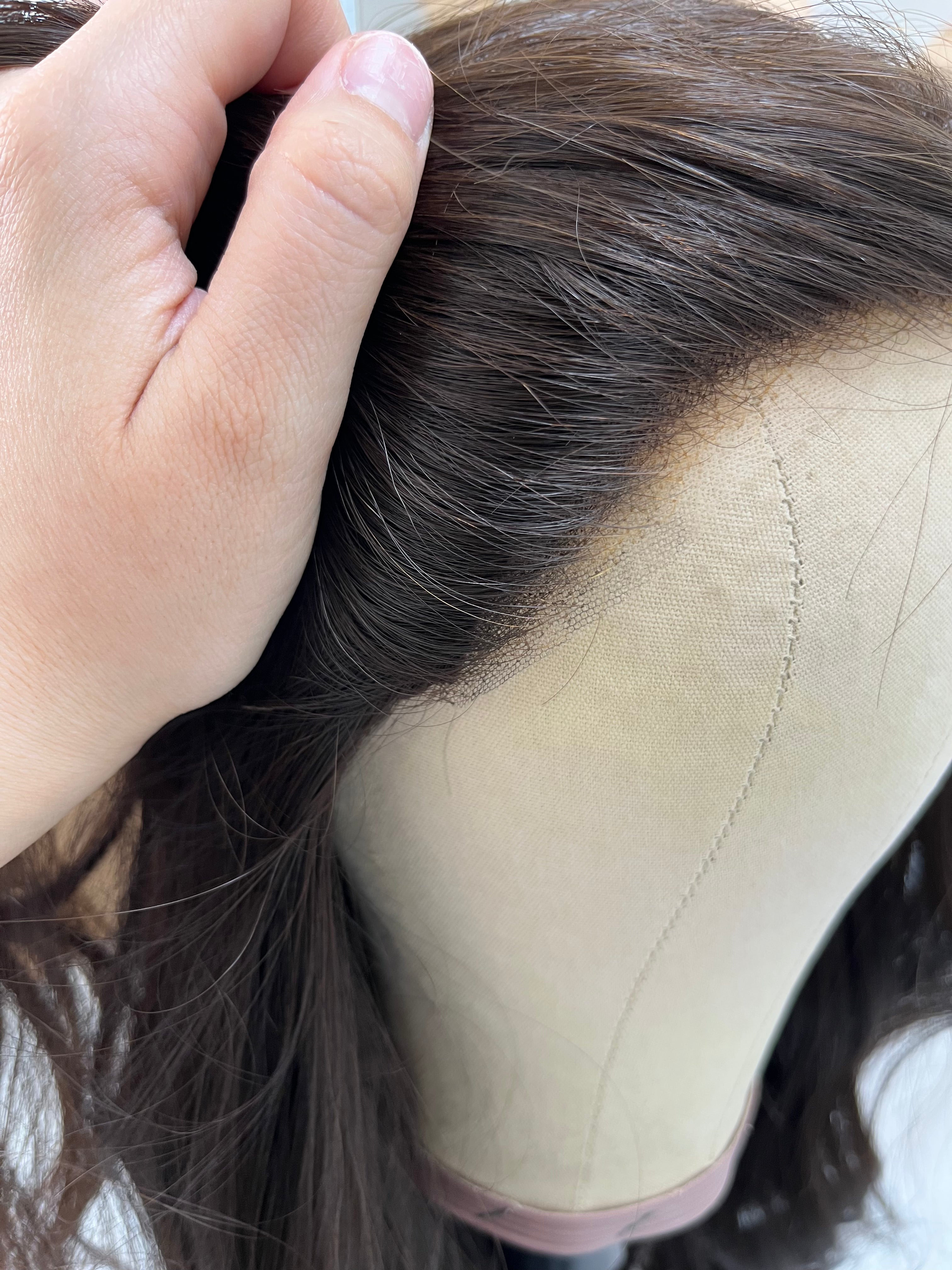 Other: High density. Lace is cut close with a bit of room to further customize. Knots are bleached and lightly plucked about 1cm near the front of the hairline. The rest of the knots are not bleached. No clips or comb. Raquel from Highline trimmed this piece.