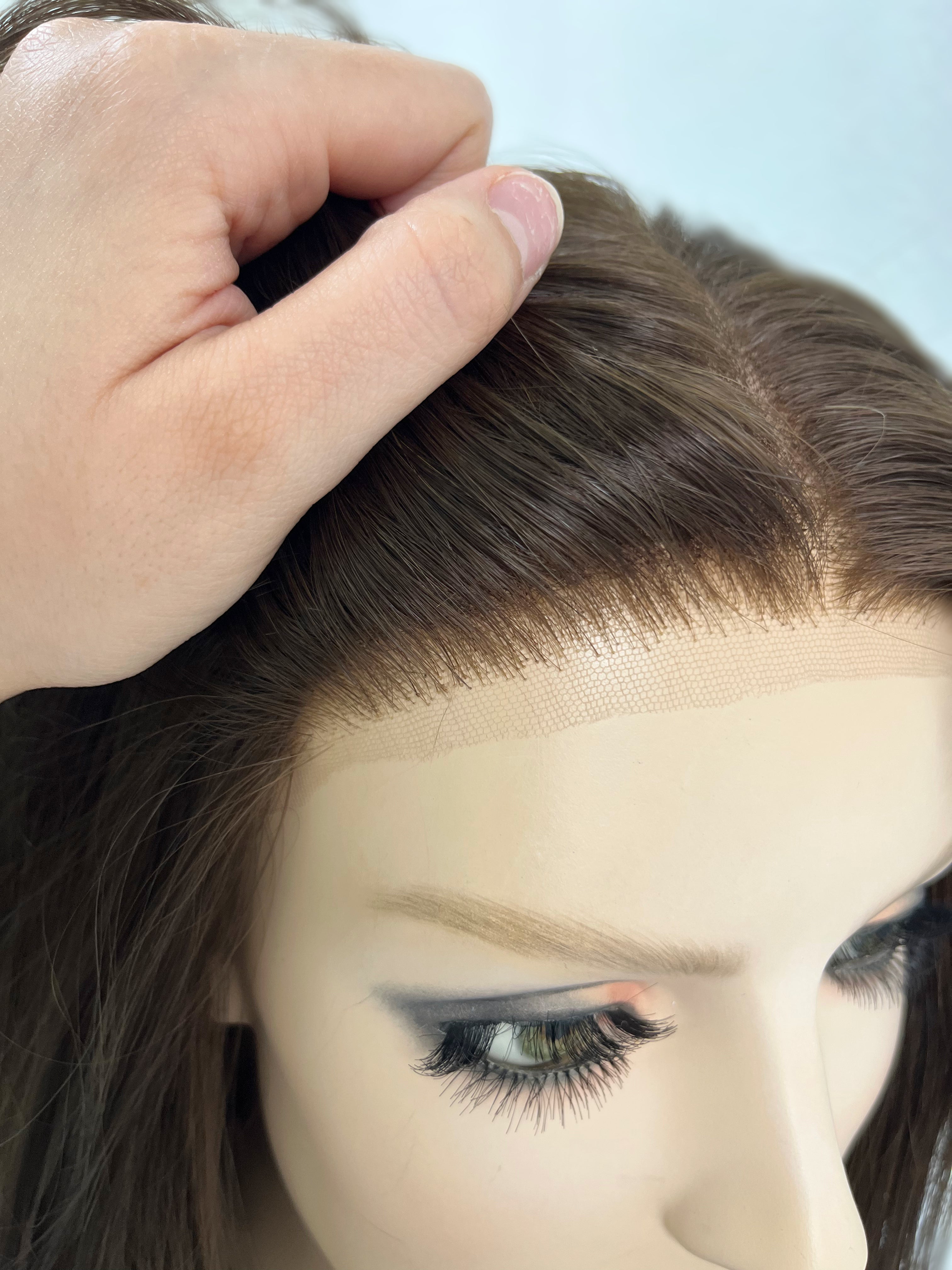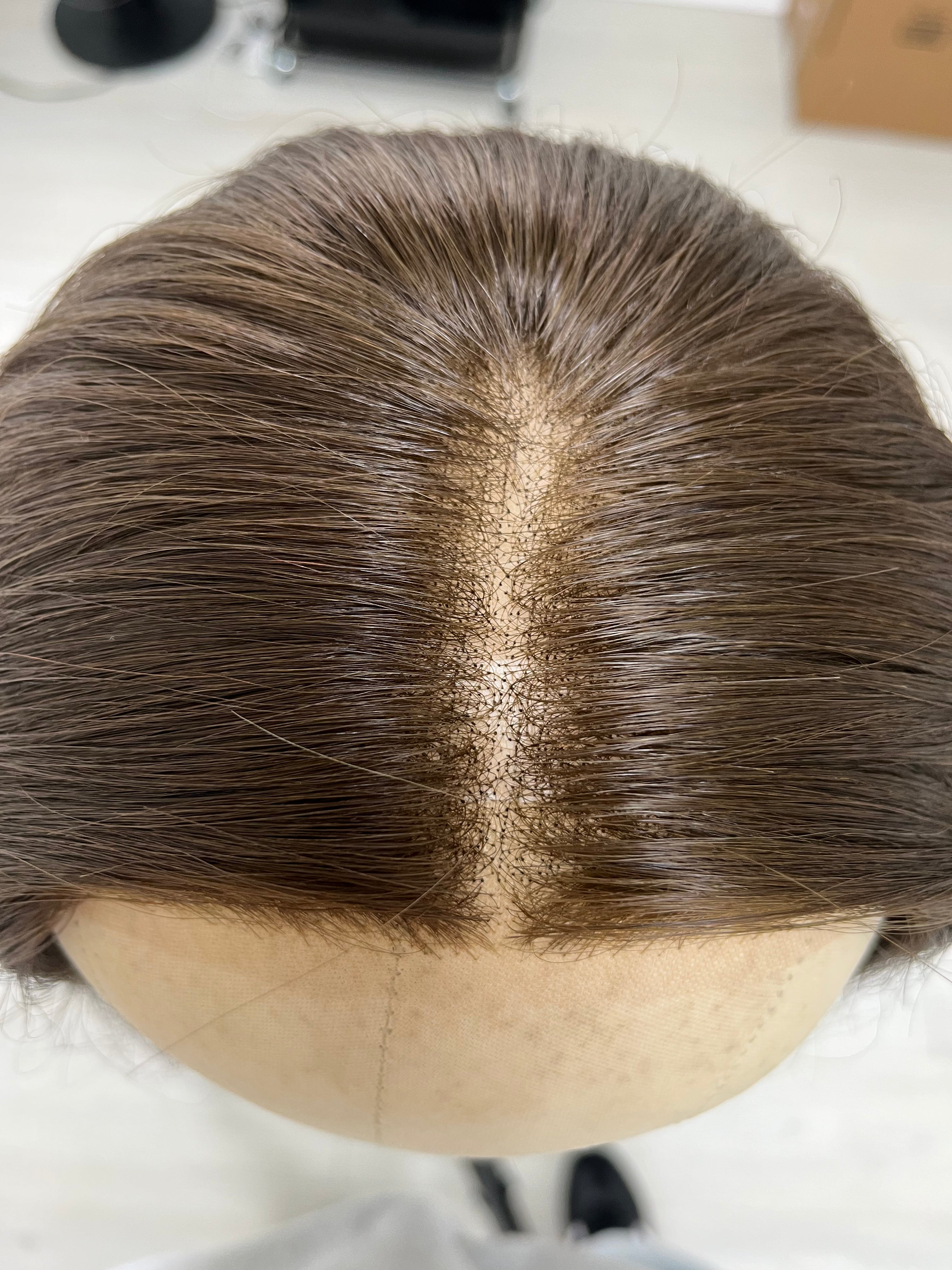 First impressions/thoughts: This is a great, brand new find! There is a bit of knot fallout throughout the lace top that is not as visible due to the silk lining underneath. This piece has a very natural and realistic hairline. Overall, this piece is in great condition.