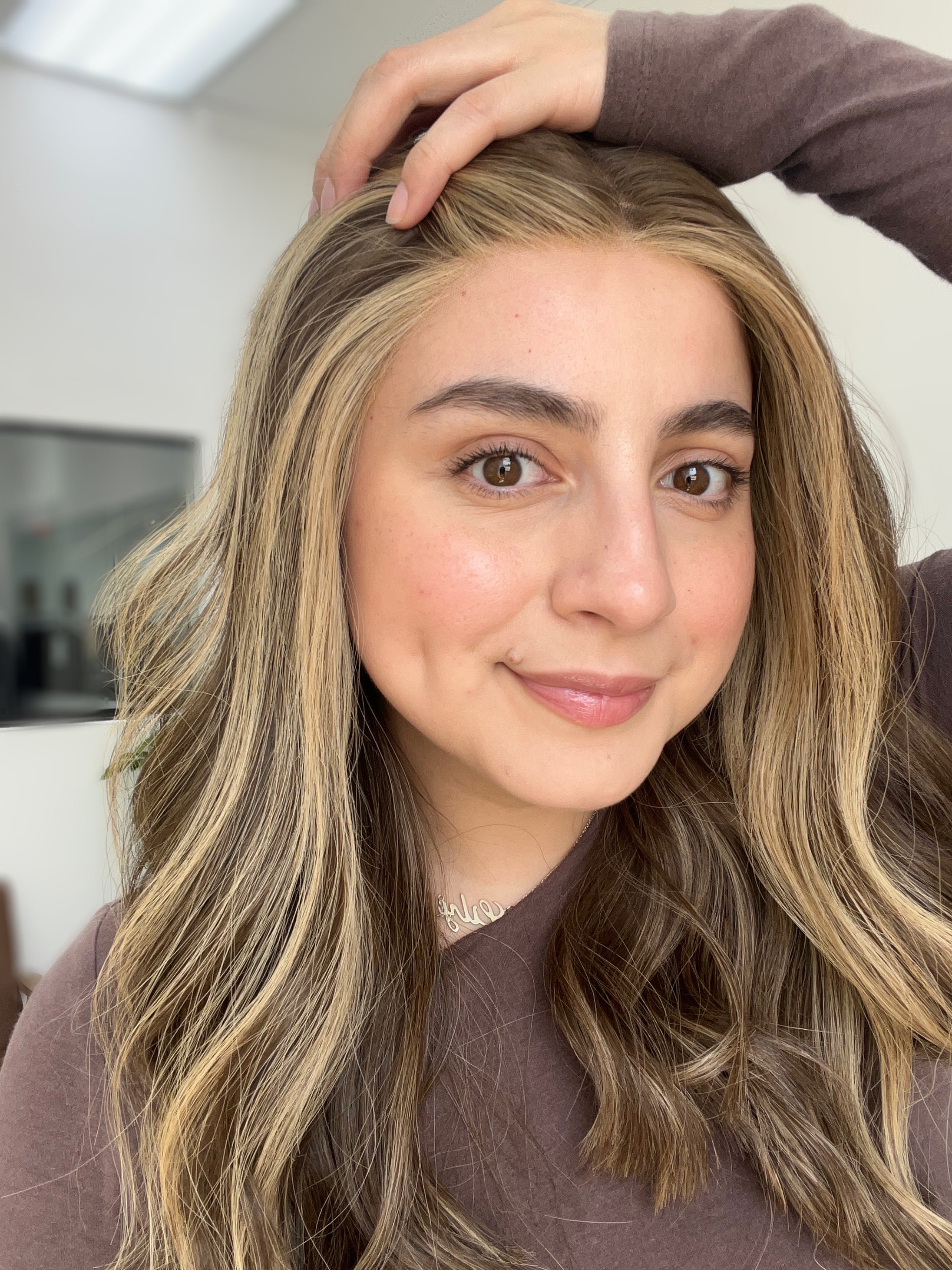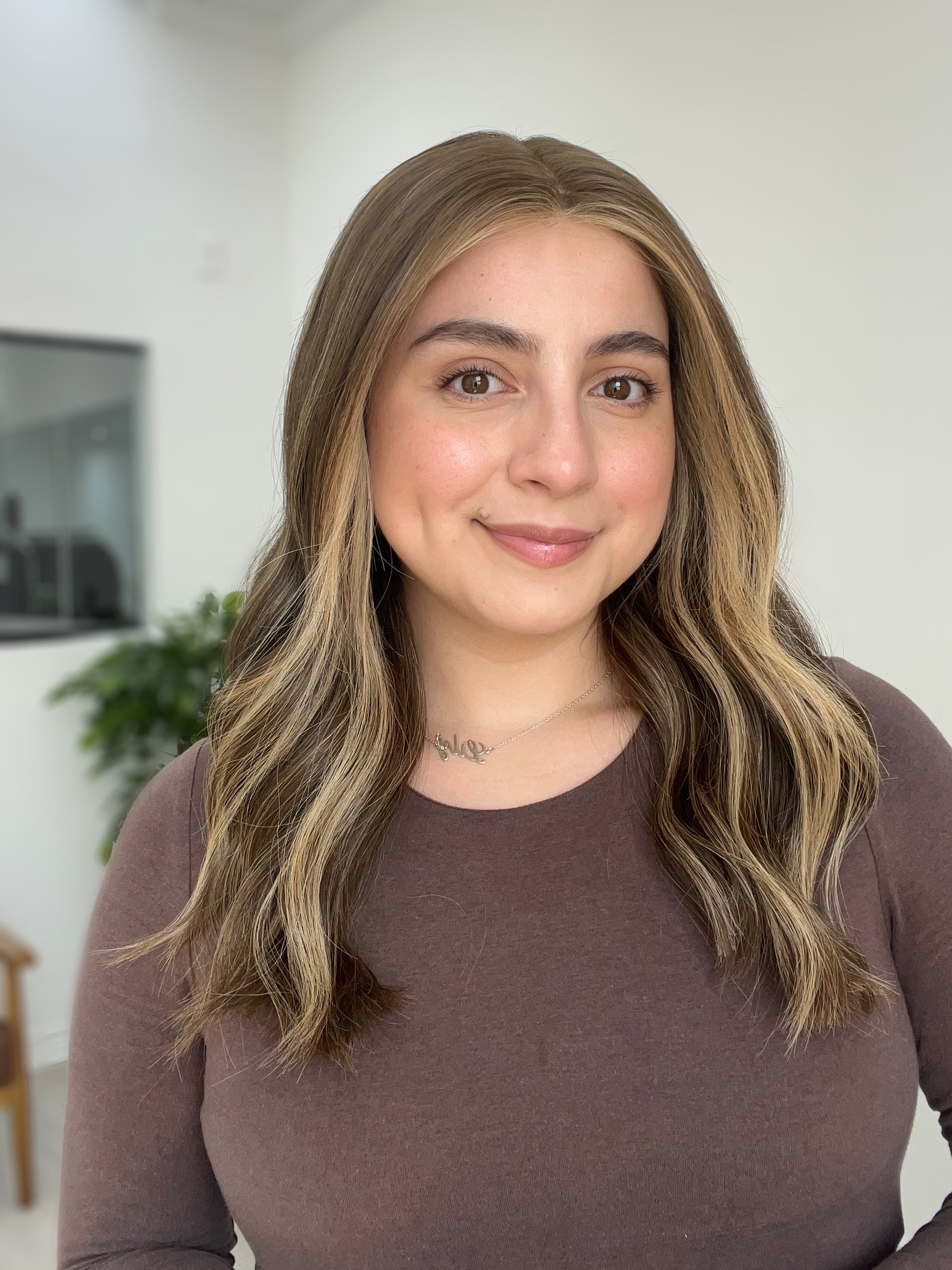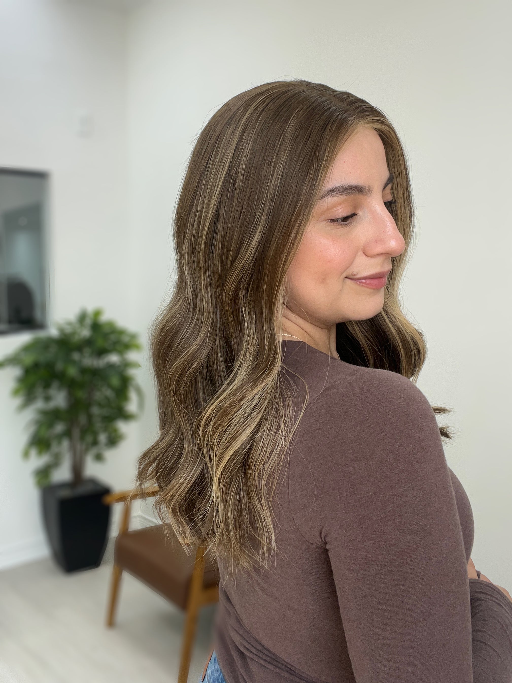Color: Neutral to cool brown base with blonde highlights and brighter face framing/money pieces