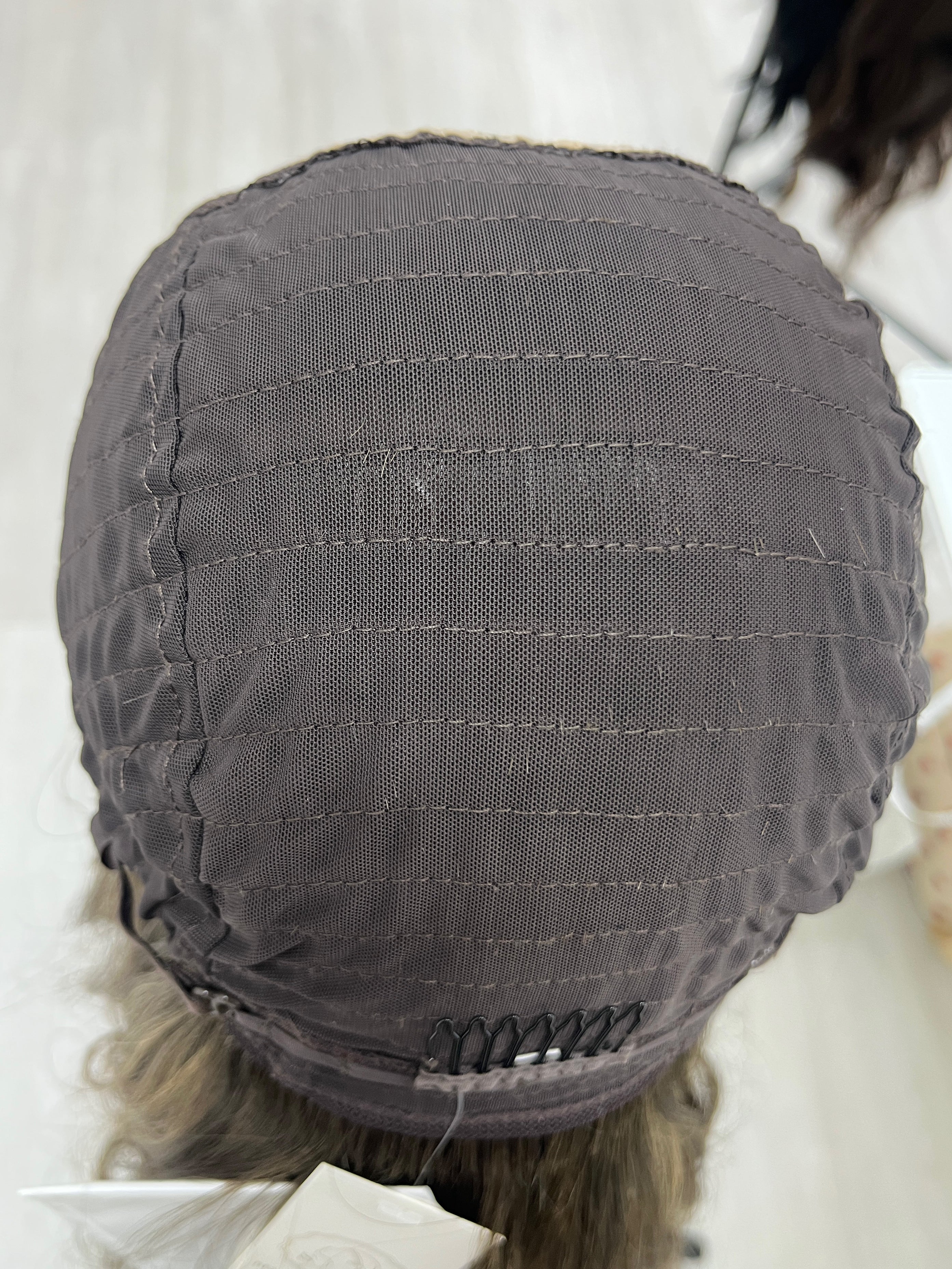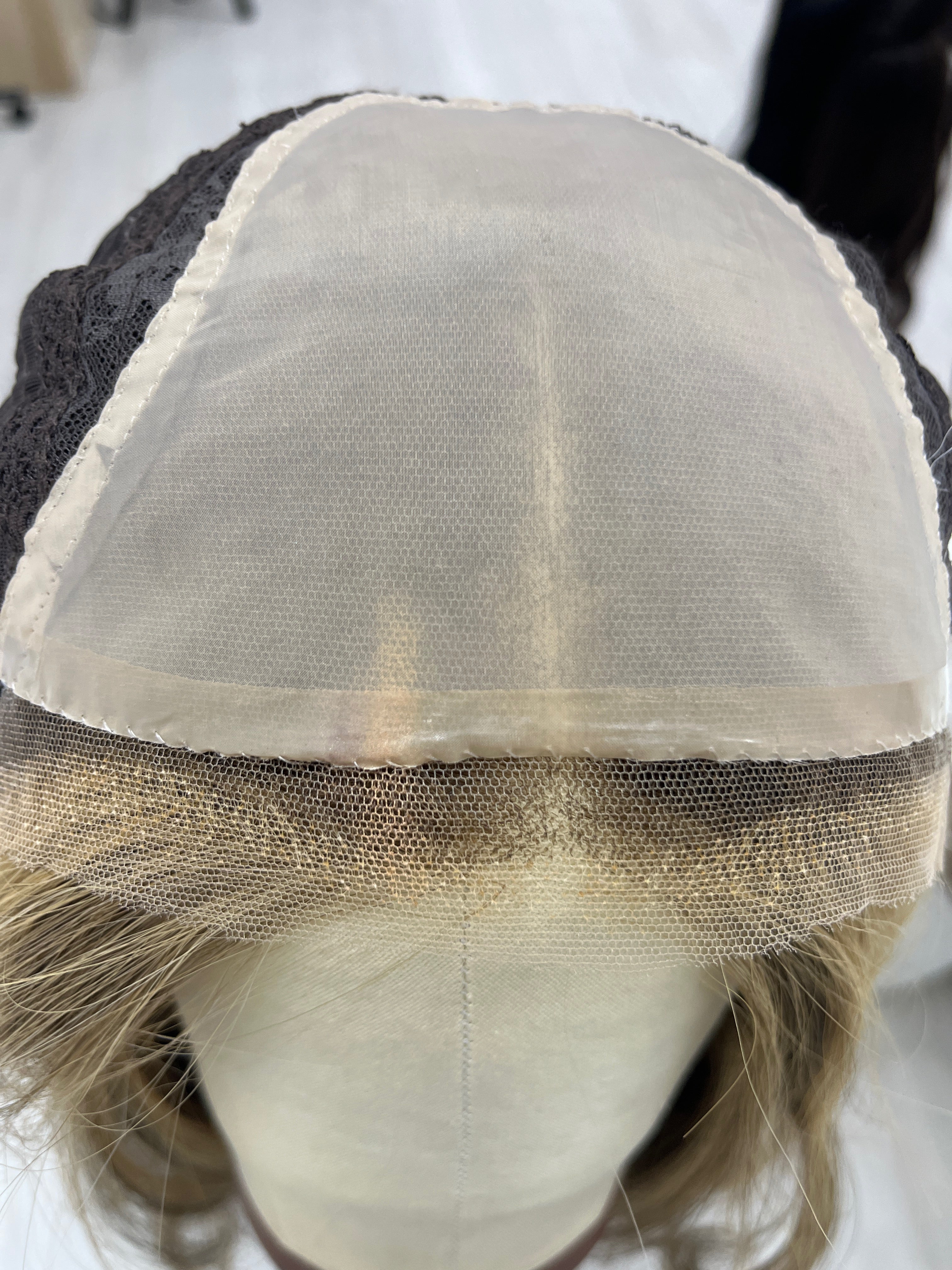 Other: Medium density (about 125%). Lace is cut with room to customize in a jagged method with a bit of fraying. Note: the lace is cut closer in near the ear tabs. Knots are naturally light due to the blonde face framing pieces near the front of the hairline. The rest of the knots are not bleached. There is some makeup/concealer stainining near the front of the hairline that is visible in that area. There is a small stain inside the cap that is not visible. The brand label has come off, however it is included separately with this piece.