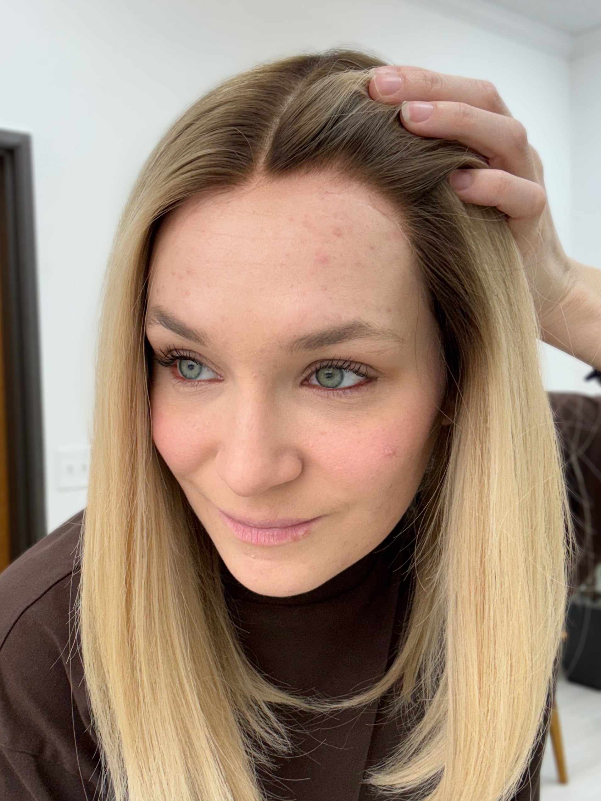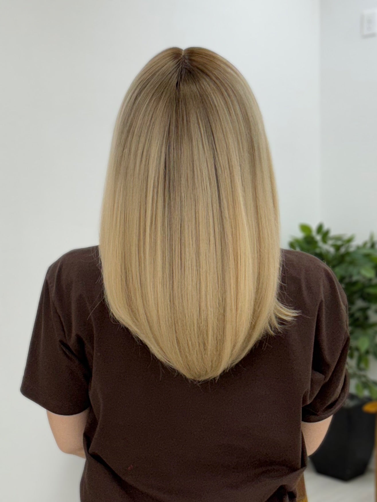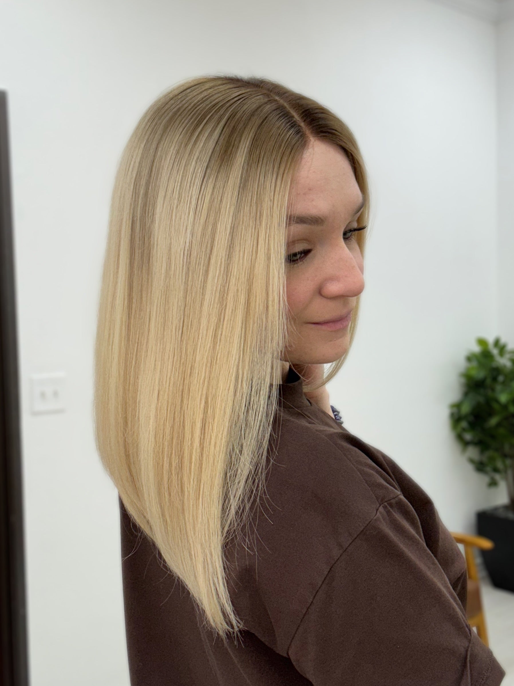 Color: Darker neutral brown root into an ashy light beige blonde with khaki blonde tones and face framing