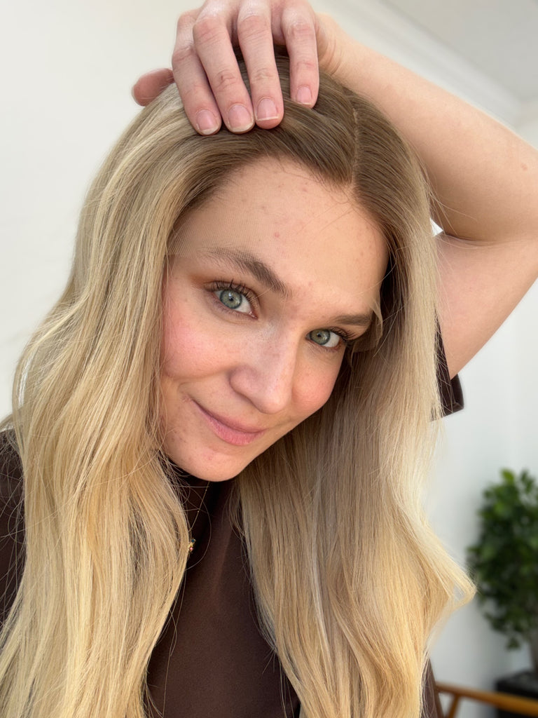 Faye is a lighter beige blonde compared to our Alison color. Think of her as a more lived in platinum blonde.