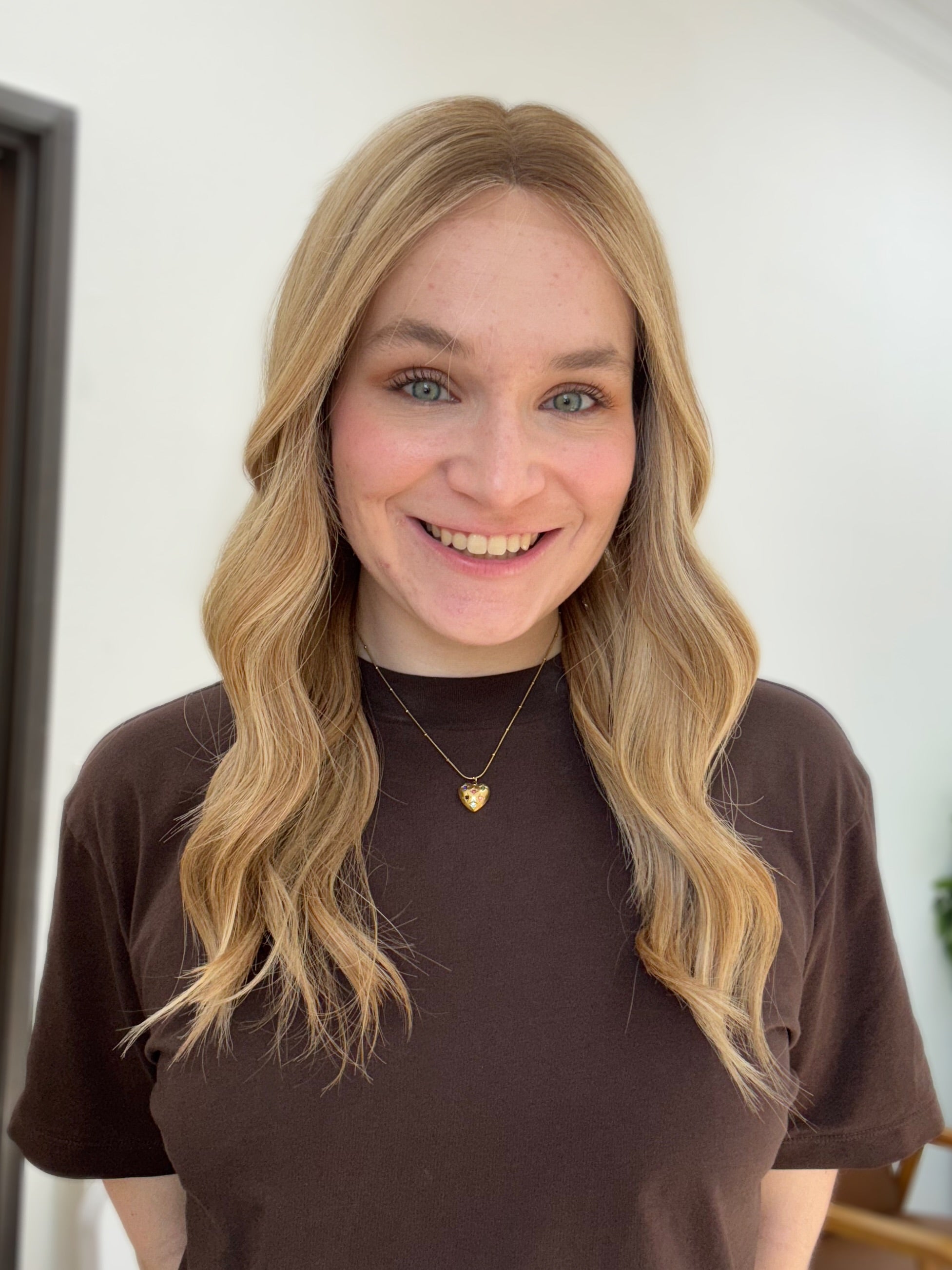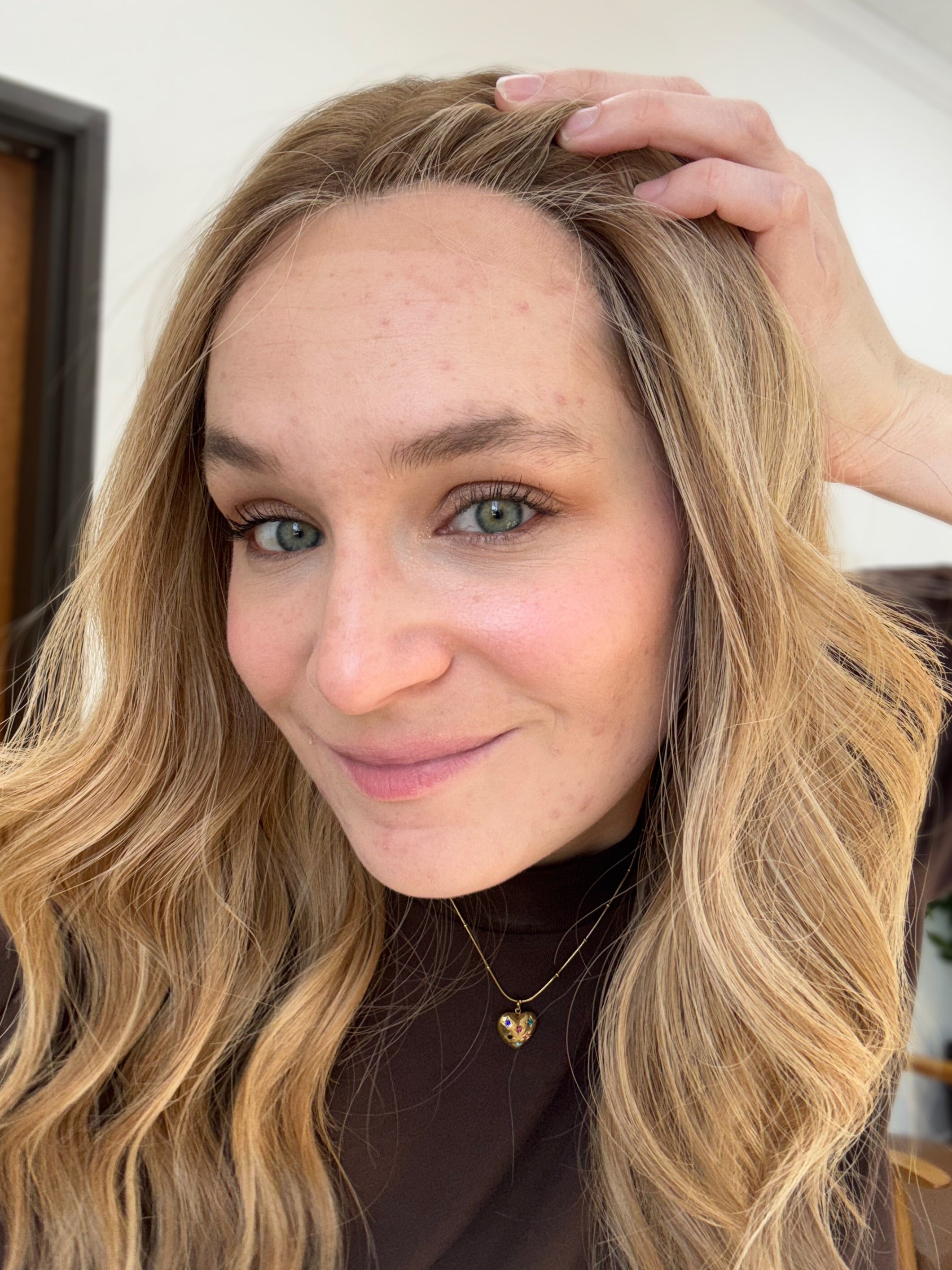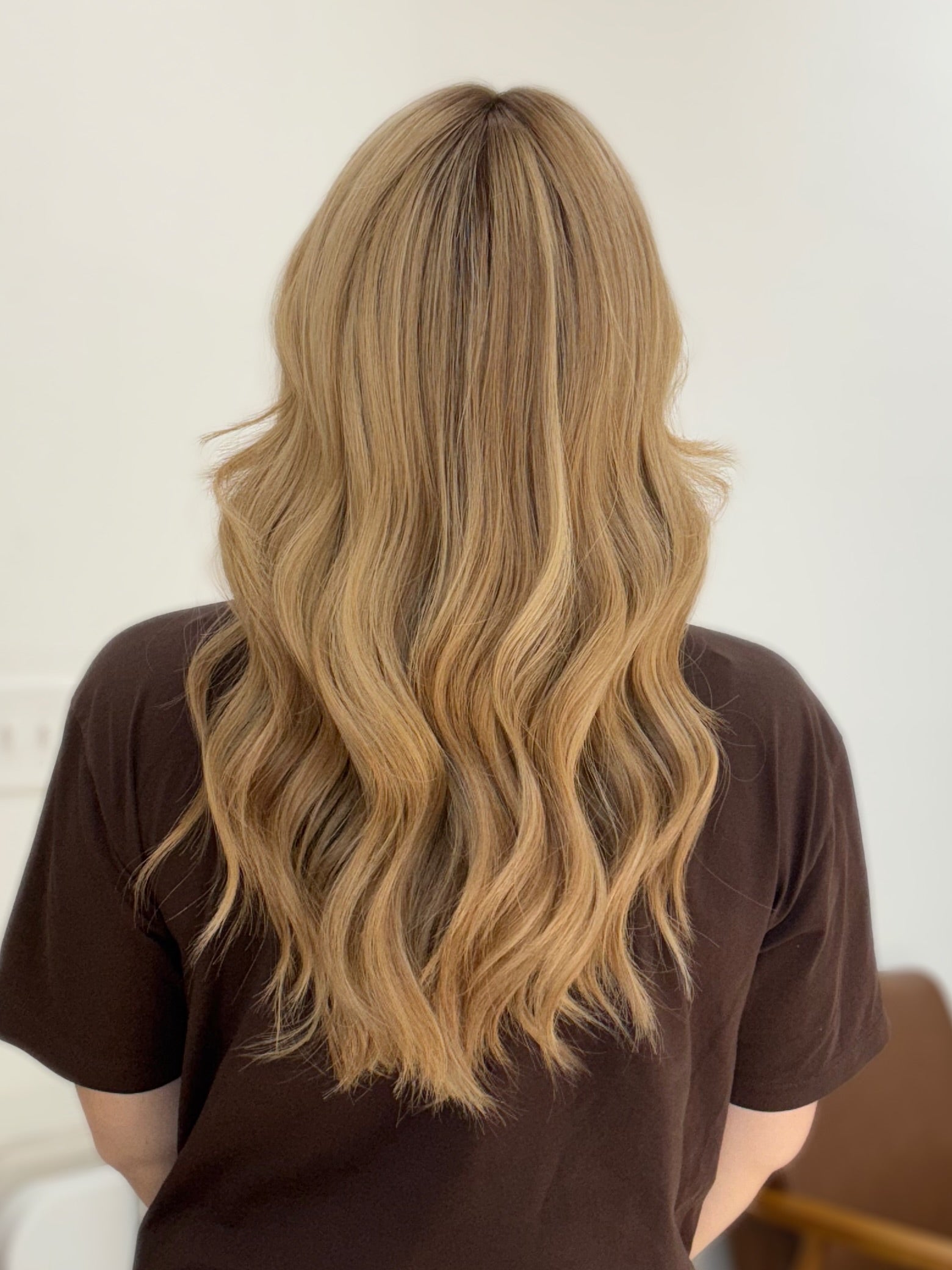 Color: Warm dimensional blonde with a subtle root, about a level 8