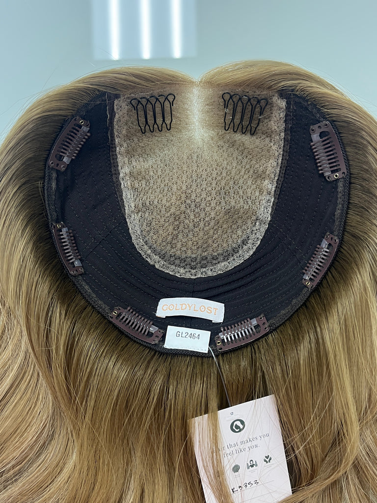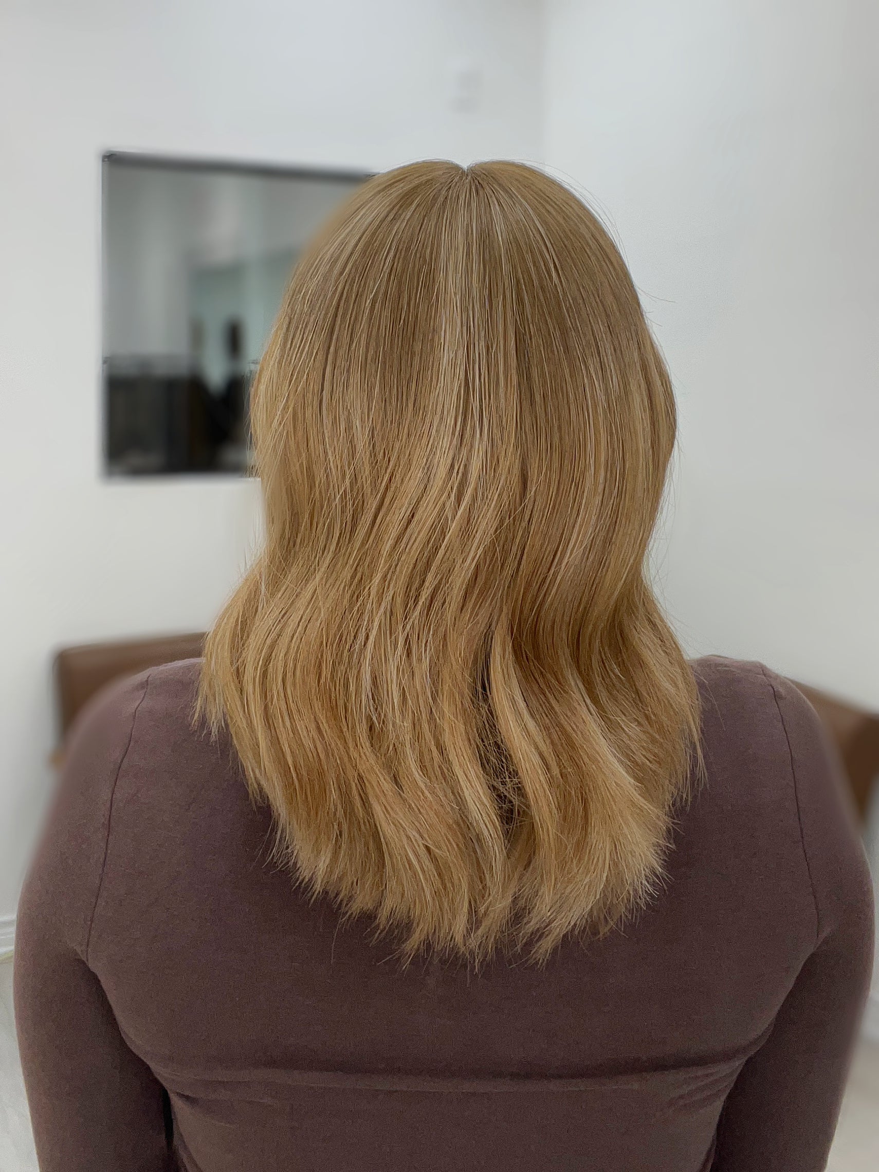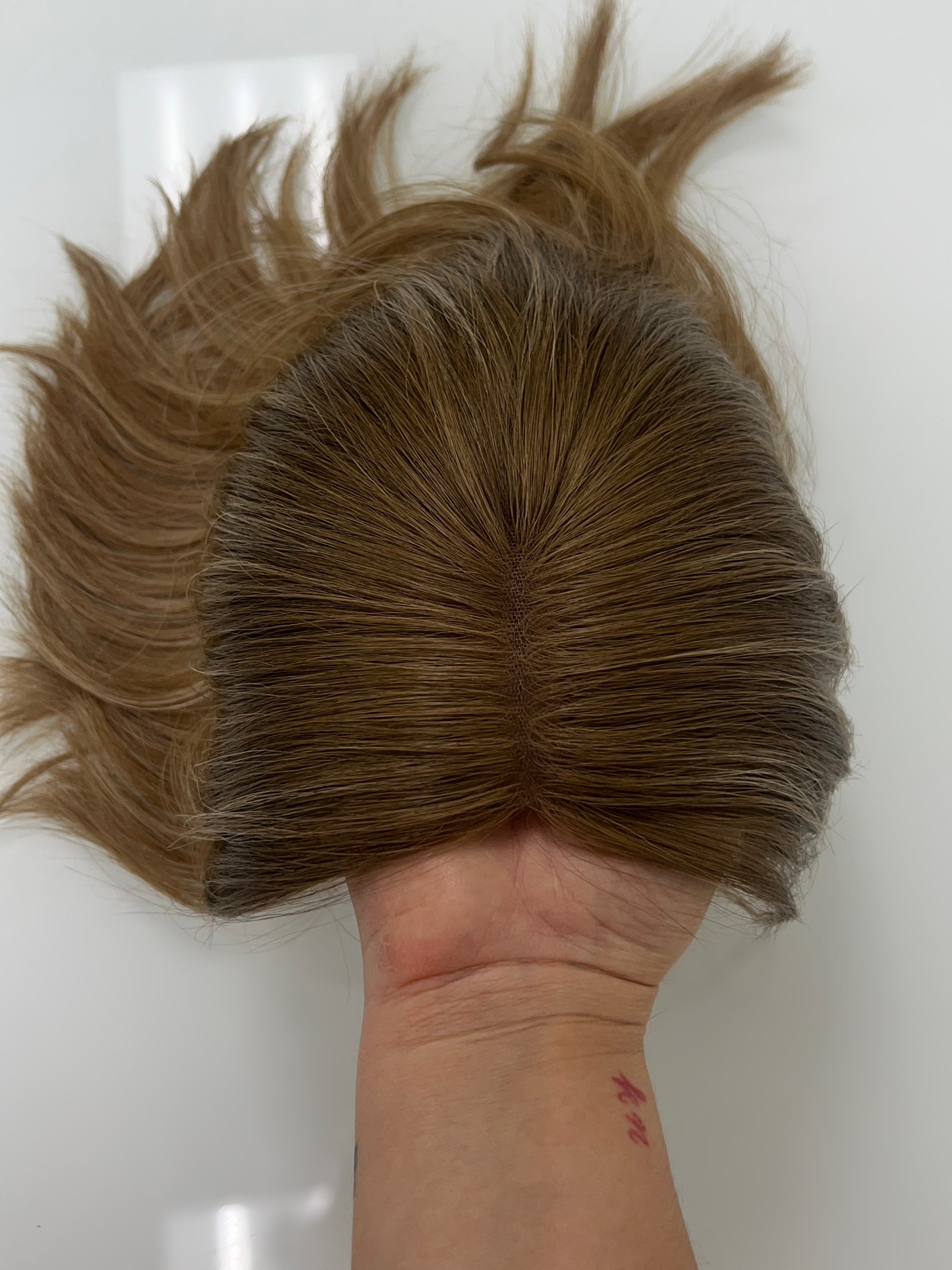 This piece captures the look of a soft, golden blonde with creamy dimension and a natural finish. Bright without being harsh and in great condition. With closed lace toppers, you are meant to blend with your hair. An ideal option for those looking for an extremely flat, realistic lay and density.