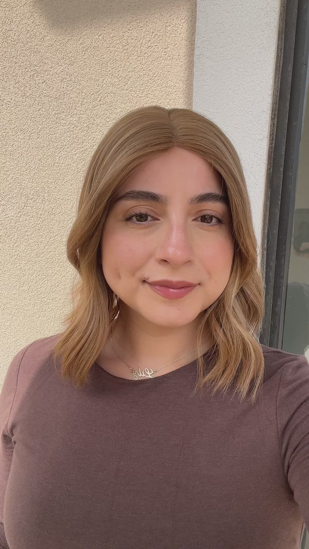 Color: Dark medium golden blonde base with a slightly darker root and ashy to neutral light blonde highlights and creamy blonde lowlights