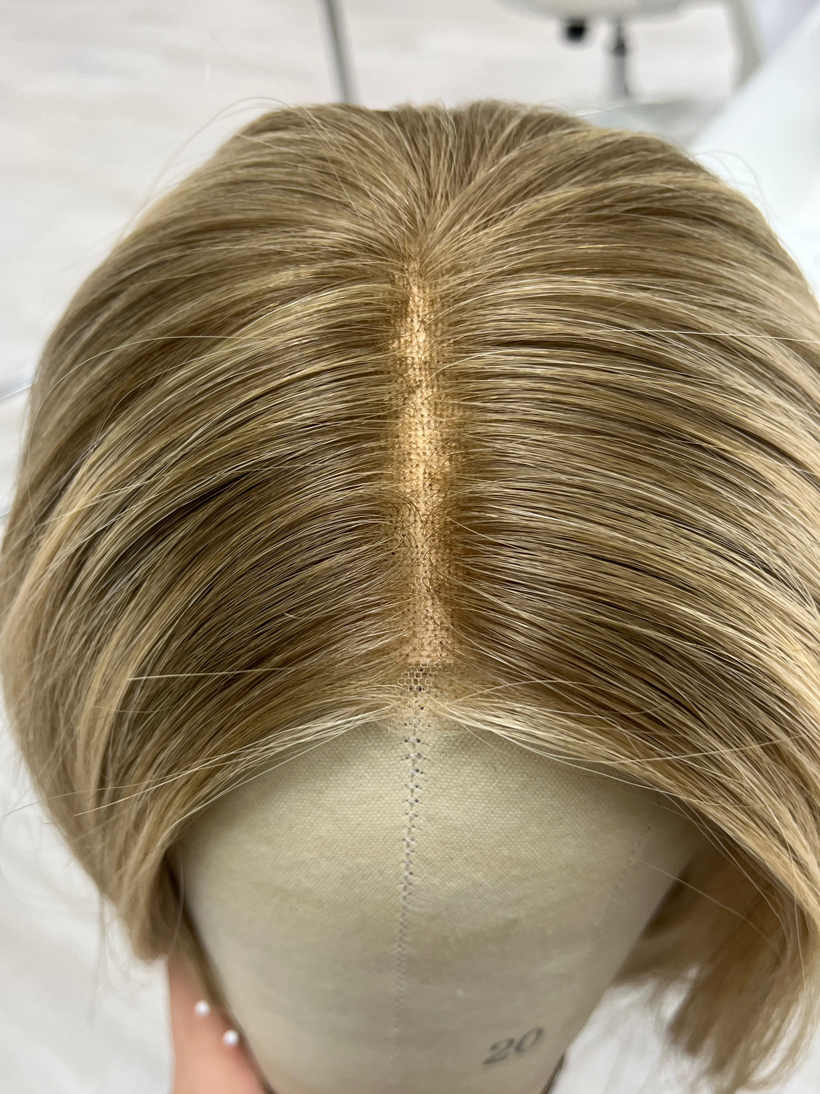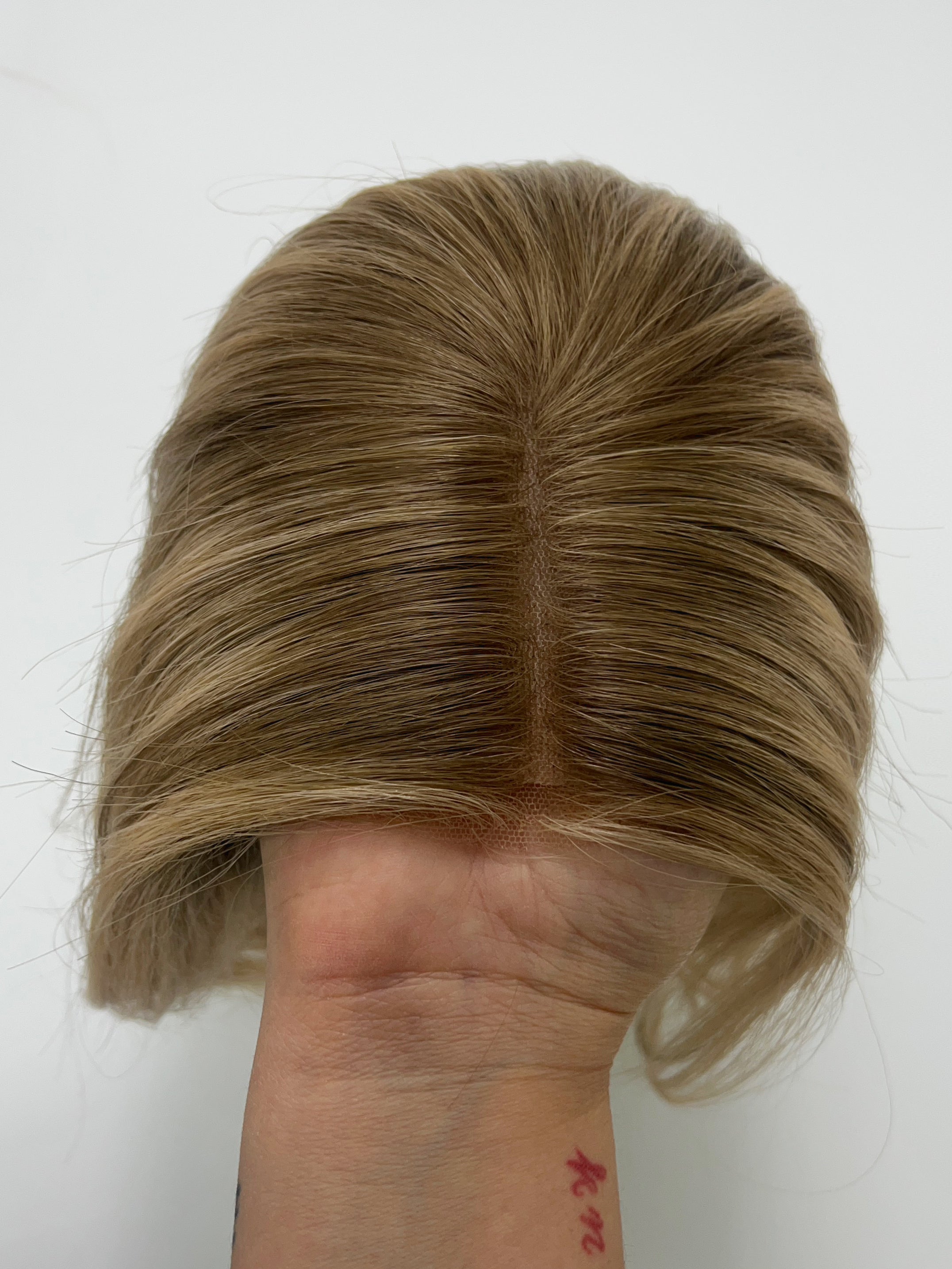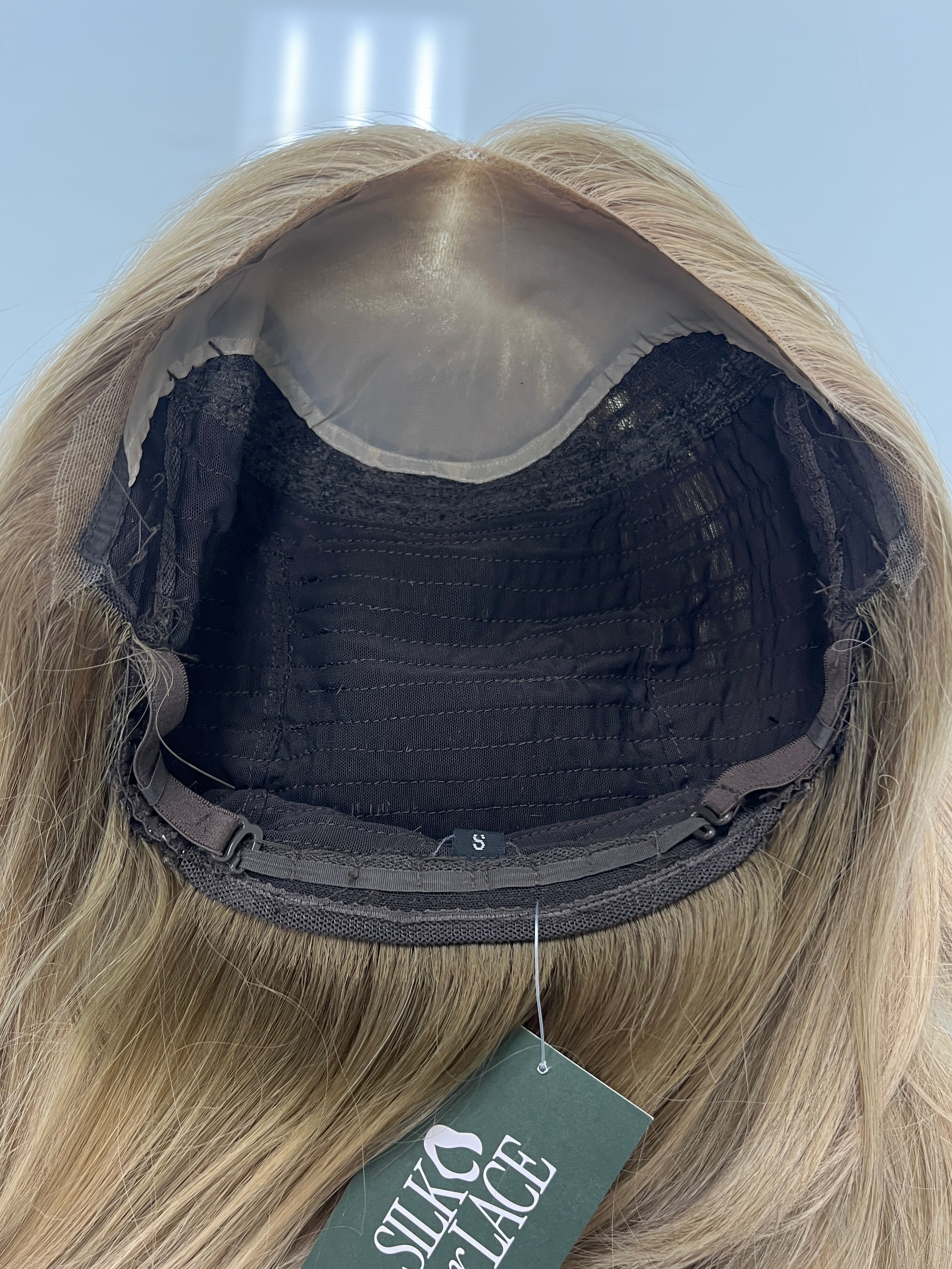 This is a gorgeous butterscotch blonde lace top wig from Goldylost. It has a silk liner inside that adds a nice protection layer on the lace and it also creates a scalp-like illusion for a natural, realistic look overall. A great option if you're looking for a blonde bob wig for hair loss or hair thinning coverage that is light in density and feels comfortable overall!