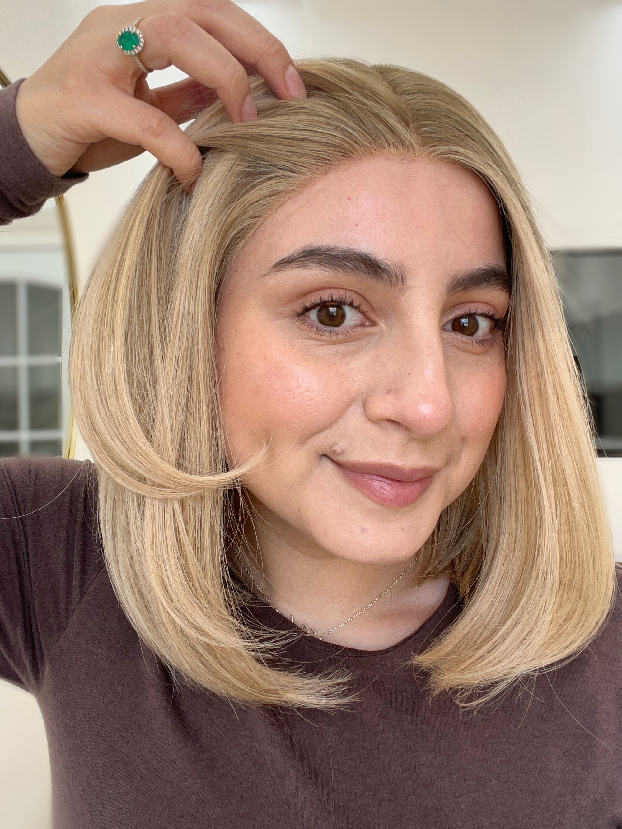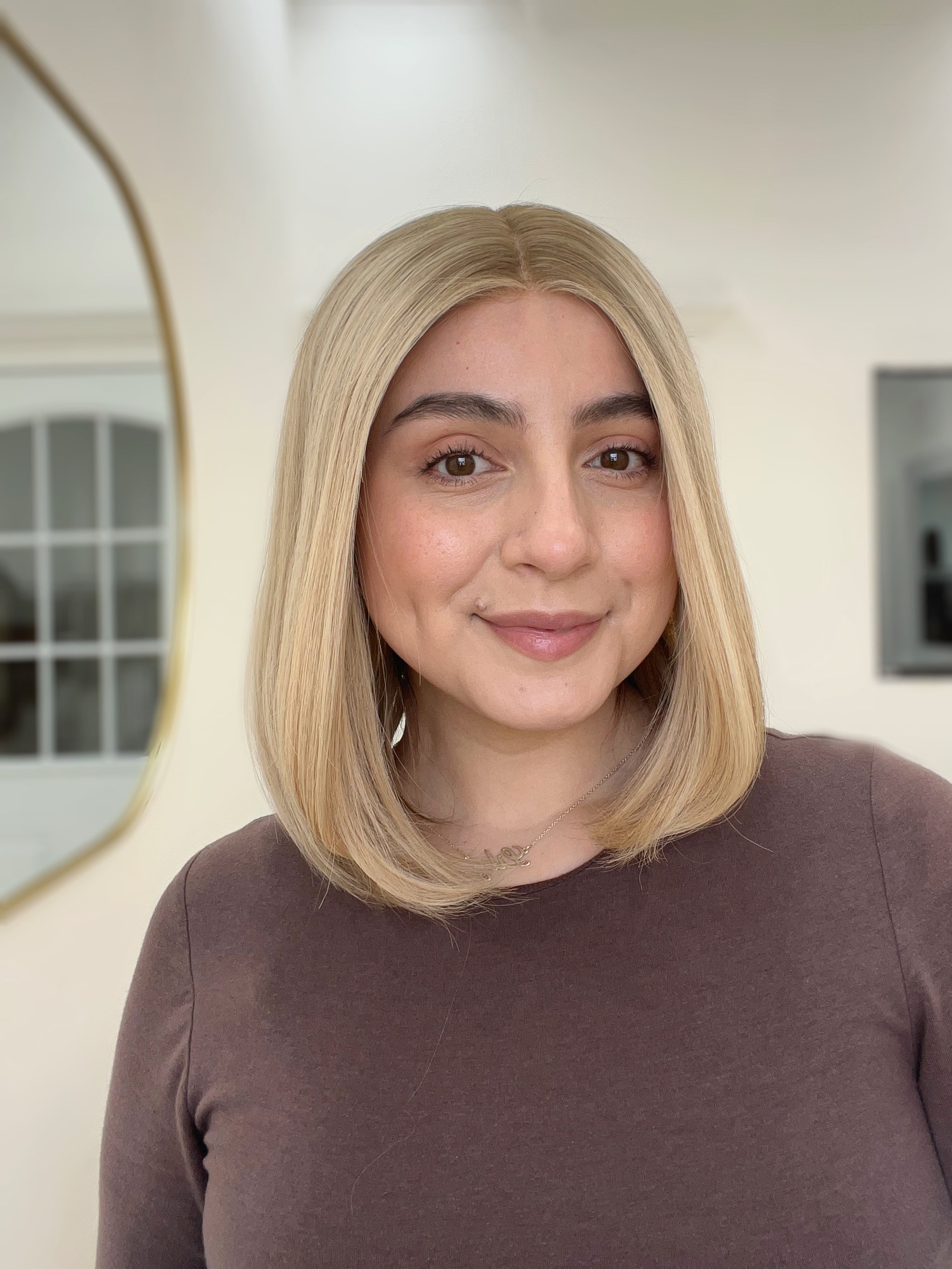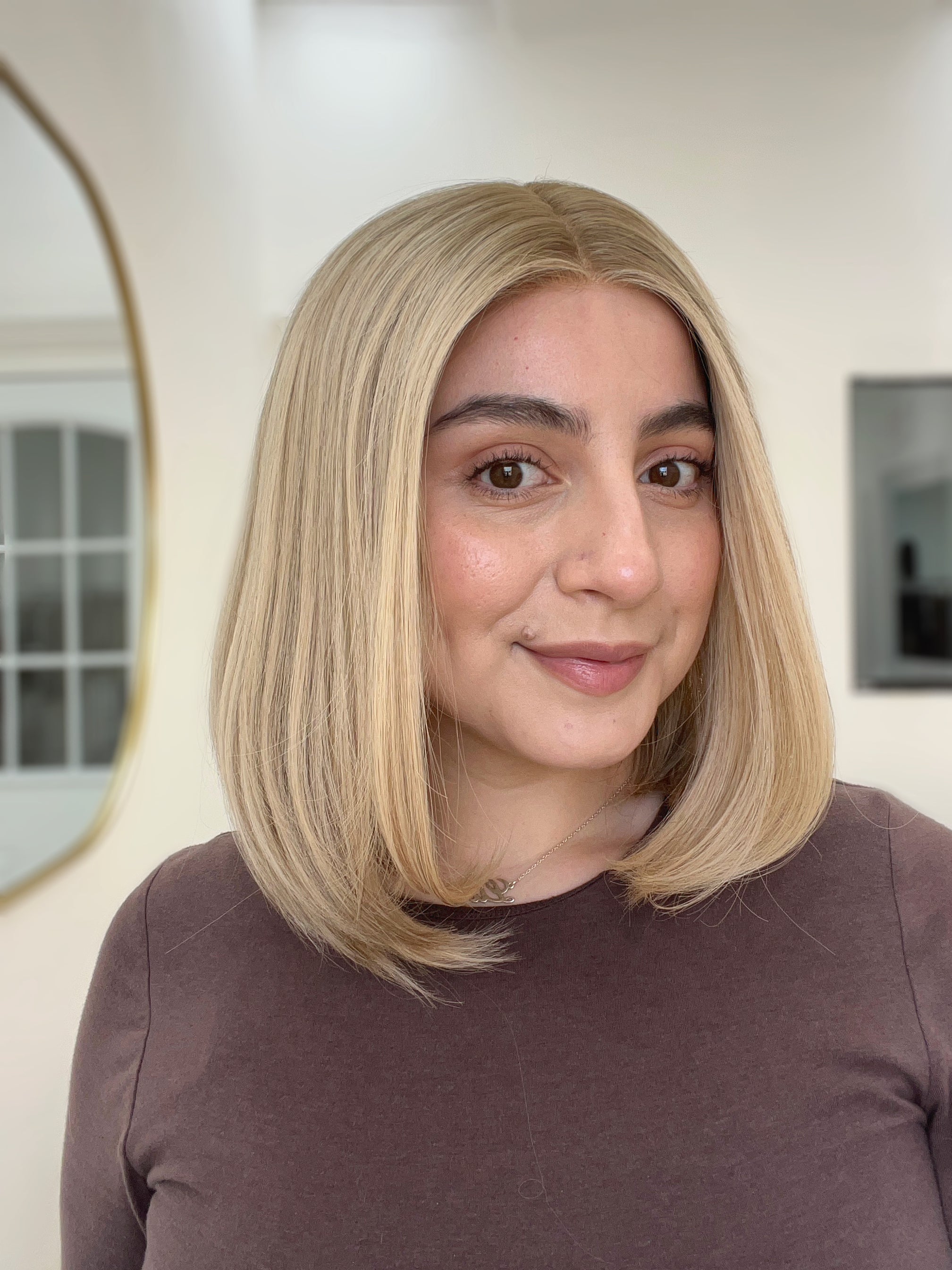 This is a gorgeous butterscotch blonde lace top wig from Goldylost. It has a silk liner inside that adds a nice protection layer on the lace and it also creates a scalp-like illusion for a natural, realistic look overall. A great option if you're looking for a blonde bob wig for hair loss or hair thinning coverage that is light in density and feels comfortable overall!