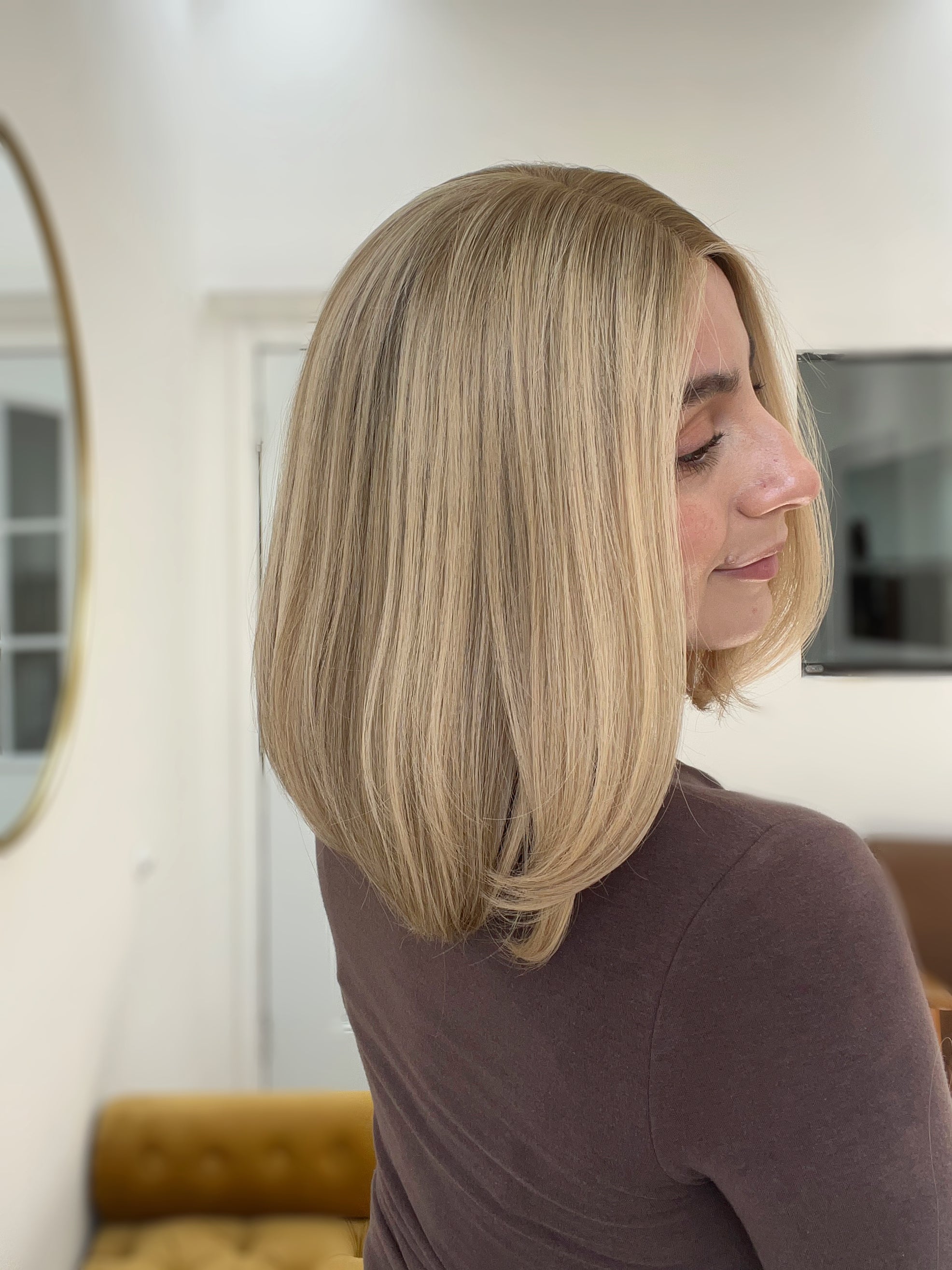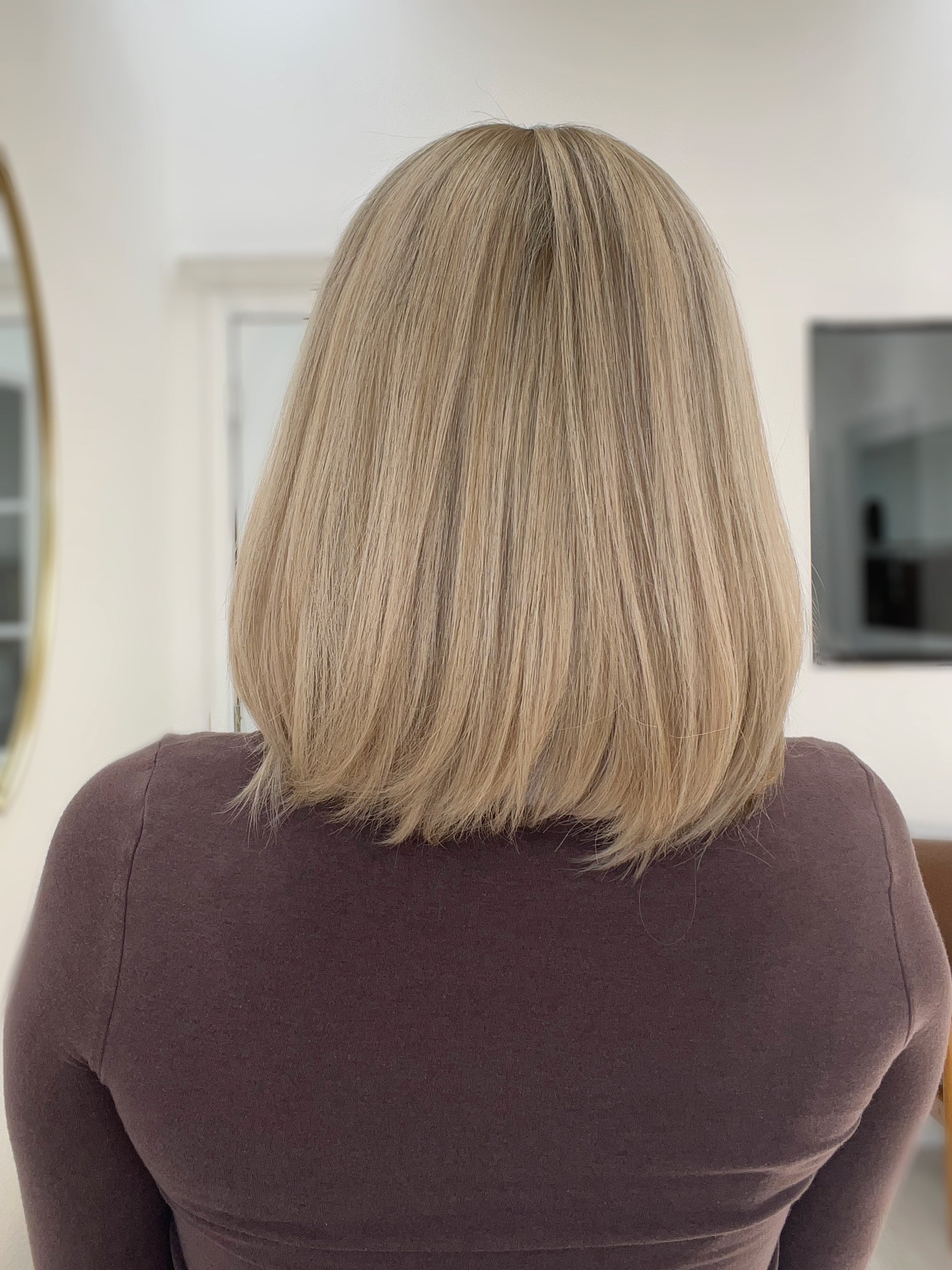 Color: Dark neutral blonde root into a brighter butterscotch blonde with neutral tones throughout