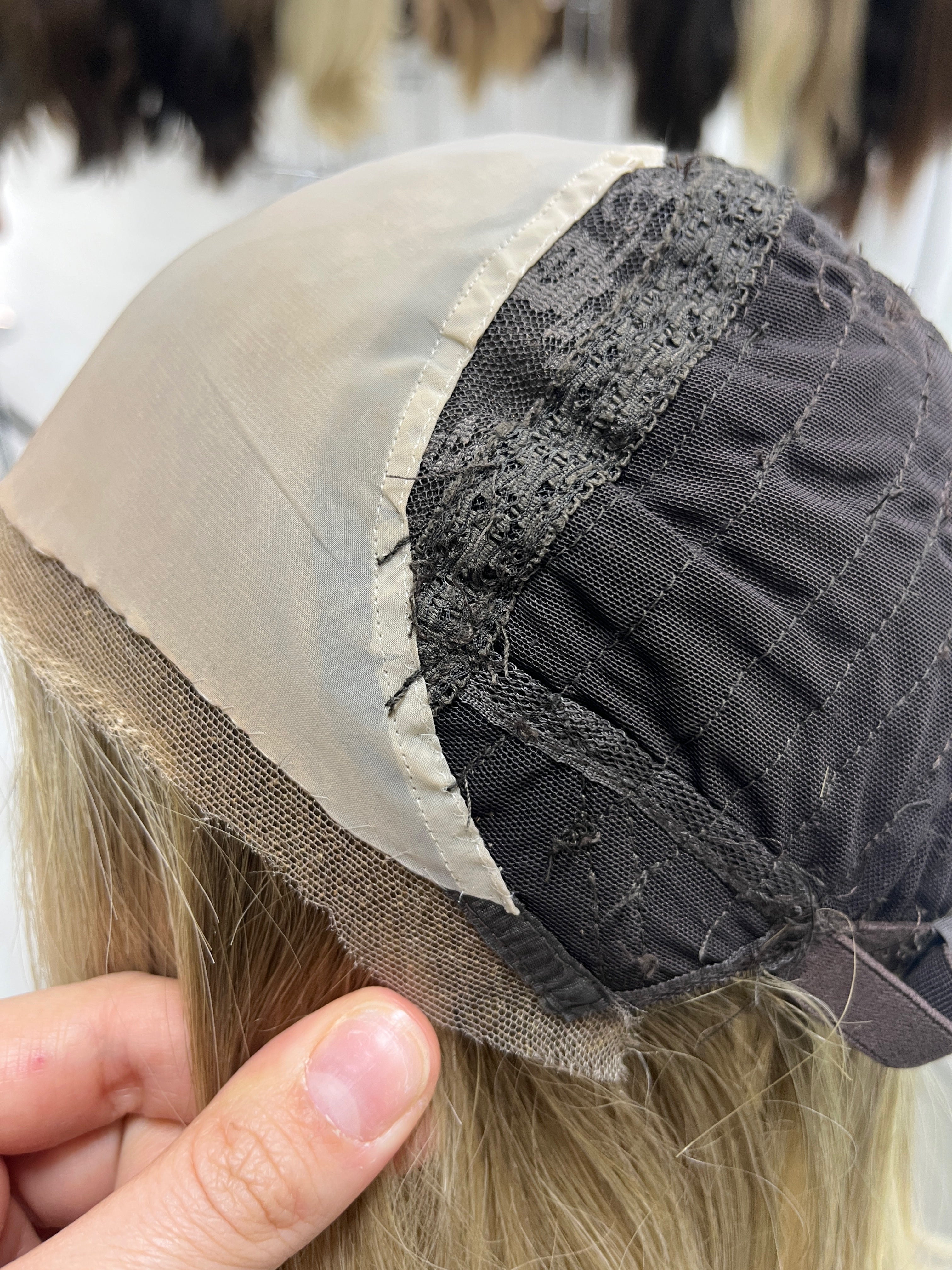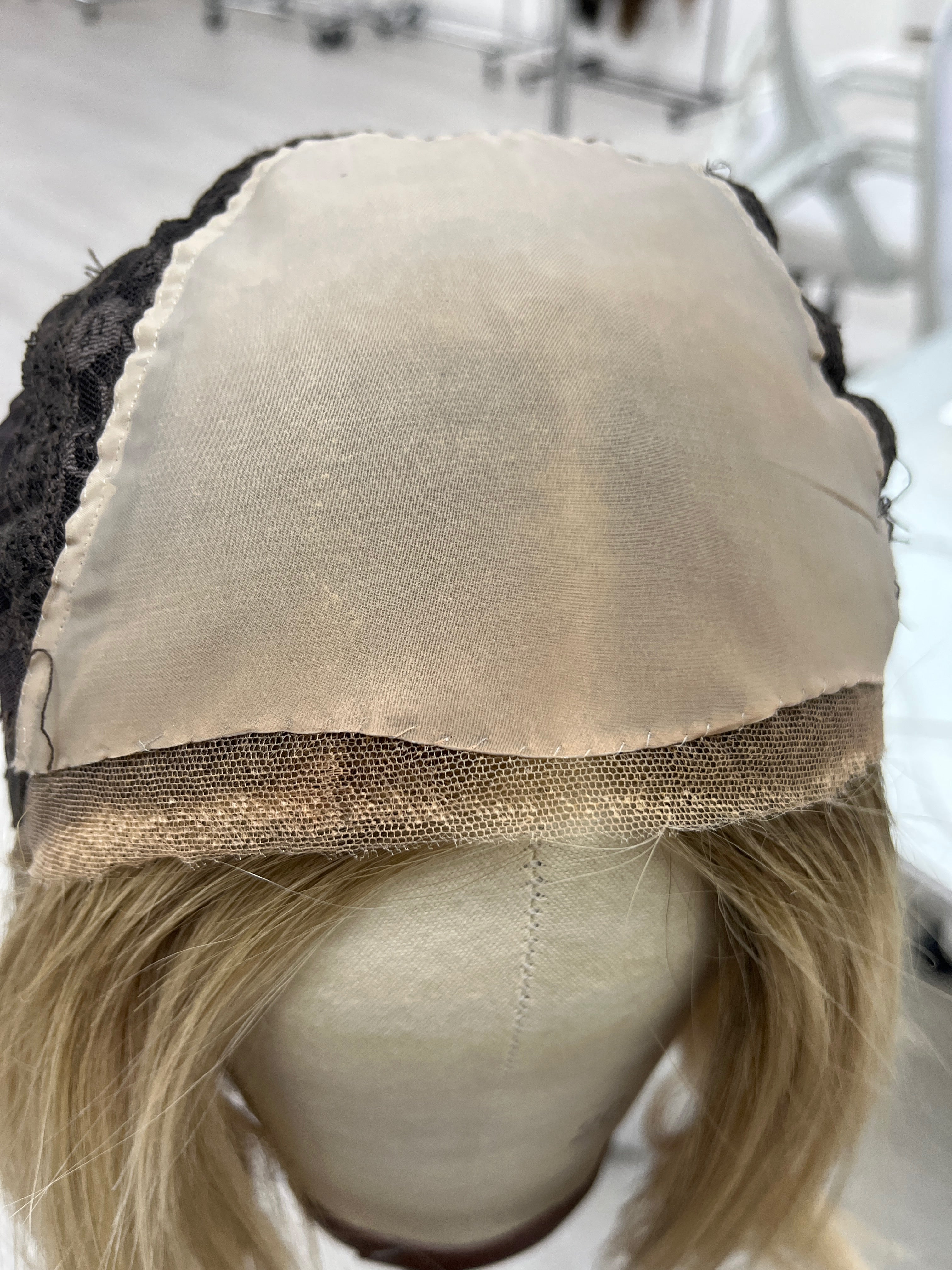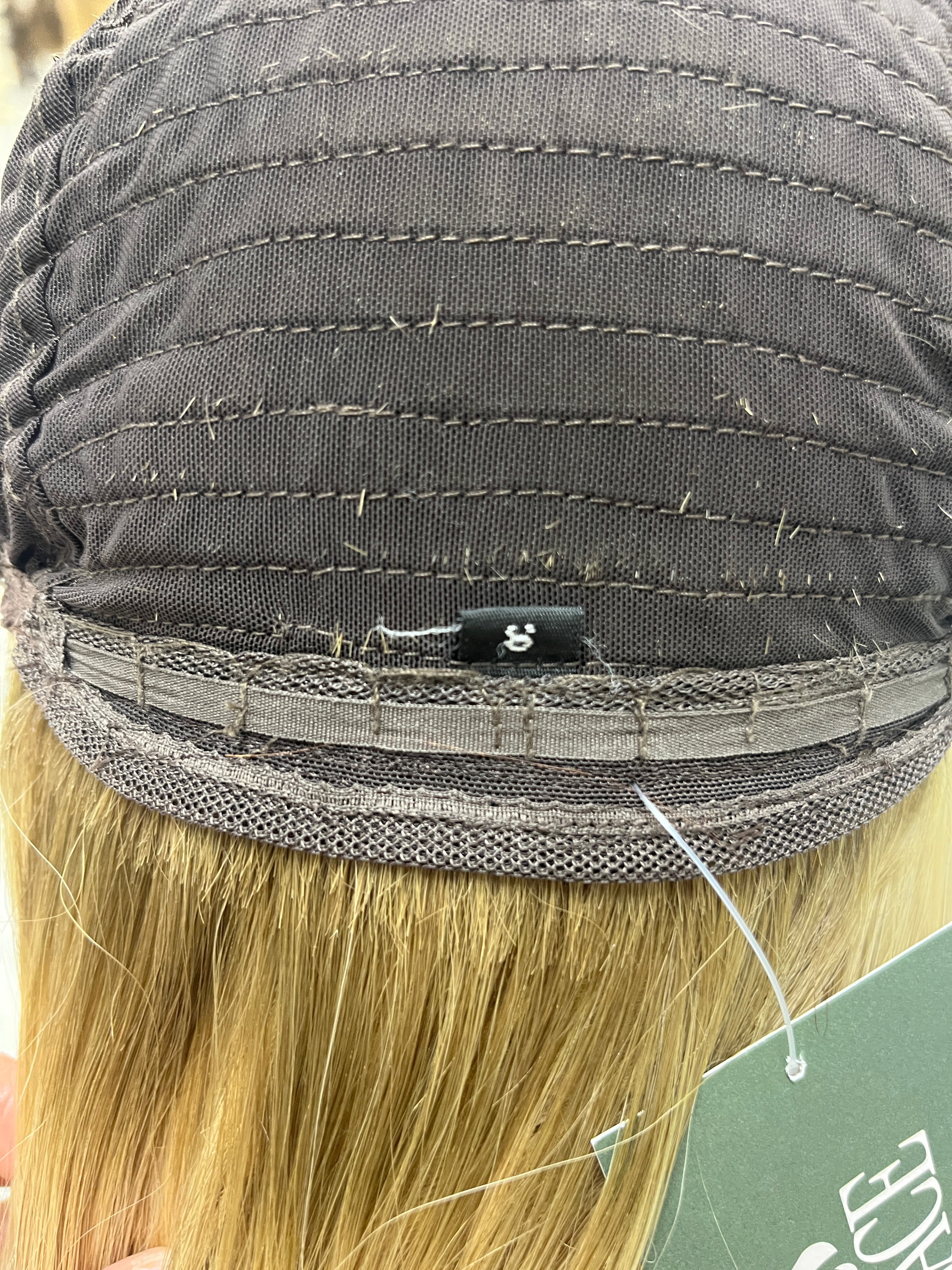 Other: Light to light medium density (about 115-120%). Lace is cut very close to the hairline with a bit of fraying. The knots are naturally lighter near the front of the hairline due to the color/face framing about 1 cm in. The rest of the knots are not bleached. There is makeup staining on the lace/silk liner that is visible and has an orange tint. The clips have been removed on the ear tabs with some loose thread in those areas. There is loose thread by the size label tag near the nape that does not affect the integrity of the piece.