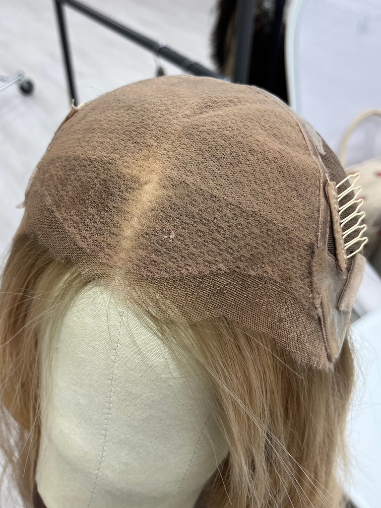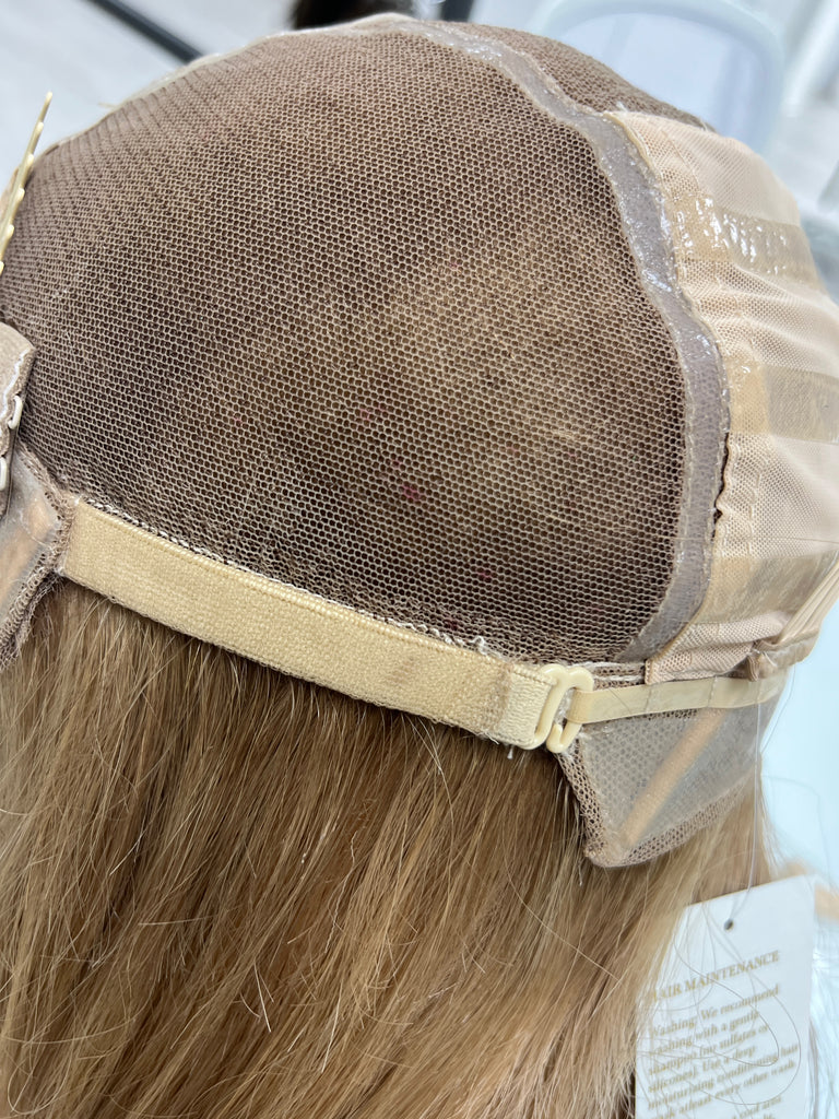 Other: Medium to medium light density (about 120-125%). The lace is cut close to the hairline in a jagged method with a bit of fraying. Knots are bleached and plucked. There is light knot fallout near the front of the hairline on one of the sides that is not very noticeable when wearing. There is makeup staining on the lace that is visible in those areas. Light staining inside the cap that is not visible on the outside. There is a small tear on the cap by one of the ear tabs (see photos for reference). This piece comes with a removable wig strap.
