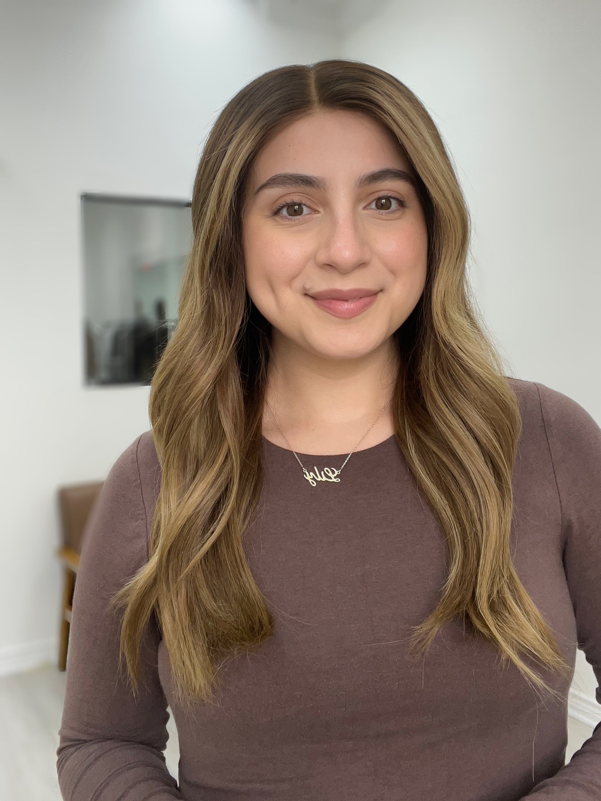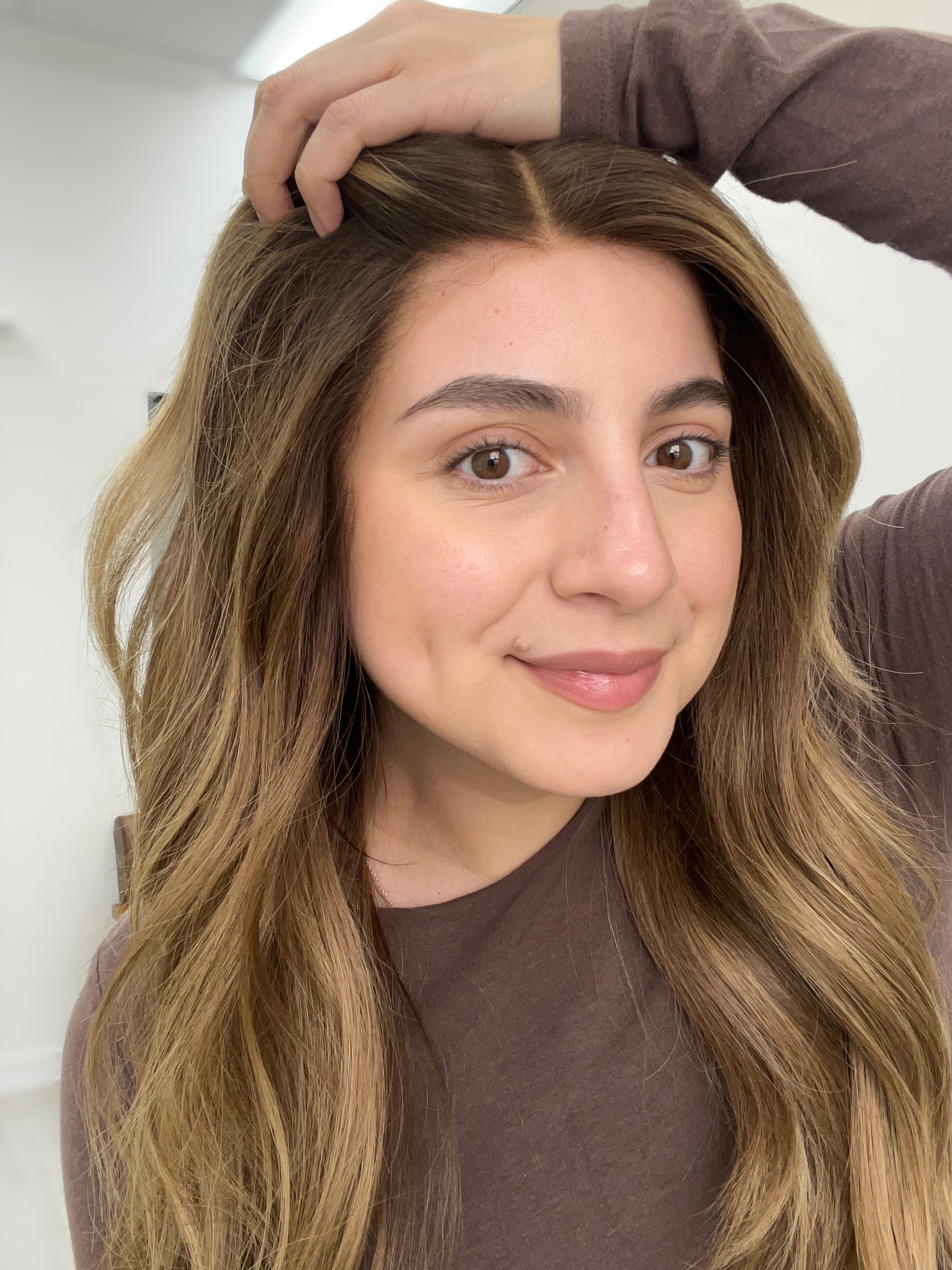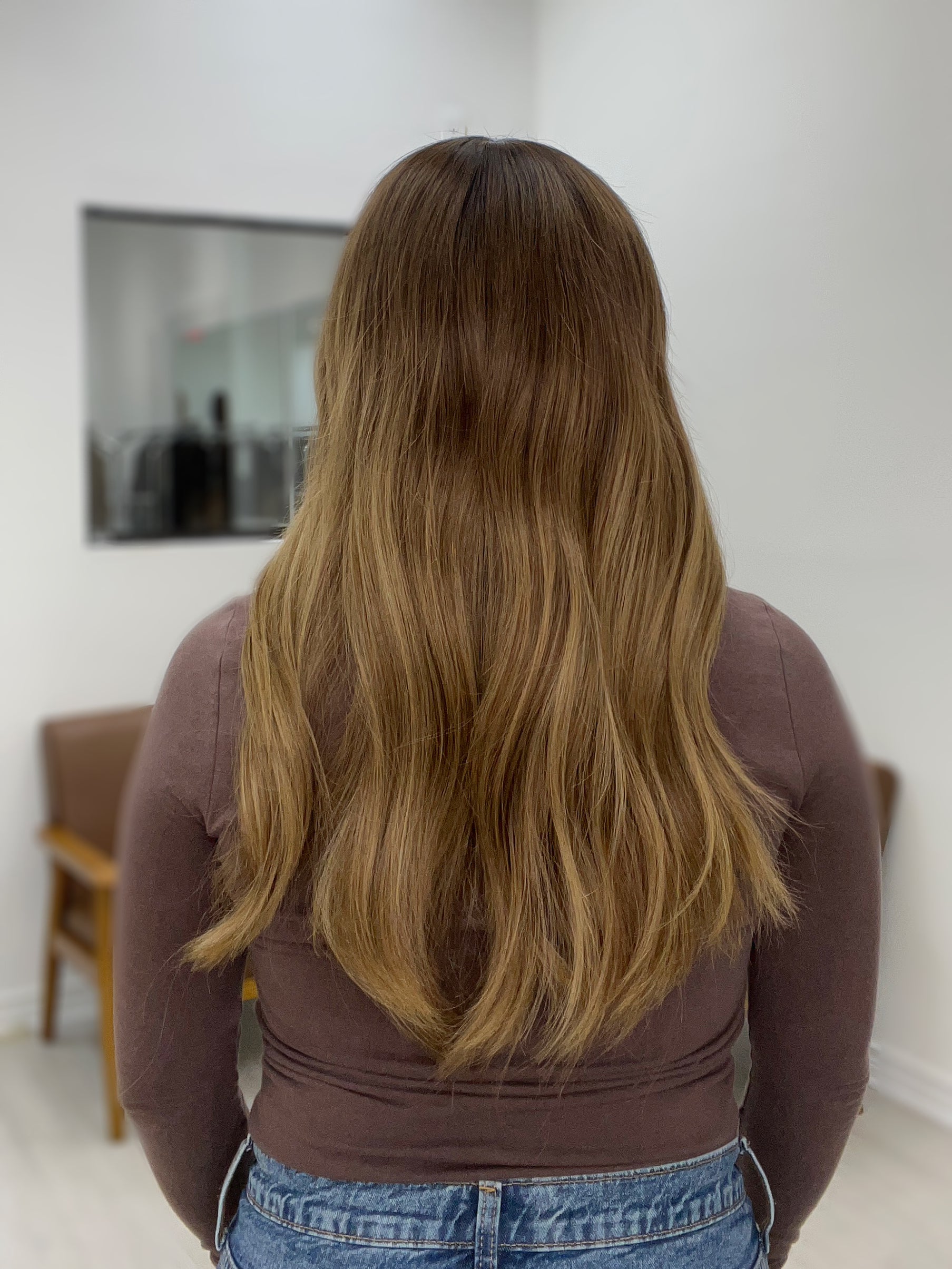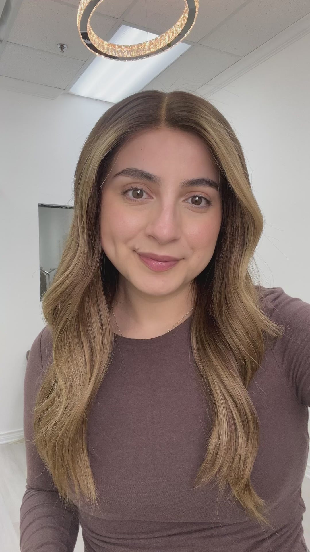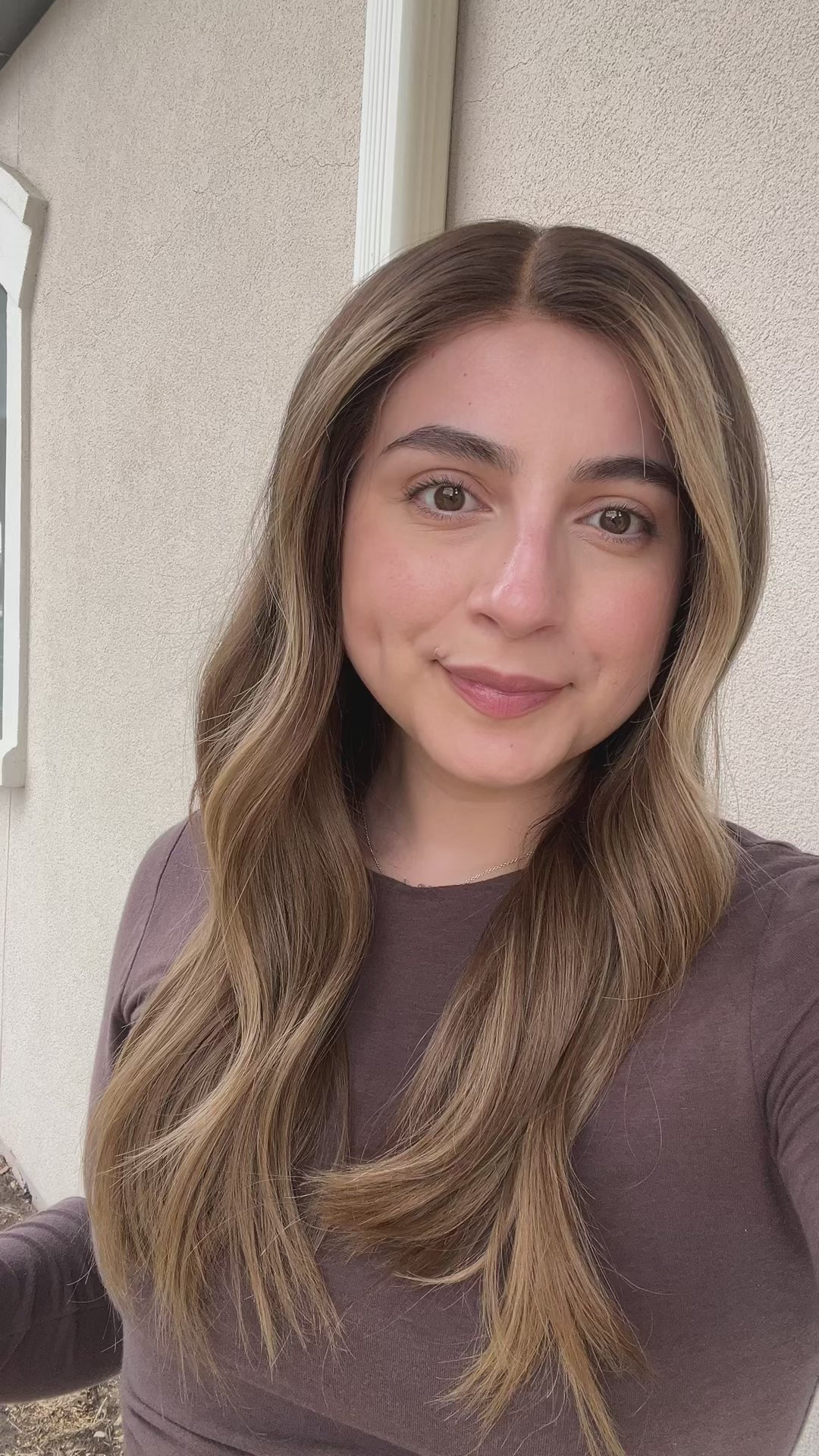 Color: Dark brown root into a medium brown base with a honey beige balayage and warm to neutral tones throughout and brighter face framing