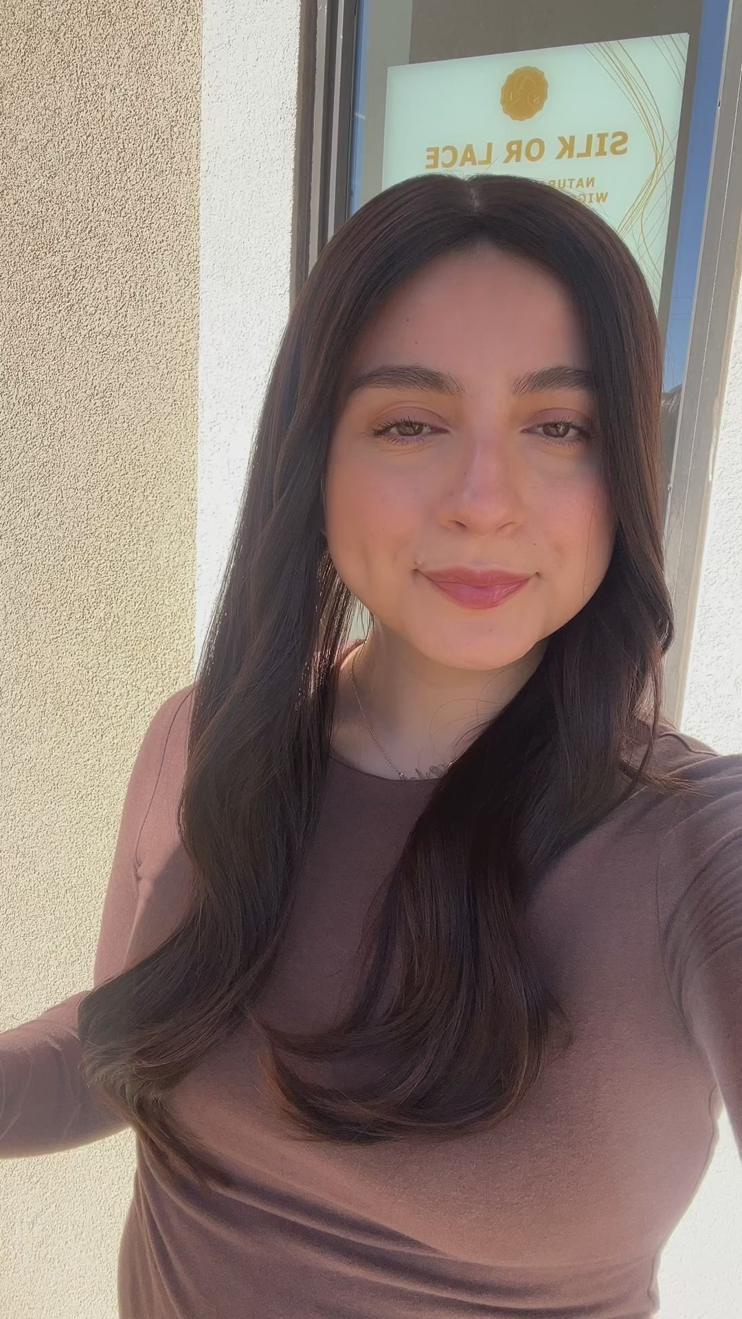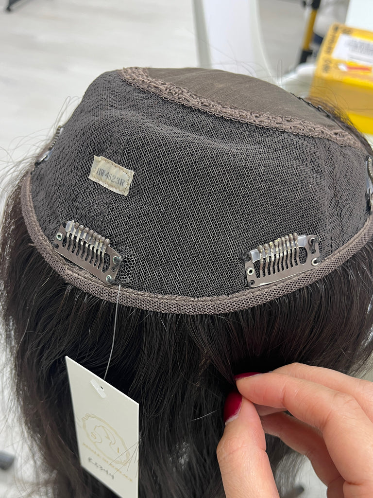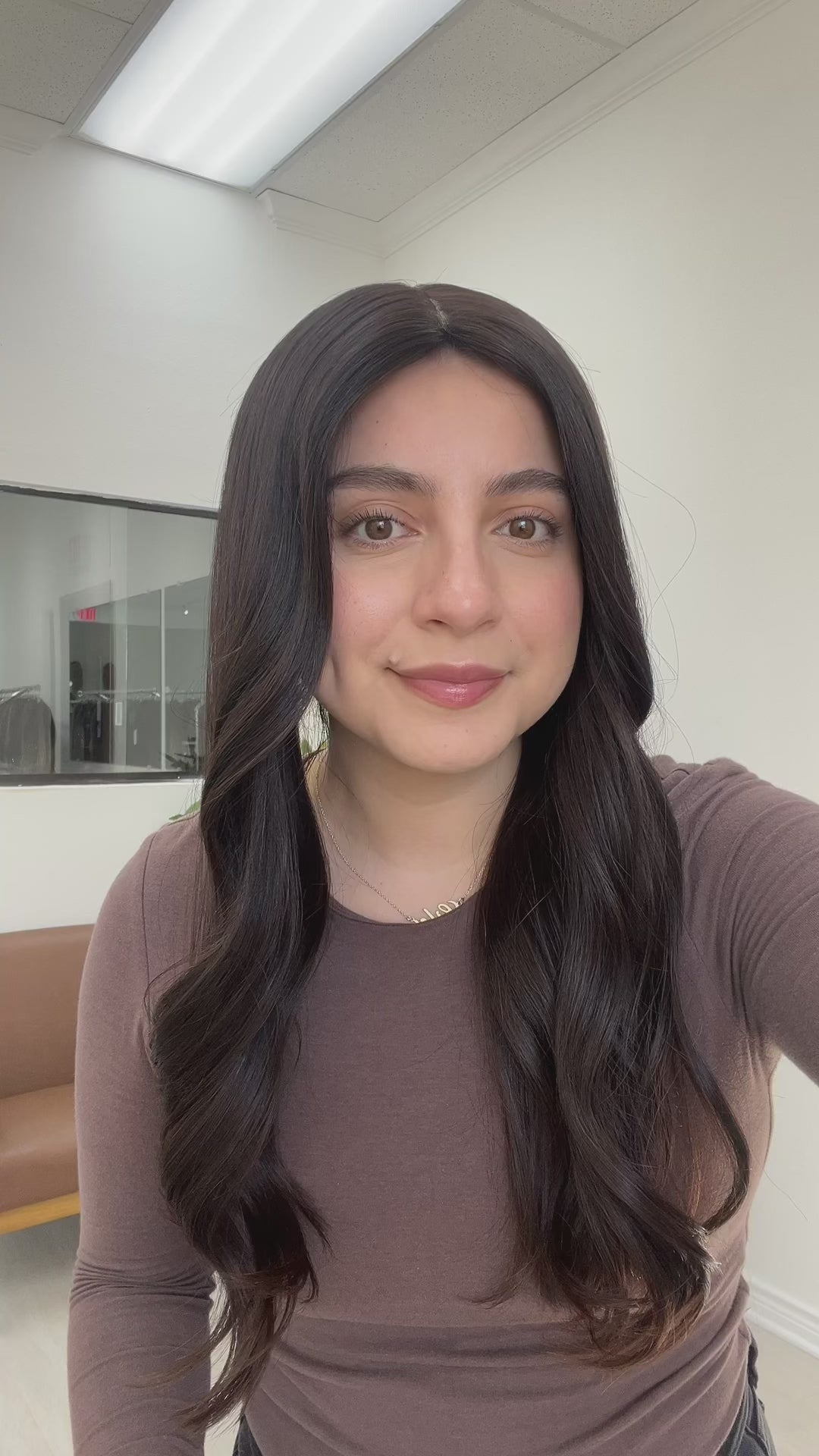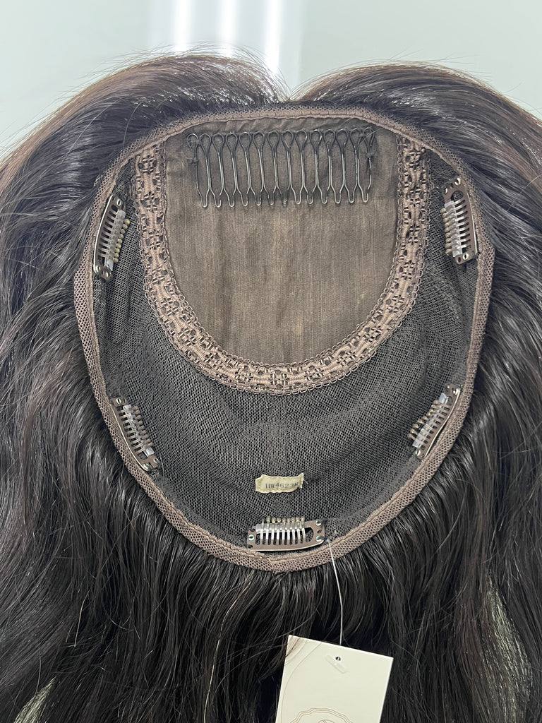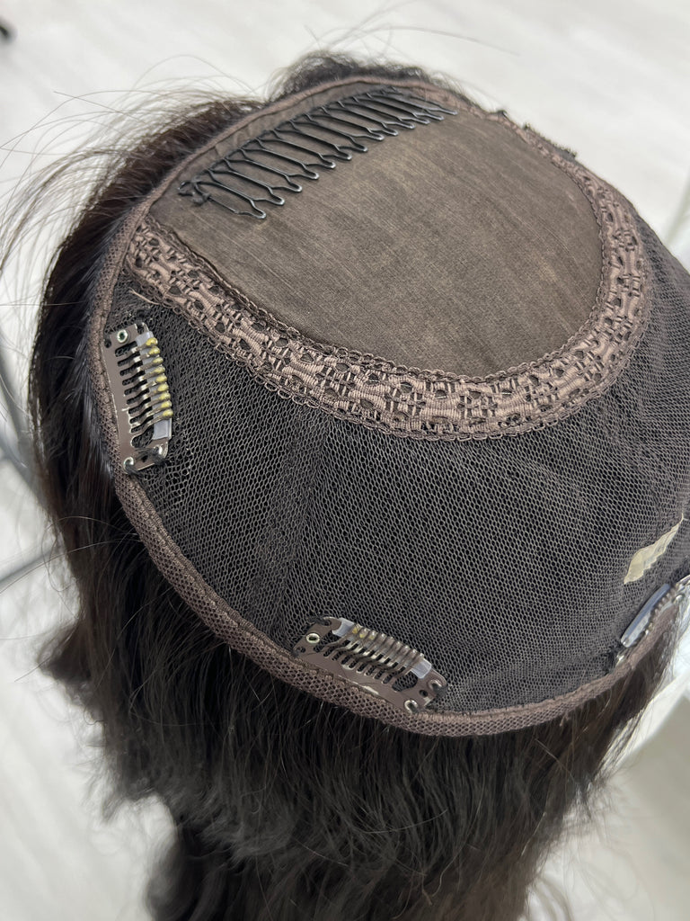 A beautiful classic soft black longer length topper! It is fully hand-tied, perfect for someone looking for comfort, light density and overall coverage. The cap is stretchy and breathable making it feel like you're not wearing anything at all!