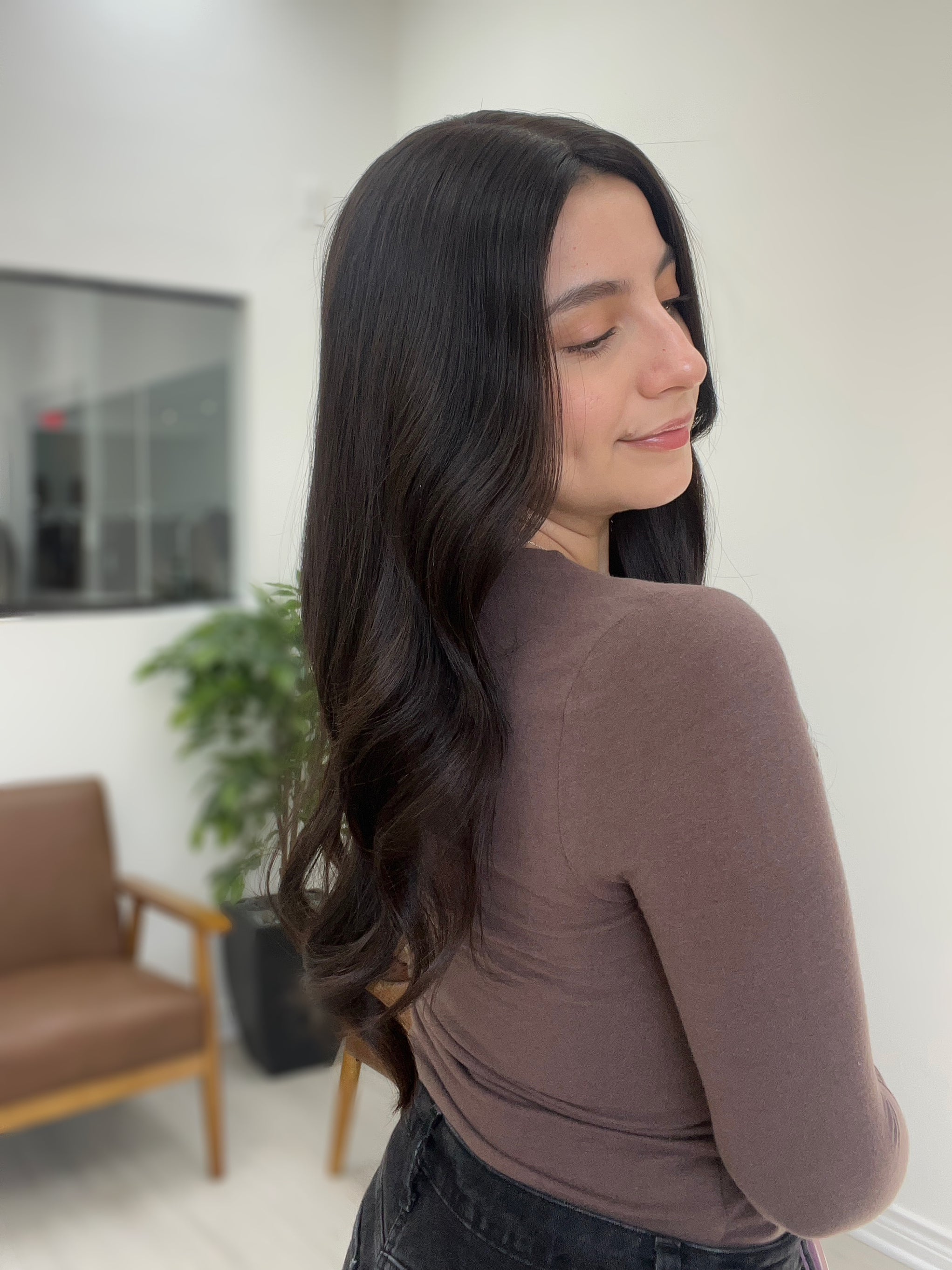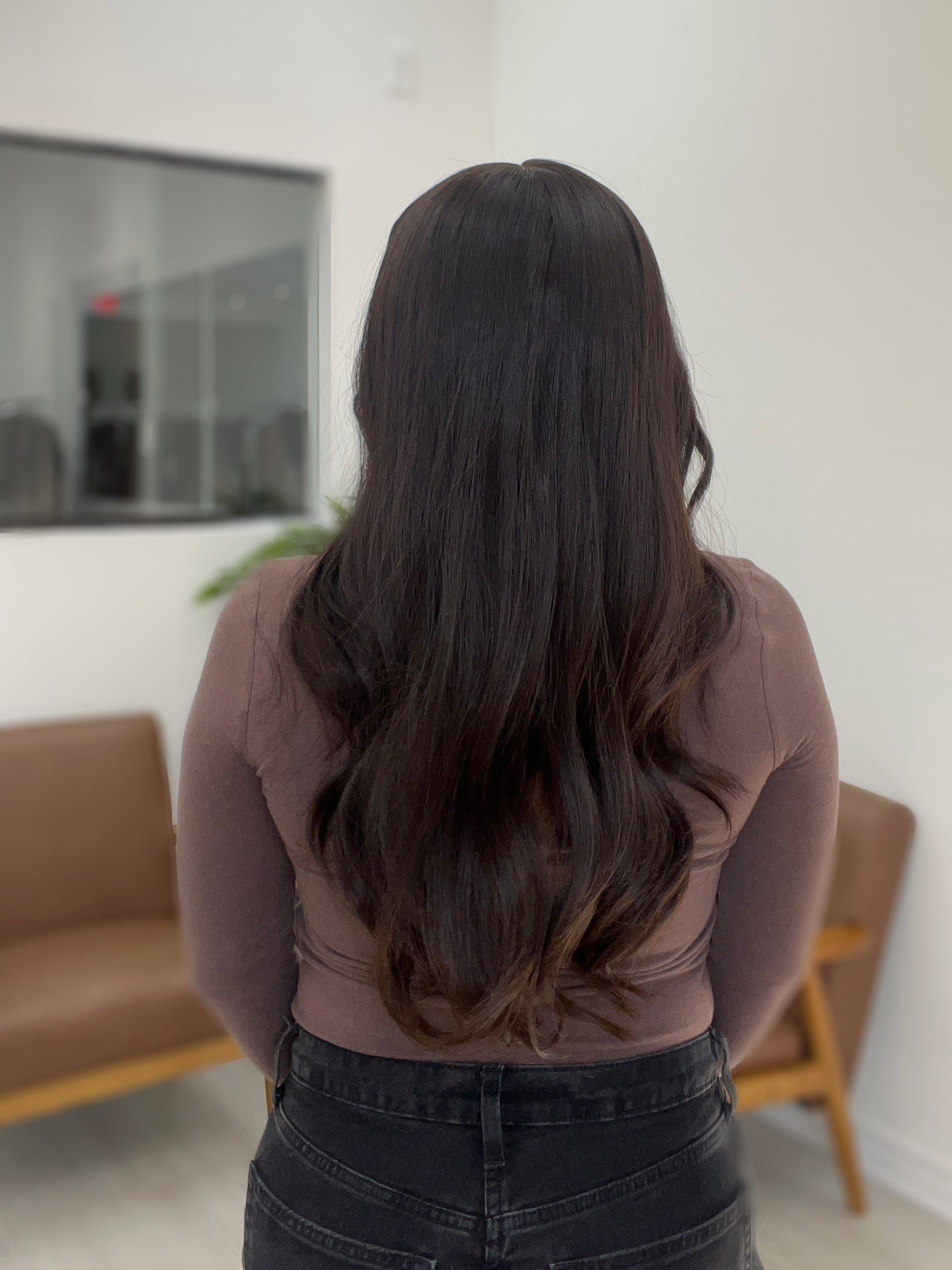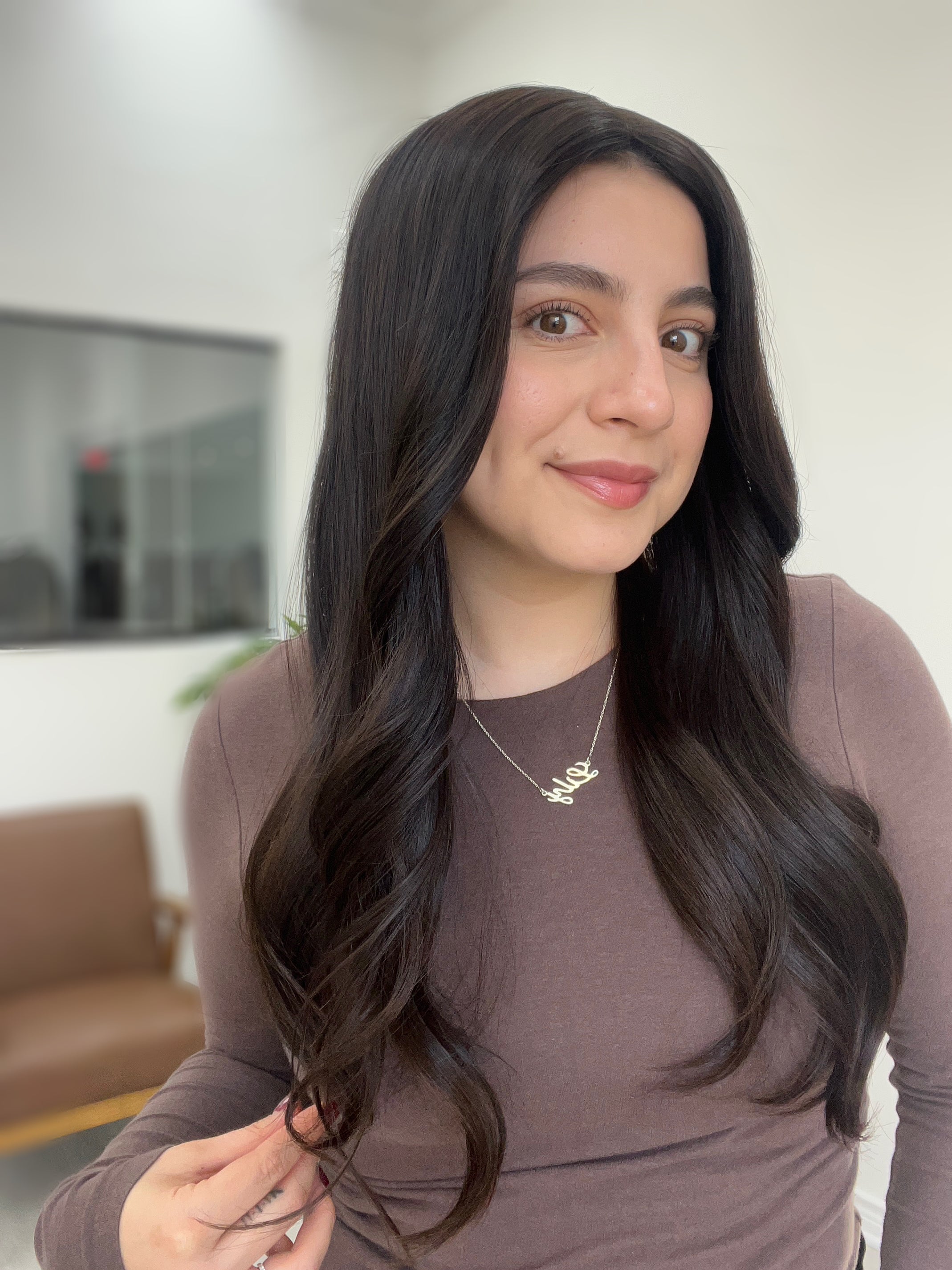 A beautiful classic soft black longer length topper! It is fully hand-tied, perfect for someone looking for comfort, light density and overall coverage. The cap is stretchy and breathable making it feel like you're not wearing anything at all!