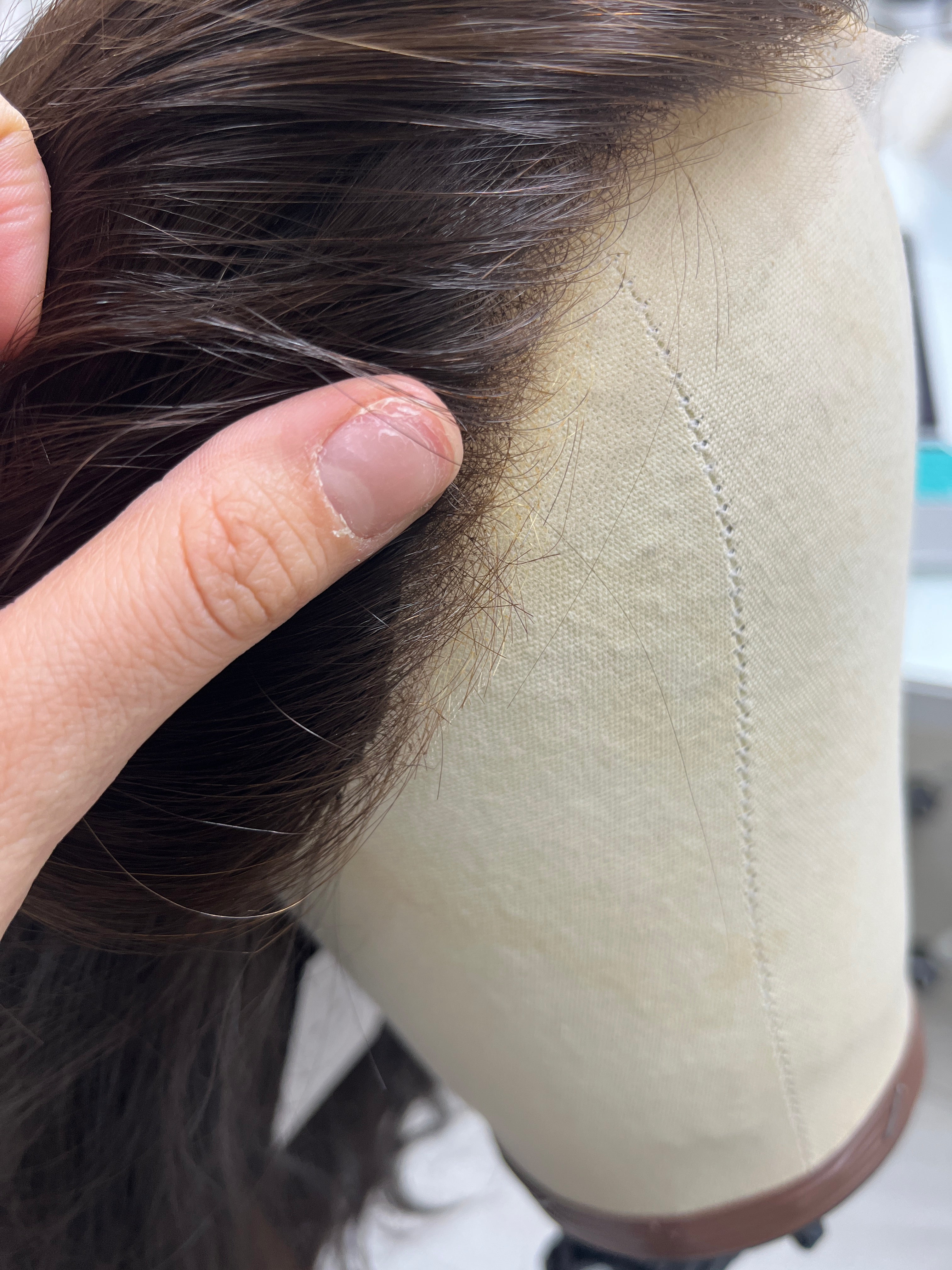 Other: Medium density (about 125%). Lace is cut with some room to further customize. Lace is cut closer to the hairline by the ear tabs with short hairs sticking out that are not visible when wearing. Knots are lightly bleached near the front of the hairline about 1 cm in. The rest of the knots are not bleached. Knots are lightly plucked. There are some short hairs sticking out near the front center of the hairline that are not noticeable when wearing. There is a short loose thread by the brand label tag that does not affect the integrity of the piece. As mentioned above, the seller had the cap altered to a size medium.