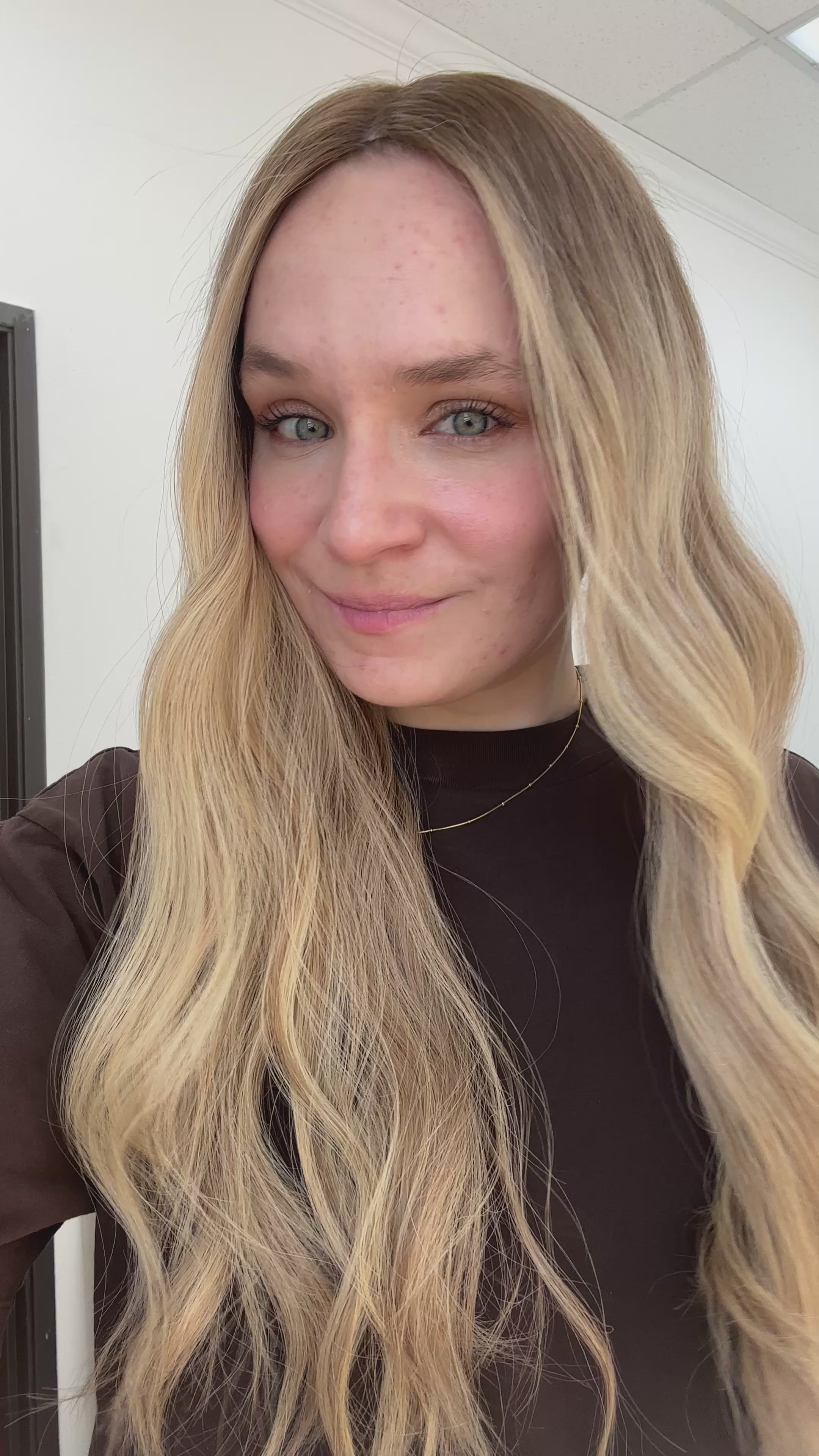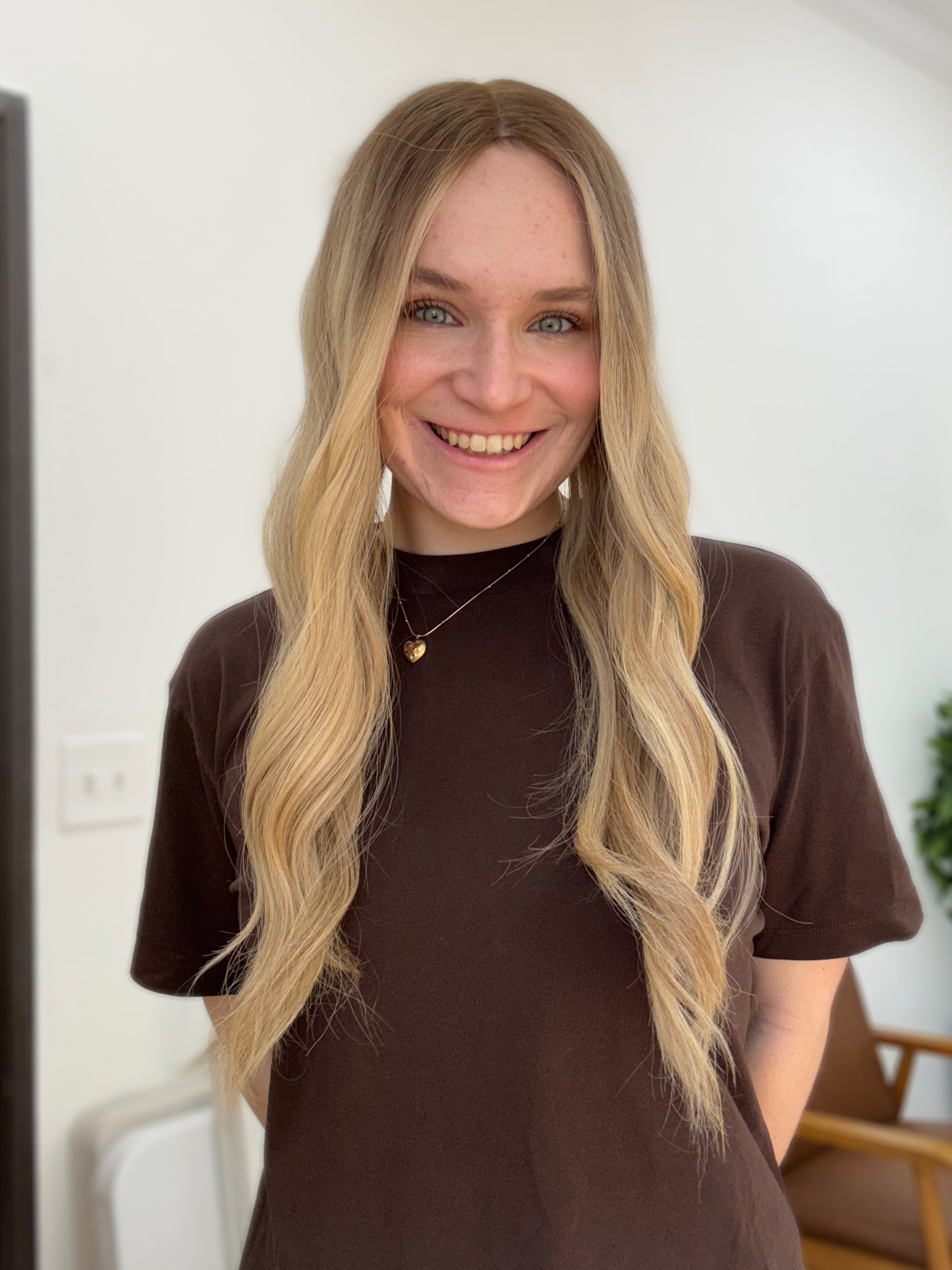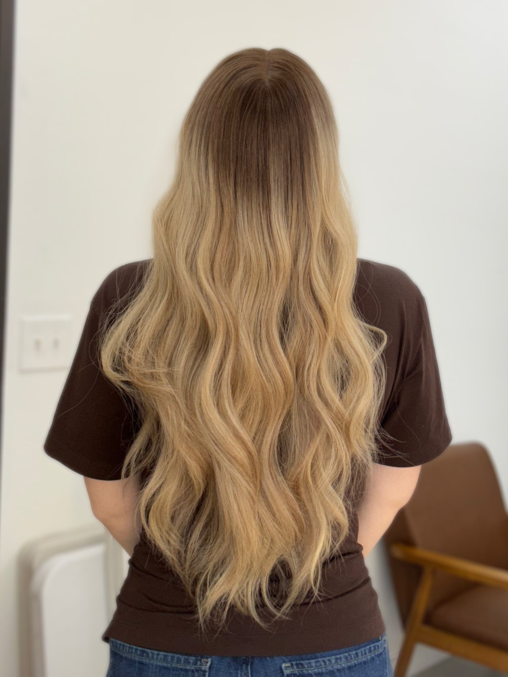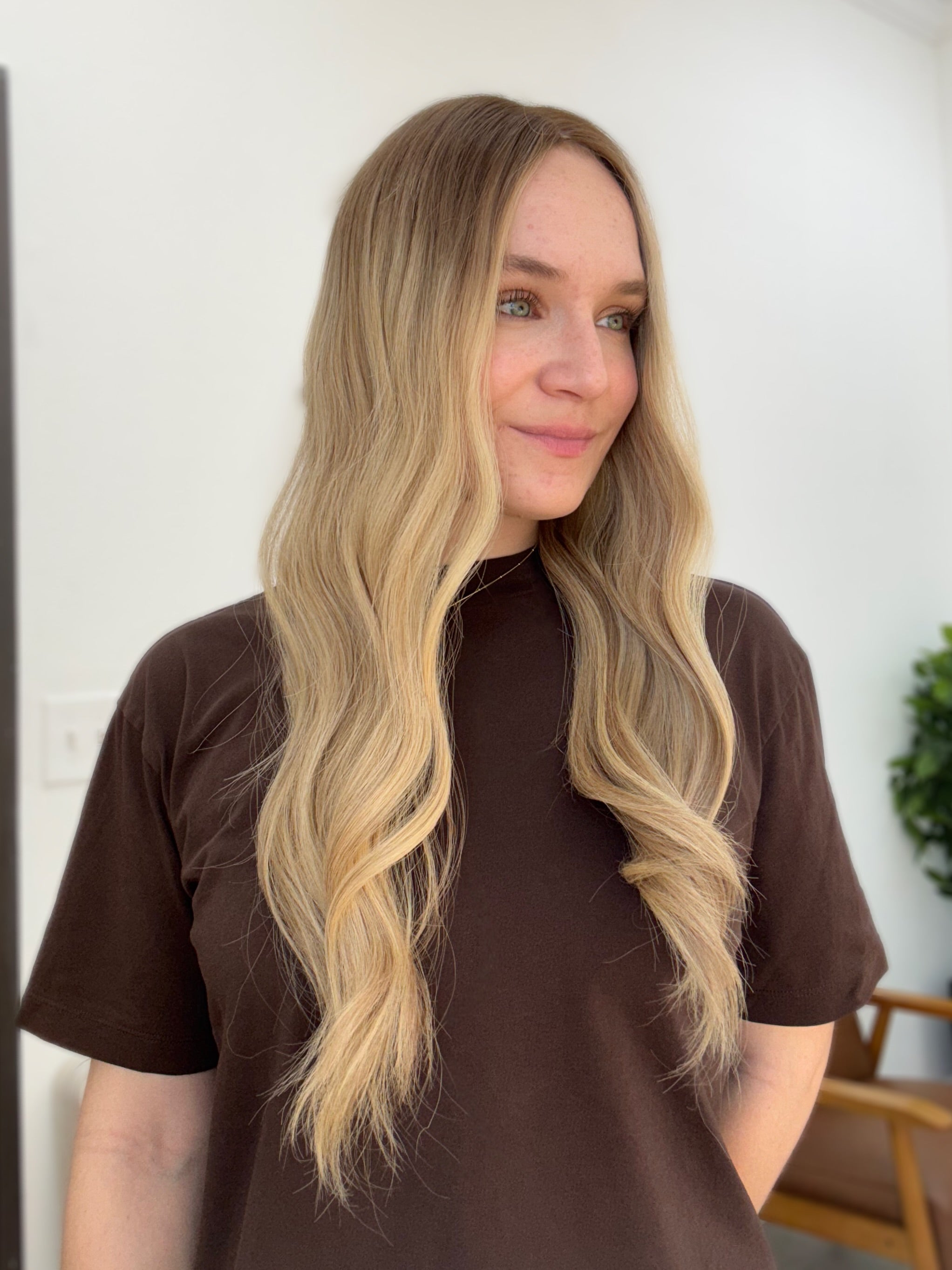 This seamless root melt into a gorgeous blonde is an absolute steal at this price. She’s a natural, lived-in blonde with just the right amount of dimension to keep her bright yet realistic. And toppers this long are rare, making this piece an even better find.
