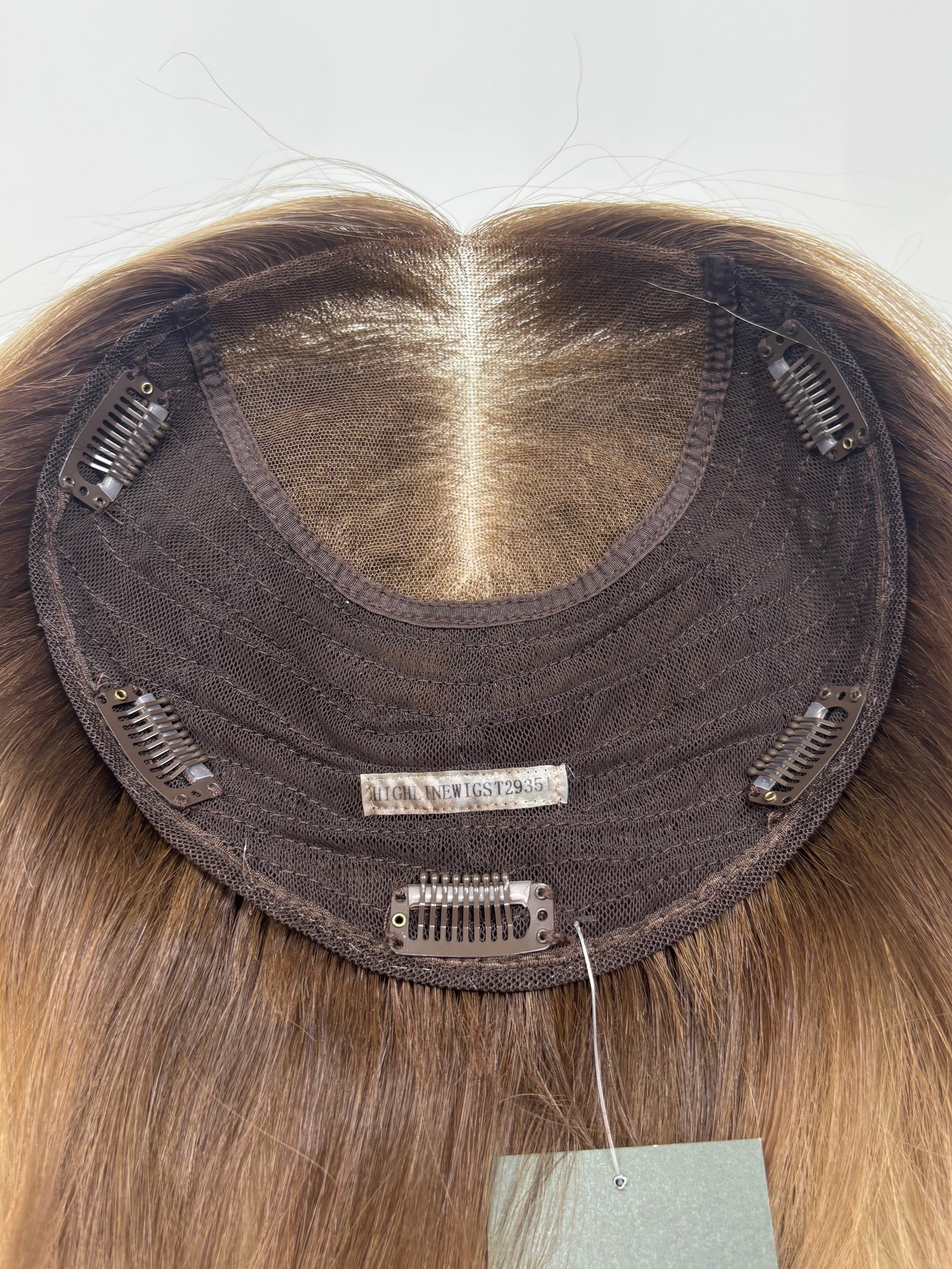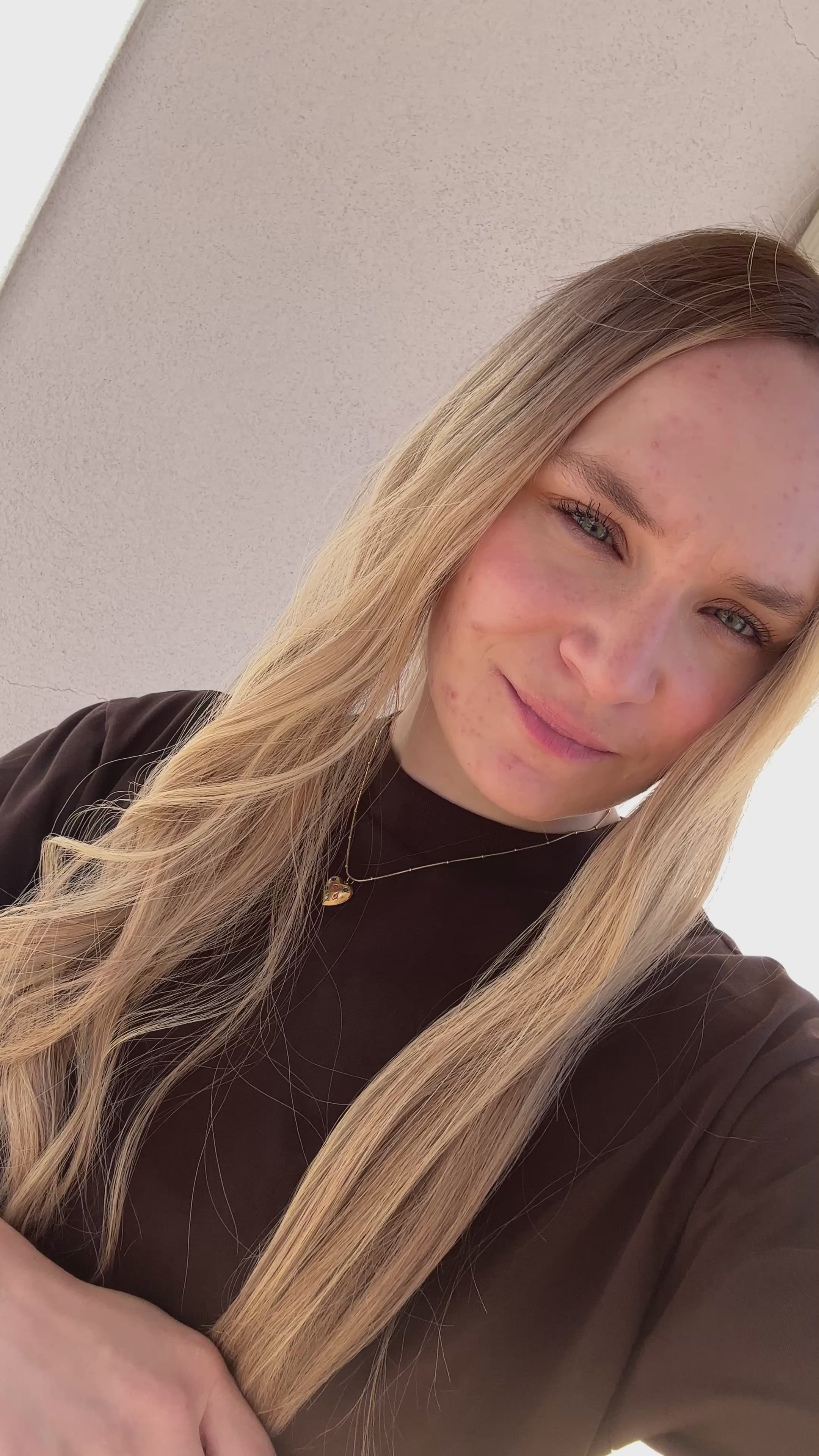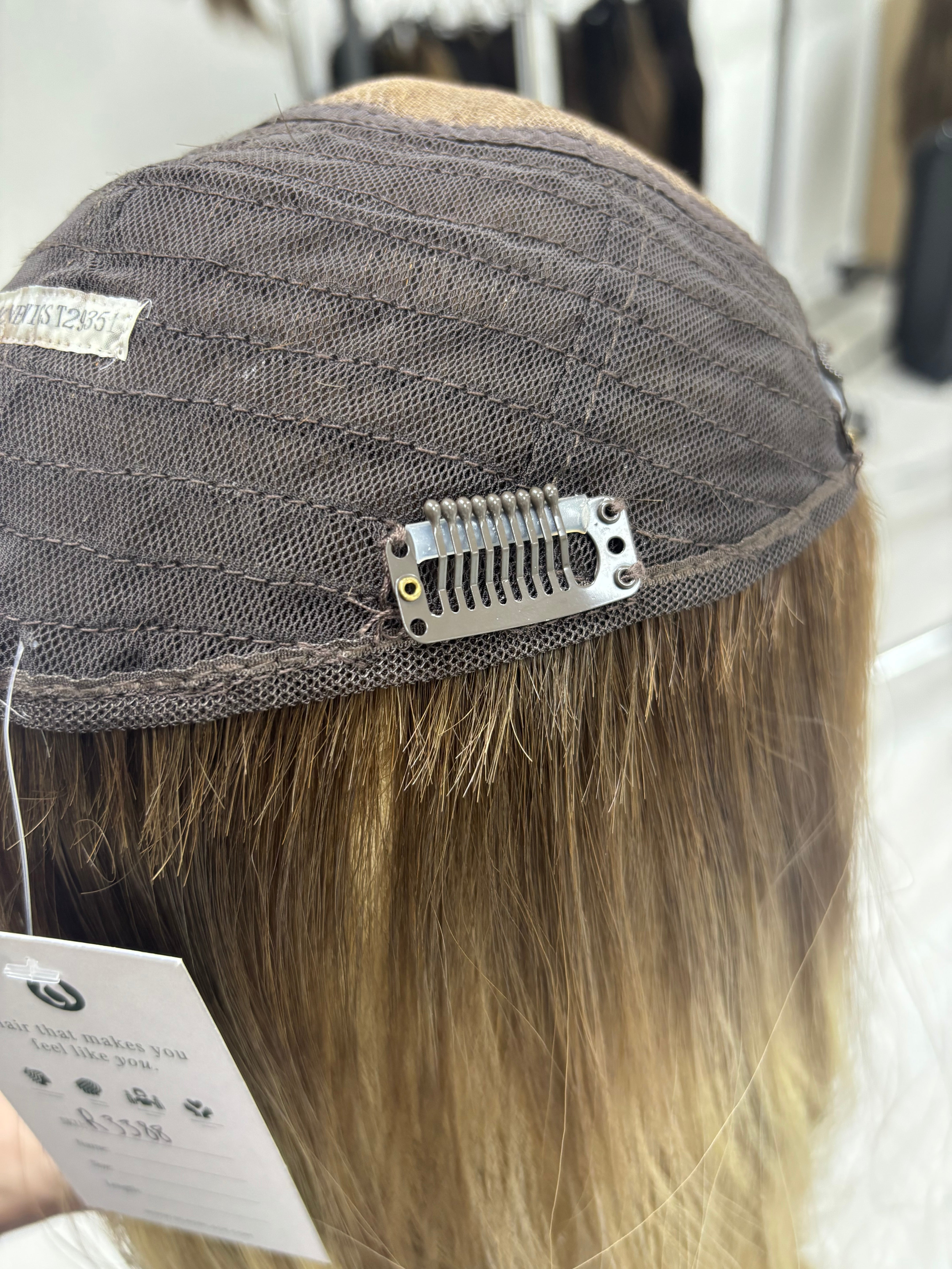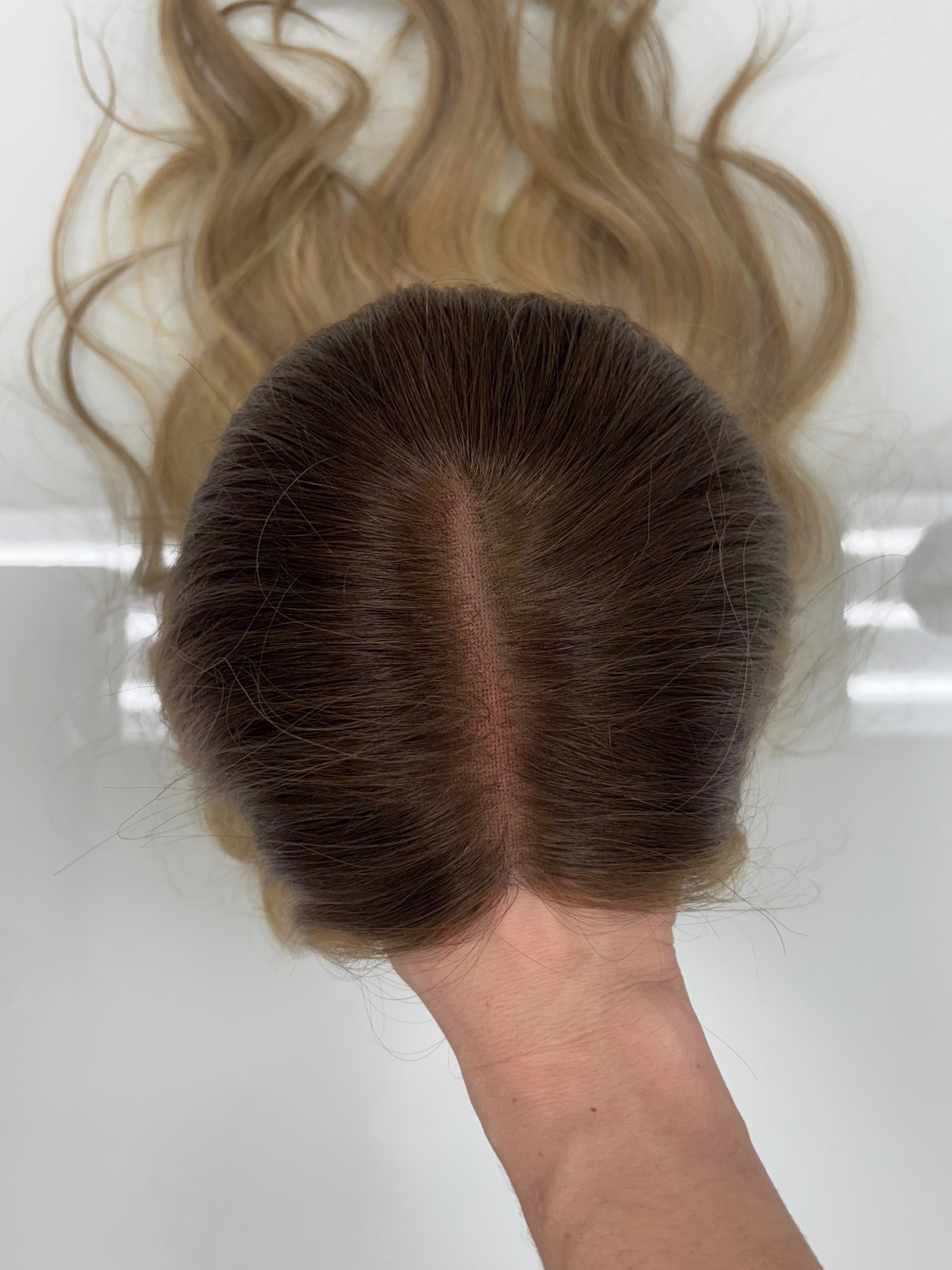 This seamless root melt into a gorgeous blonde is an absolute steal at this price. She’s a natural, lived-in blonde with just the right amount of dimension to keep her bright yet realistic. And toppers this long are rare, making this piece an even better find.