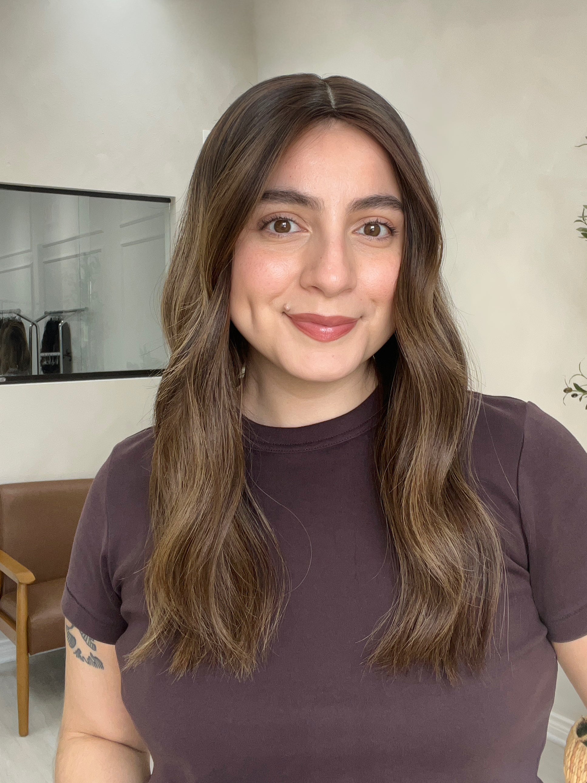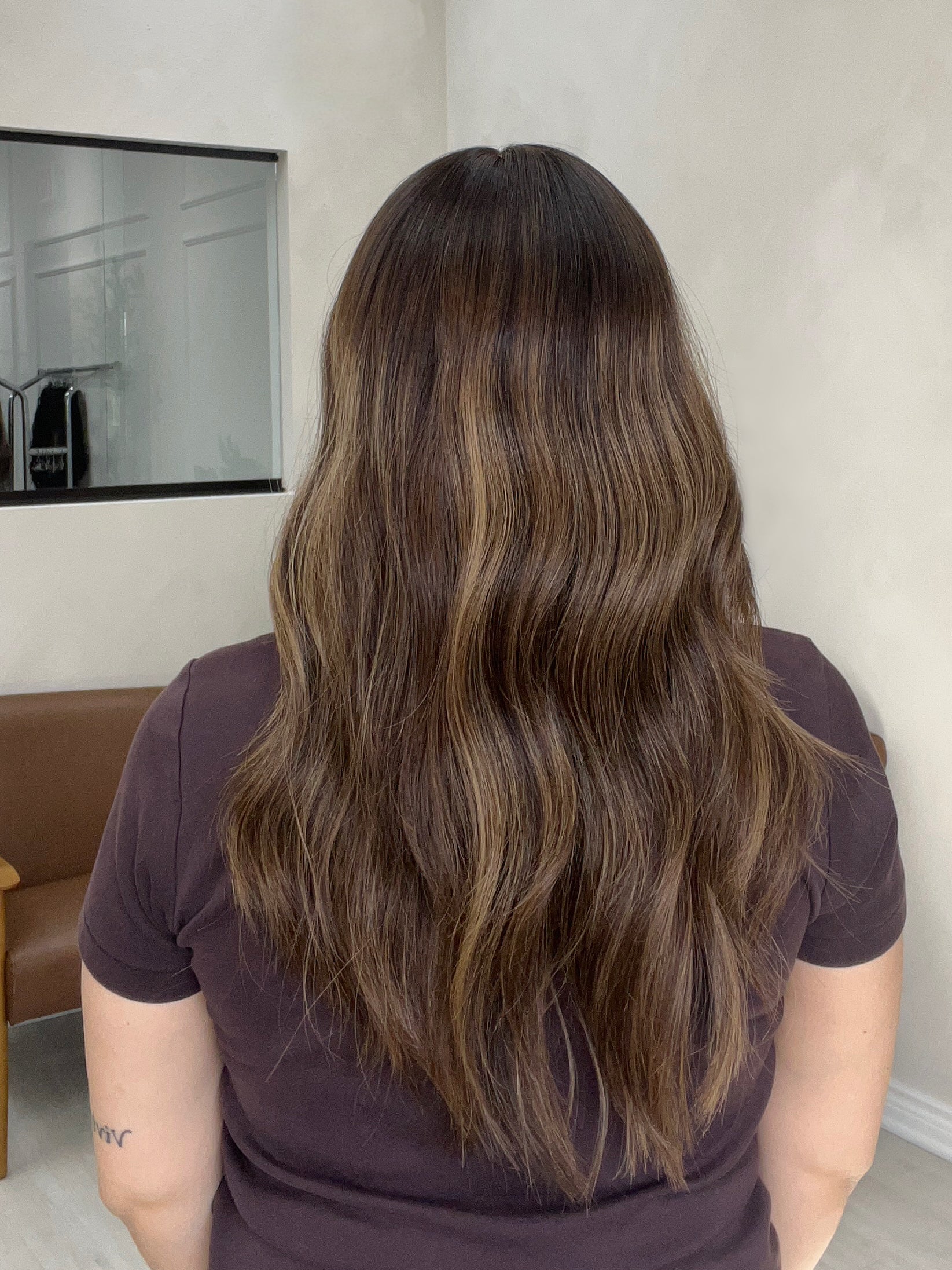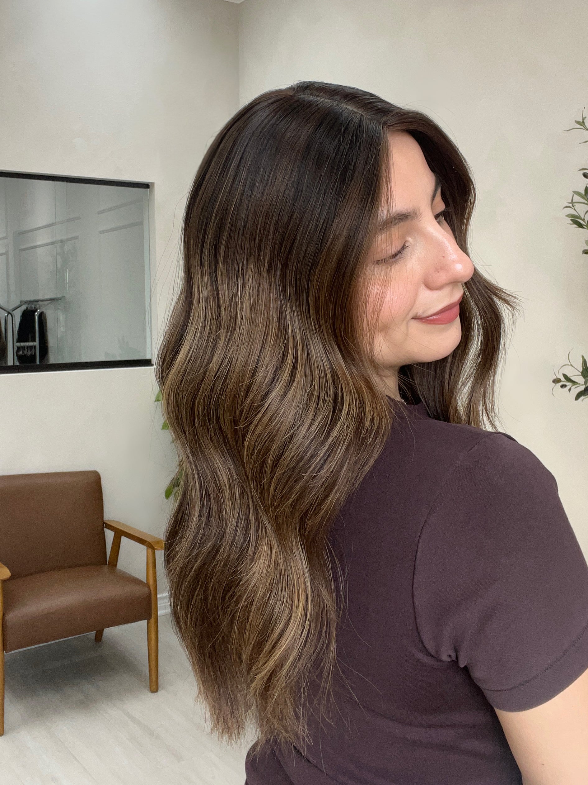 Color: Dark brown base with honey caramel balayage and lighter blonde blended throughout