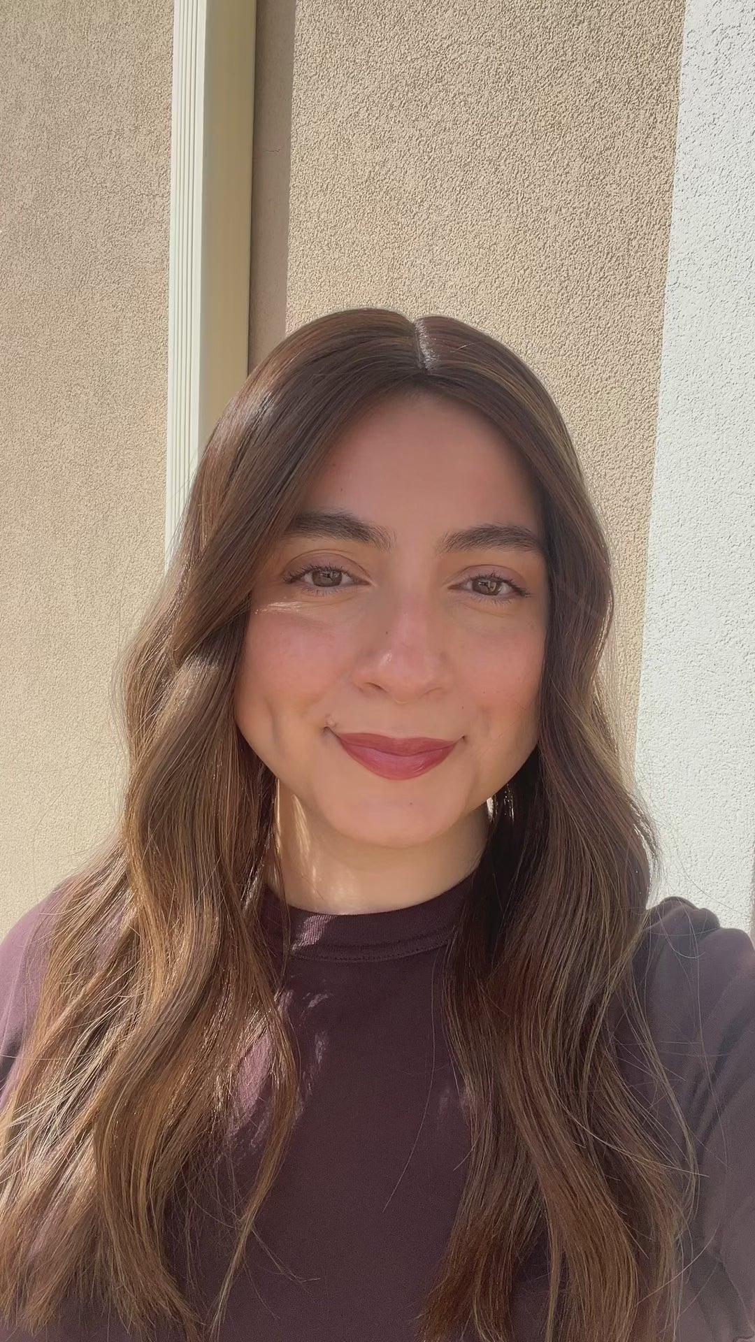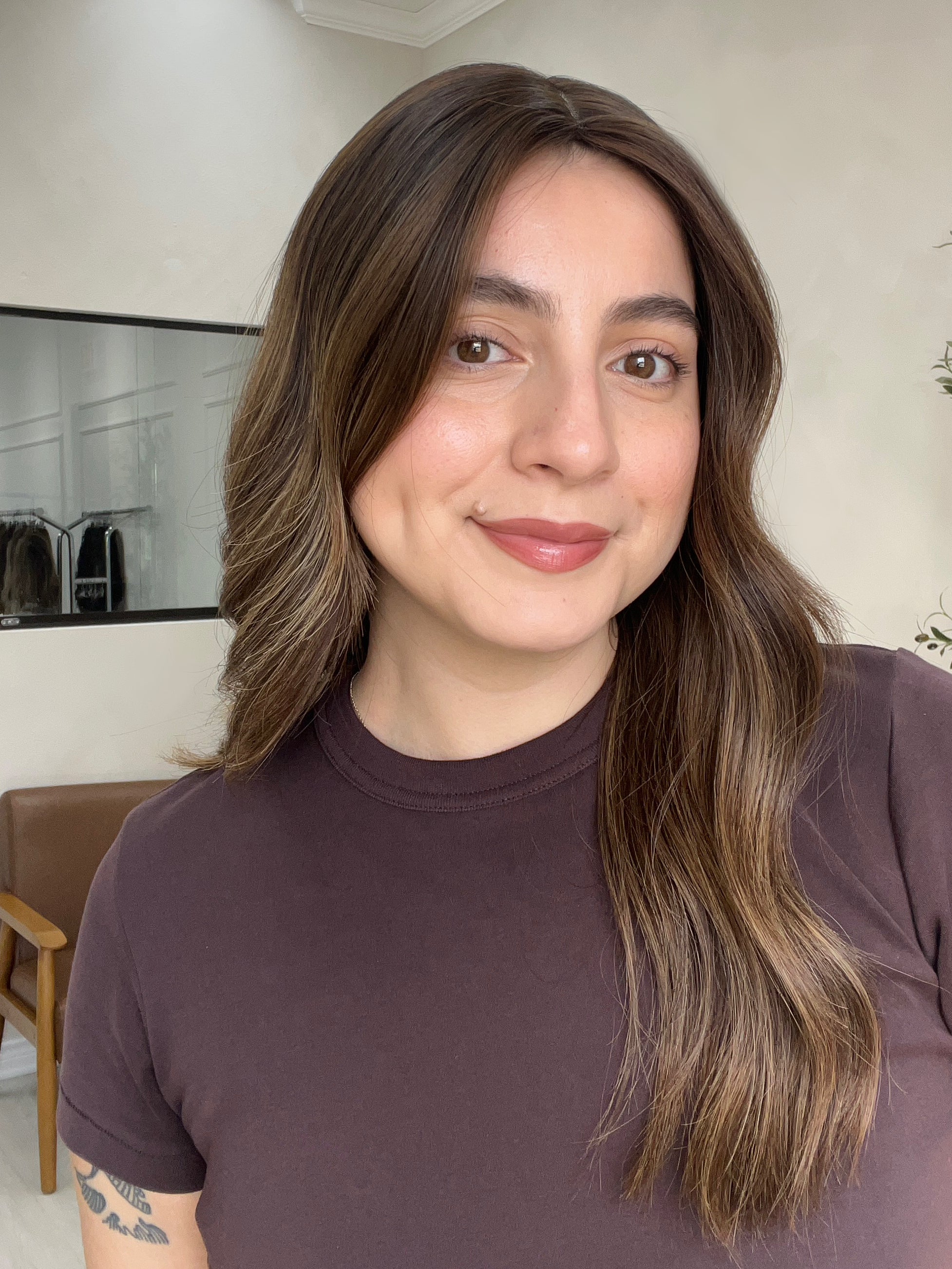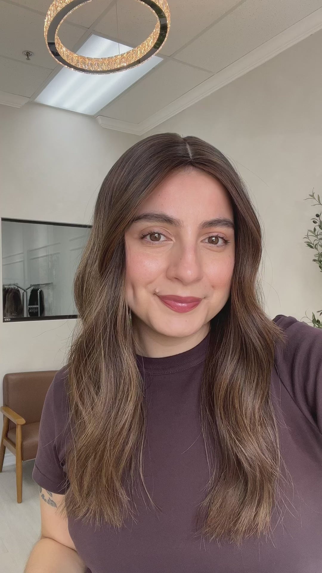 Color: Dark brown base with honey caramel balayage and lighter blonde blended throughout