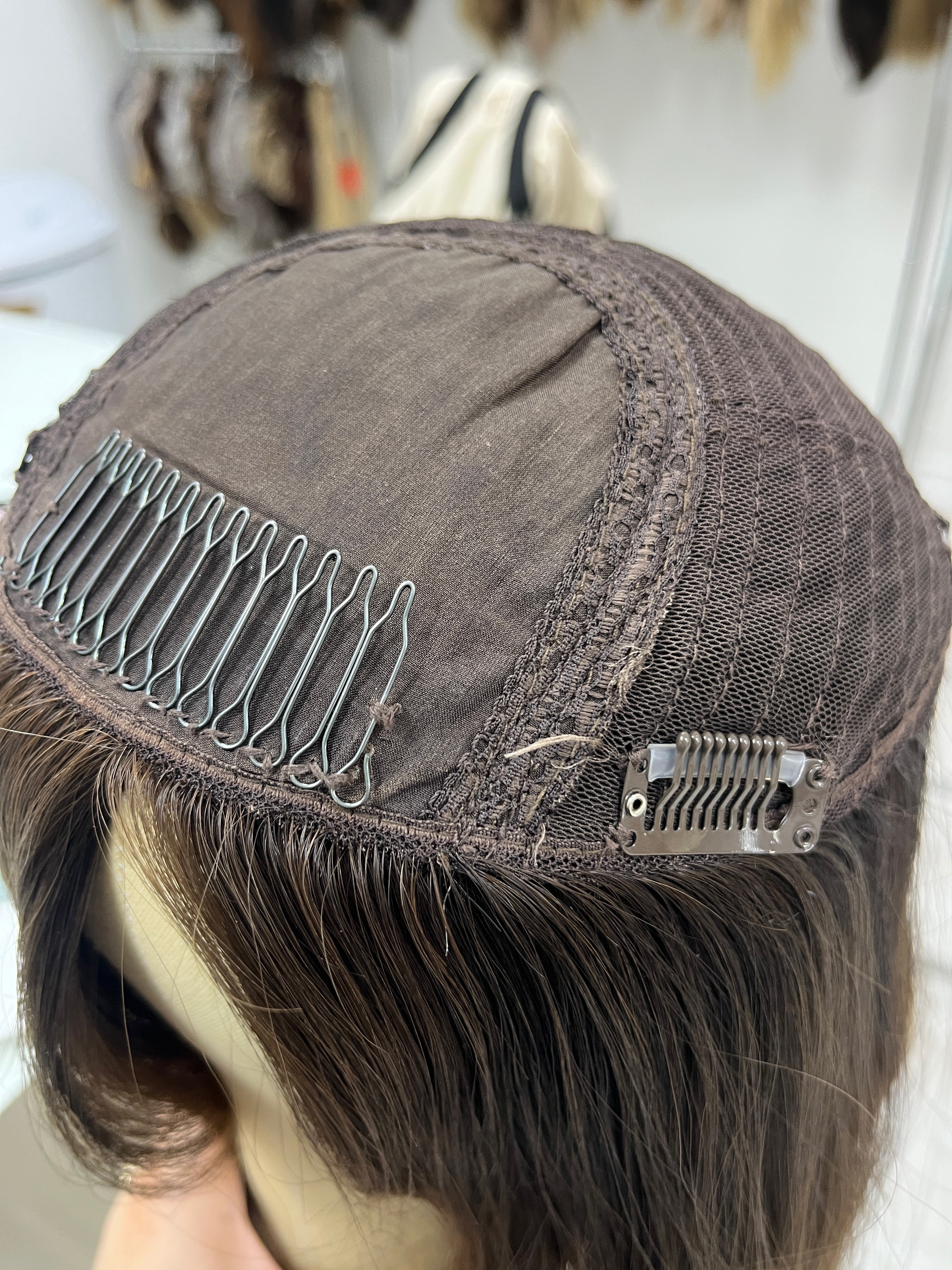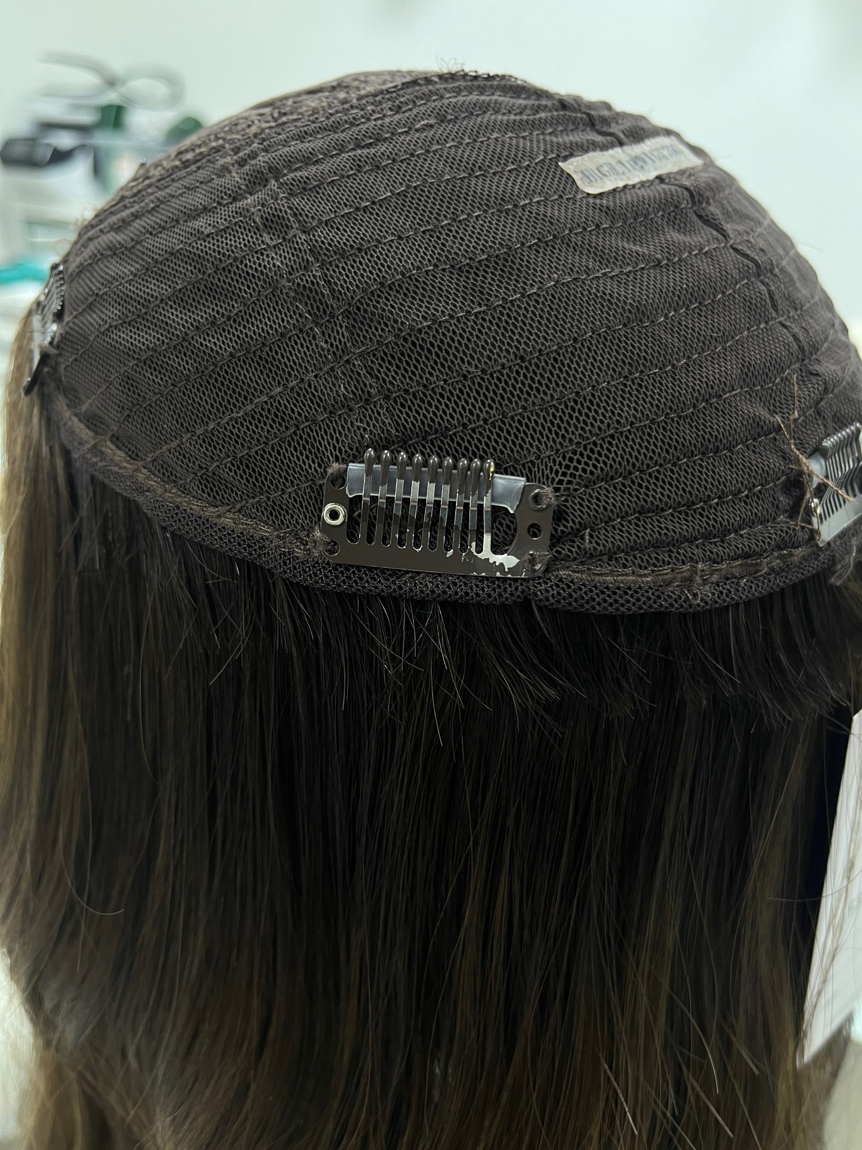 Other:Medium light density (about 120%). Light wear and tear on front comb and clips. The front comb is slightly loose on one side and moves a bit (will need to be tightened). One clip has been re-sewn with different colored thread and has a loose thread that is a bit longer than usual, however it does not affect the integrity of the piece - this clip is loose. There is one other clip that is loose and both will need to be tightened. There is one small area near the front of the silk top that has light knot fallout - it is not visible when parted as shown. The seller added a haircut to this piece.