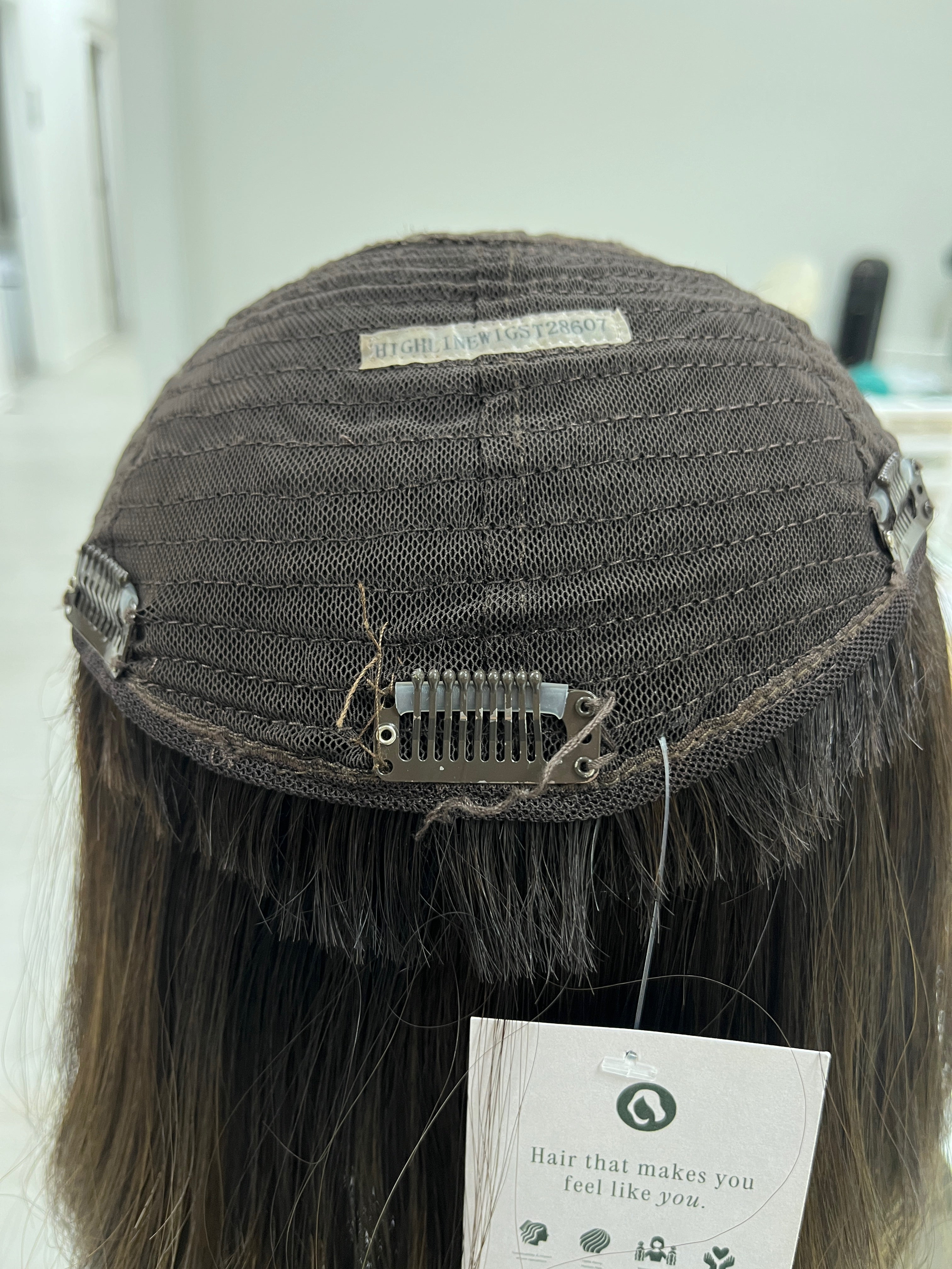 This is an amazing Highline Wigs hair topper find! The Dark Brown Lexie color is always a fan favorite in our lightly worn section and this one has gorgeous pre-cut bangs! Hair toppers from Highline are great beginner friendly options as you don't have to blend much of your hair with it as the hair is sewn all over the rim giving you a seamless, blended look. The longer lengths in hair toppers are rare in our resale section and this one has the perfect density as it doesn't feel heavy yet still full of body and volume.