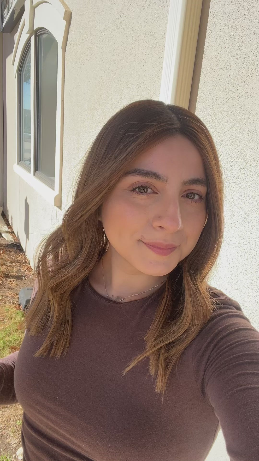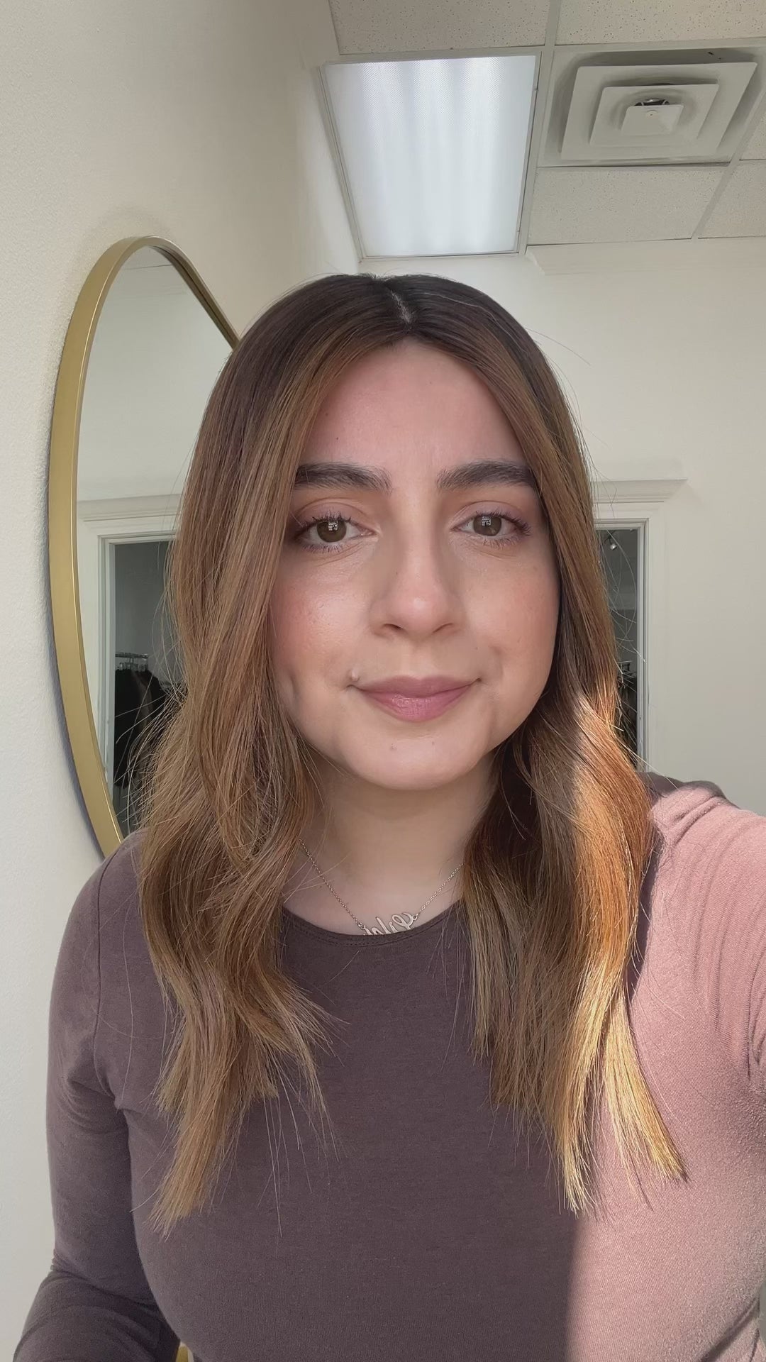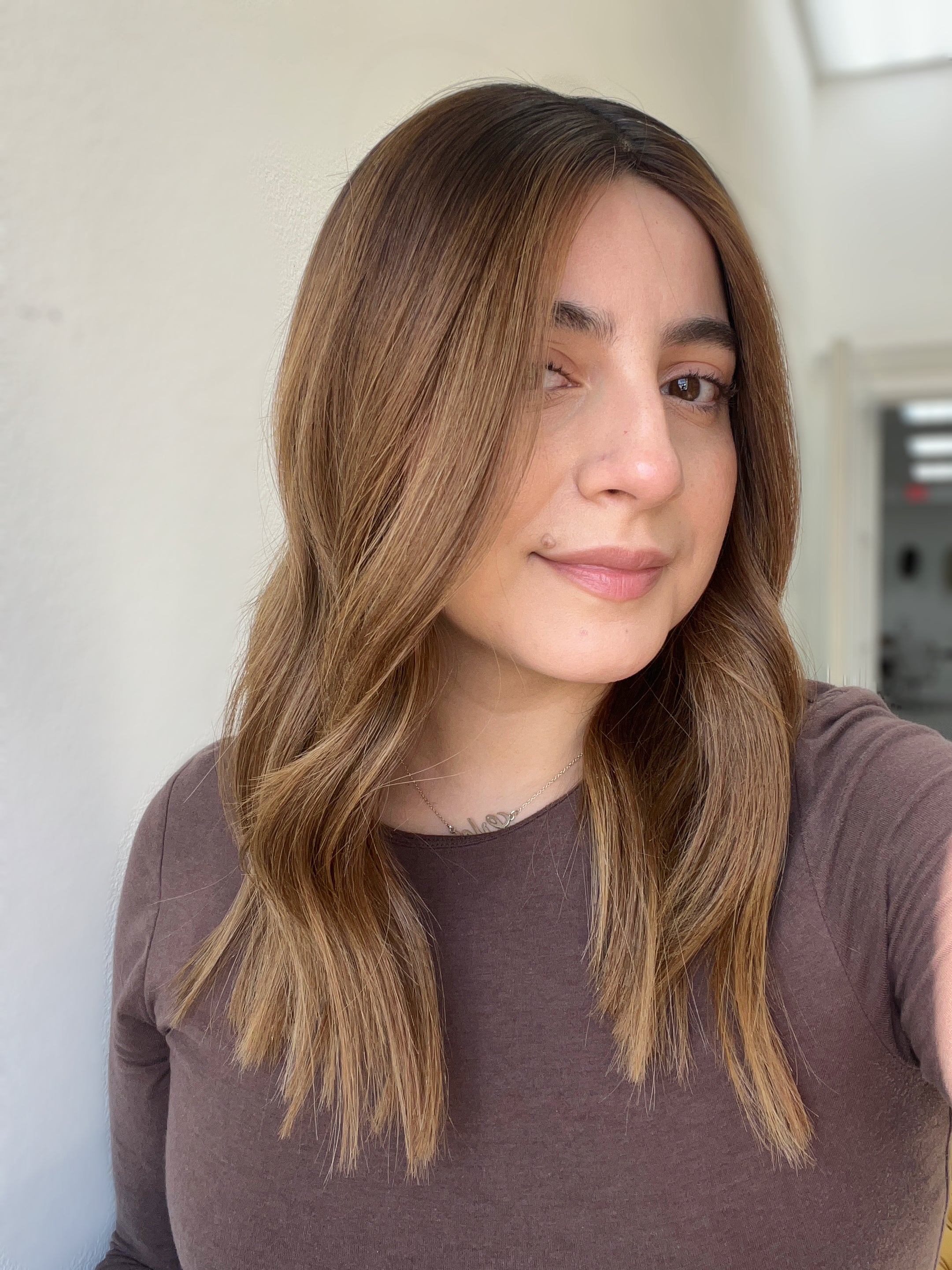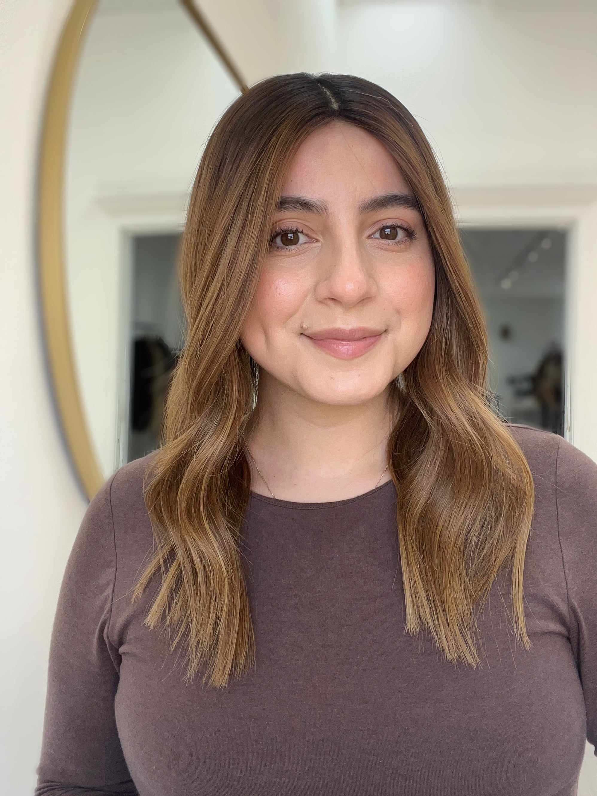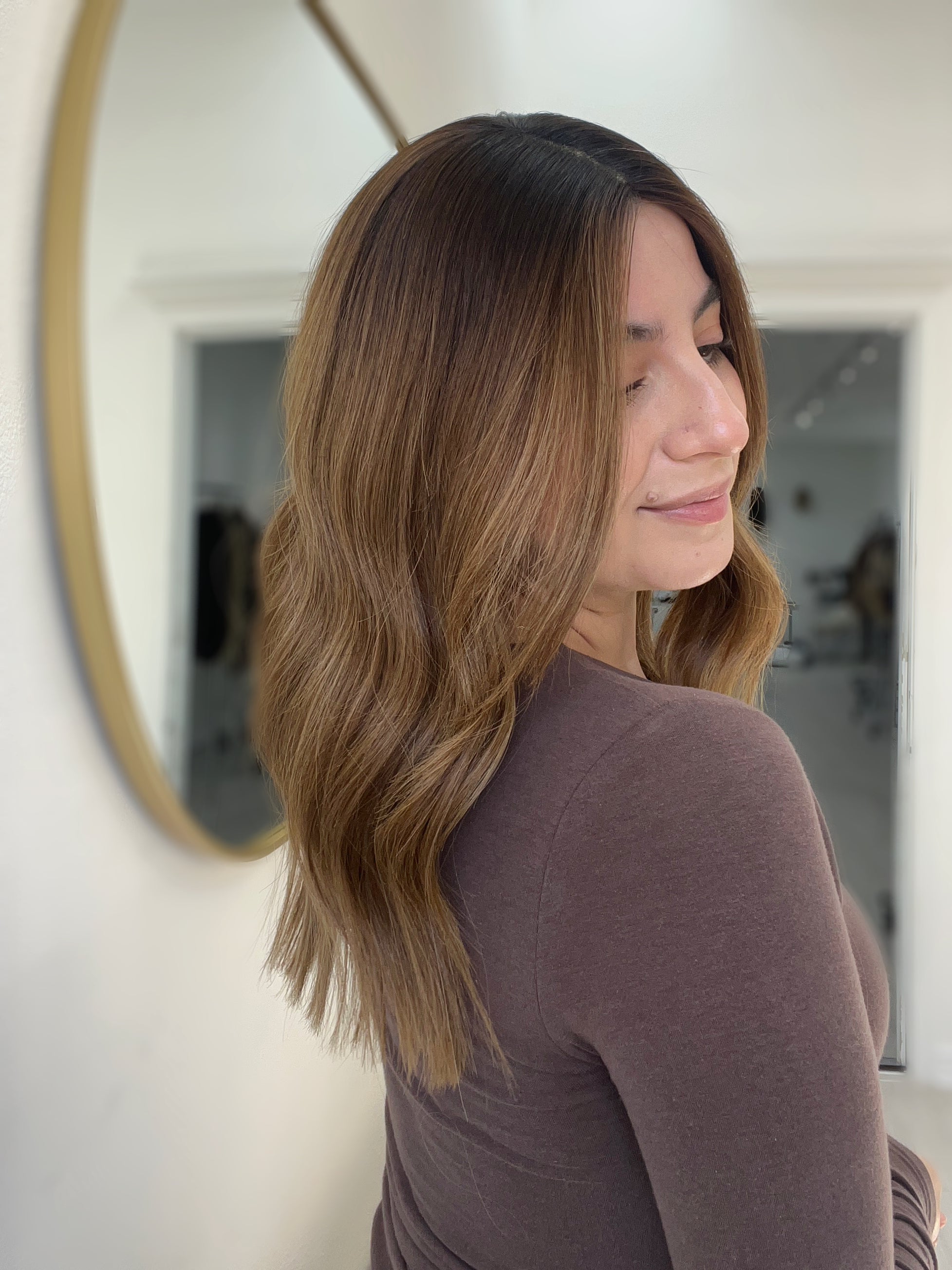 Color: Dark brown root into a dimensional chestnut brown balayage with cinnamon and blonde highlights