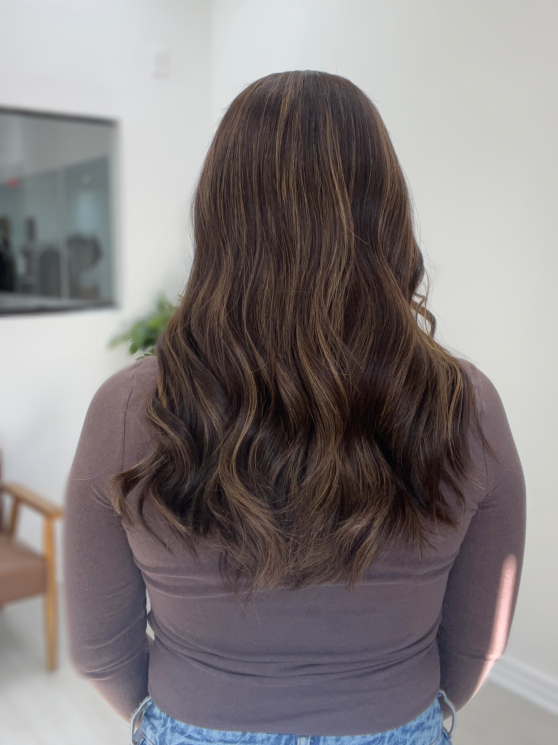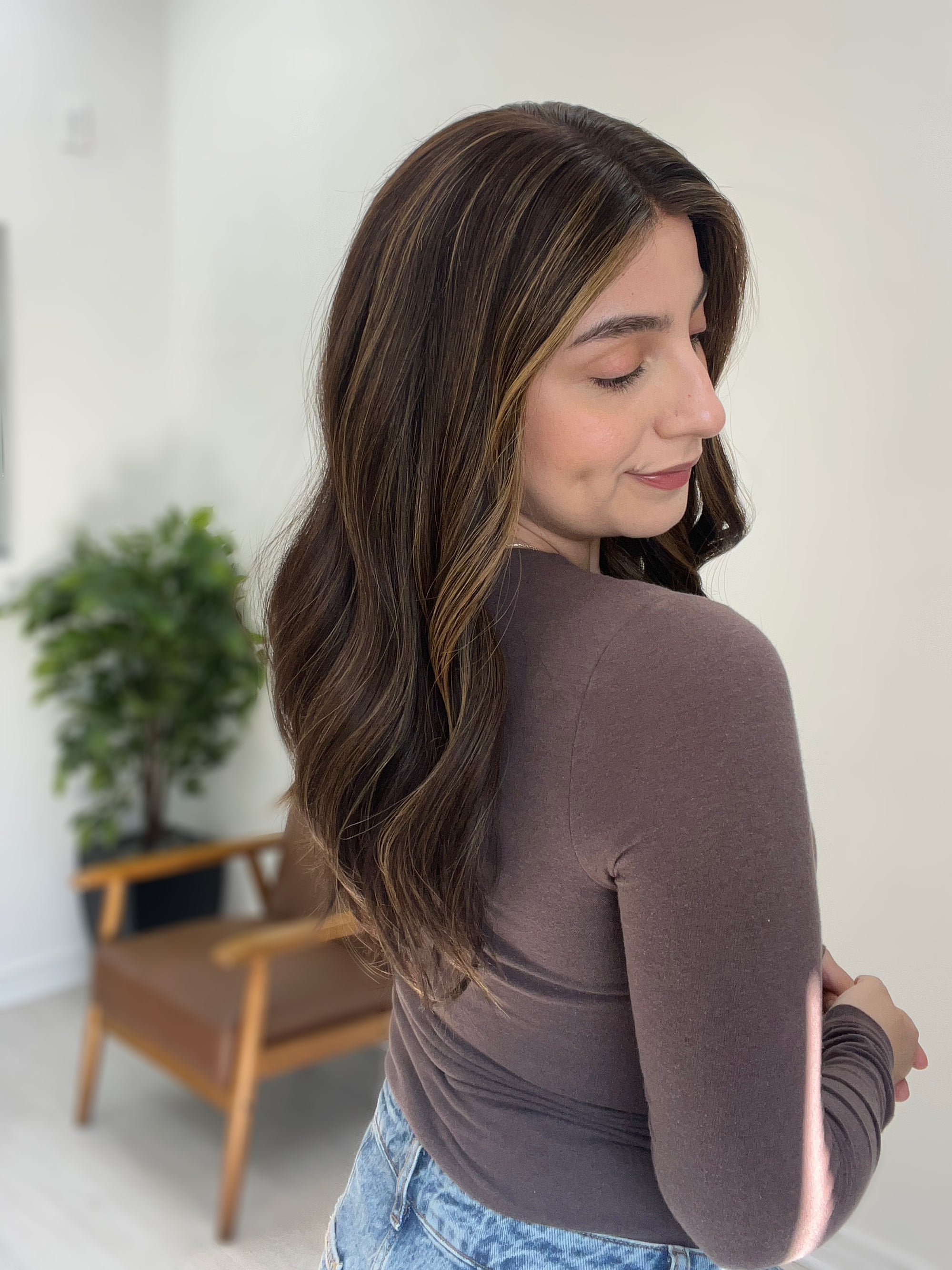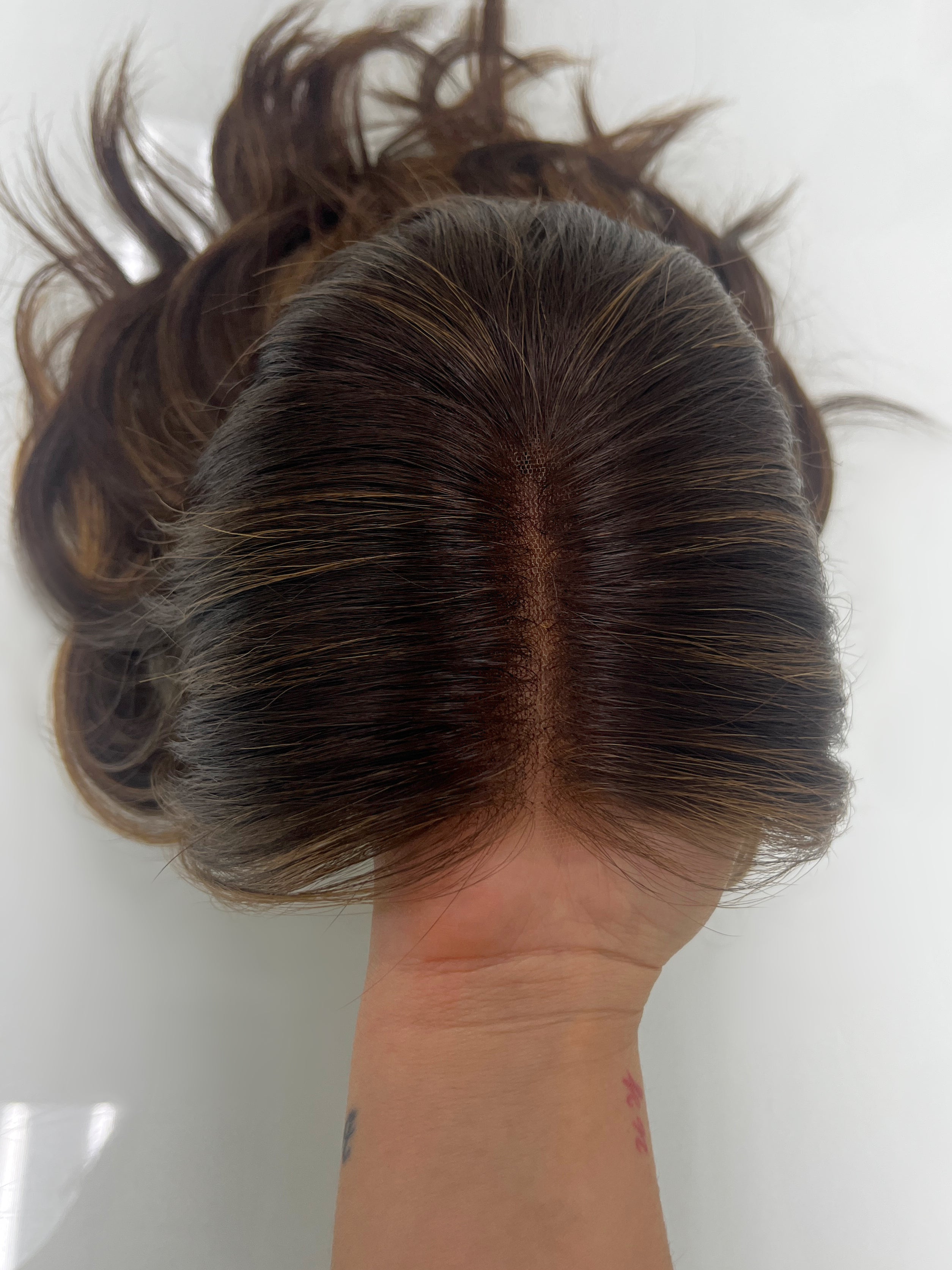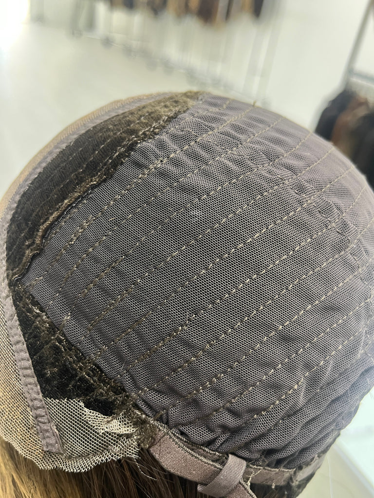 Mongolian hair is known for its thickness and smooth texture - it is a good balance between added volume and manageability. Easy to style and very soft/silky. The velvet lining inside the cap makes this piece feel snug and secure, it is an added layer of comfort/security so you do not have to wear any clips, combs or glue. Overall, a beautiful dimensional brunette that is ideal for those looking for warmer tones.