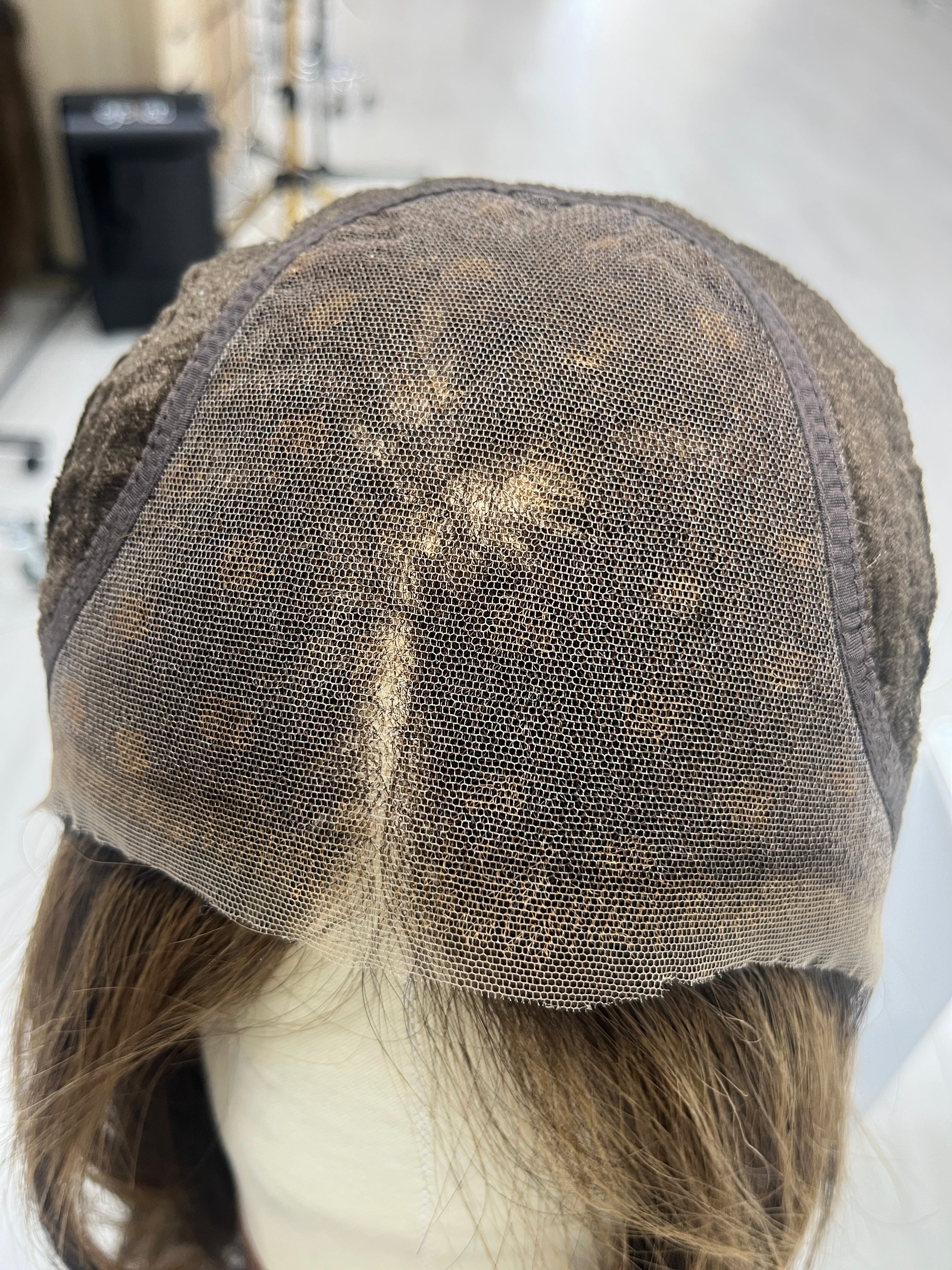 Other: Medium to medium light density (about 120-125%). The lace is cut with room to further customize. Knots are lightly bleached near the front of the hairline about less than 1 cm in. The rest of the knots are not bleached. The knots are lightly plucked. The lace top has spots where knots are lighter (spot staining - see photos for reference). There is some loose thread by one of the adjustable straps that does not affect the integrity of the piece. There is a small light stain inside the cap that is not visible.