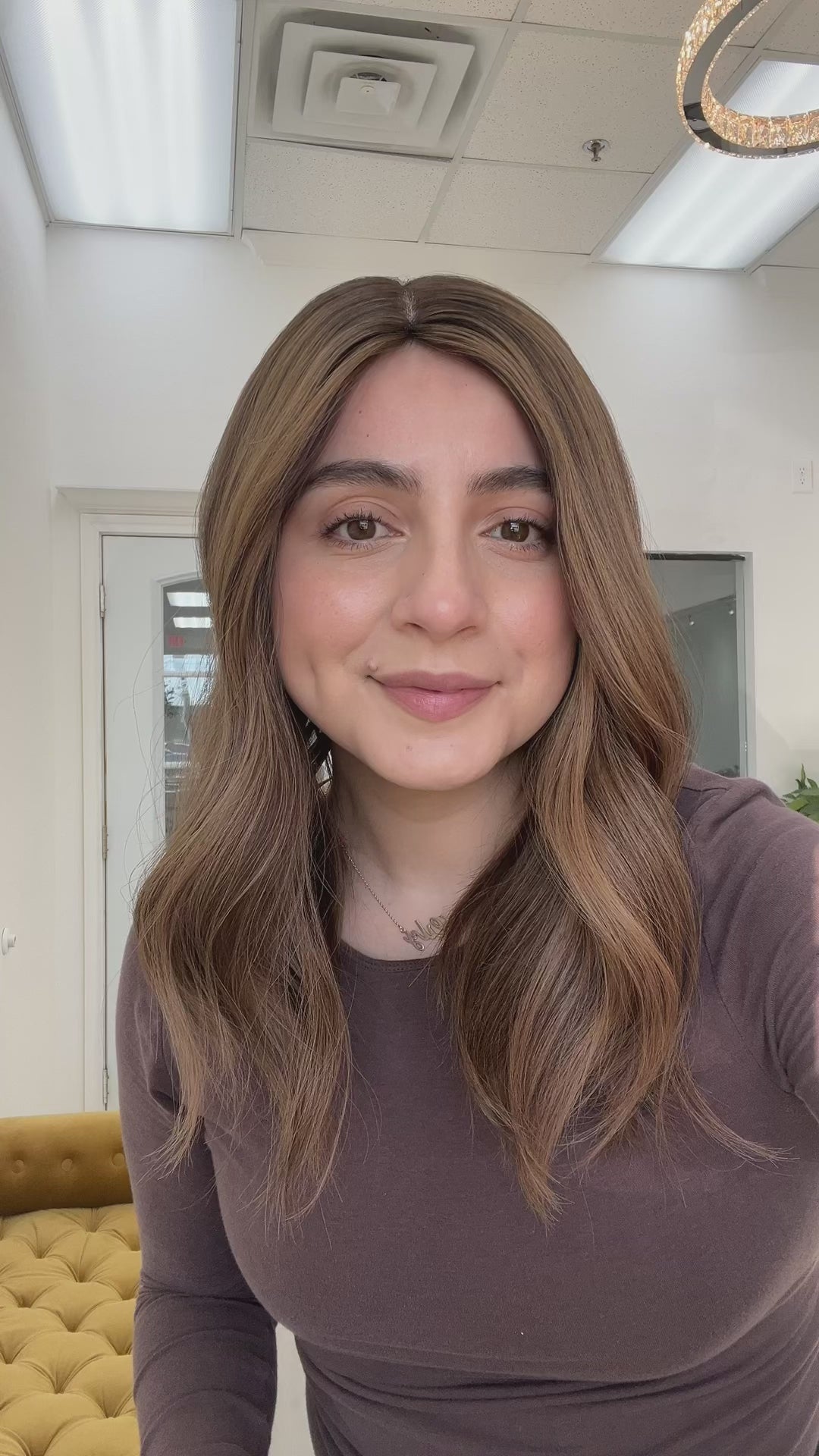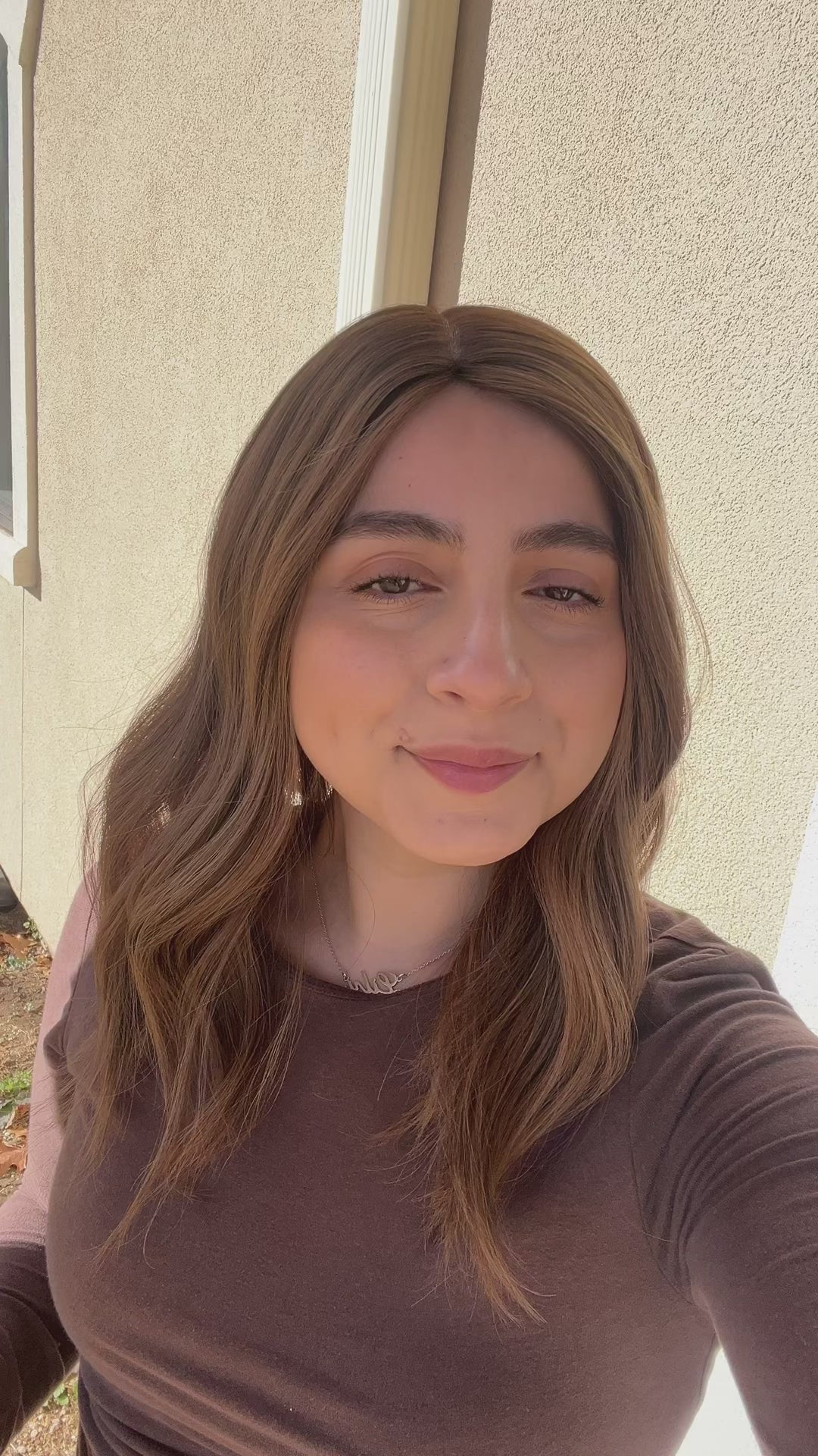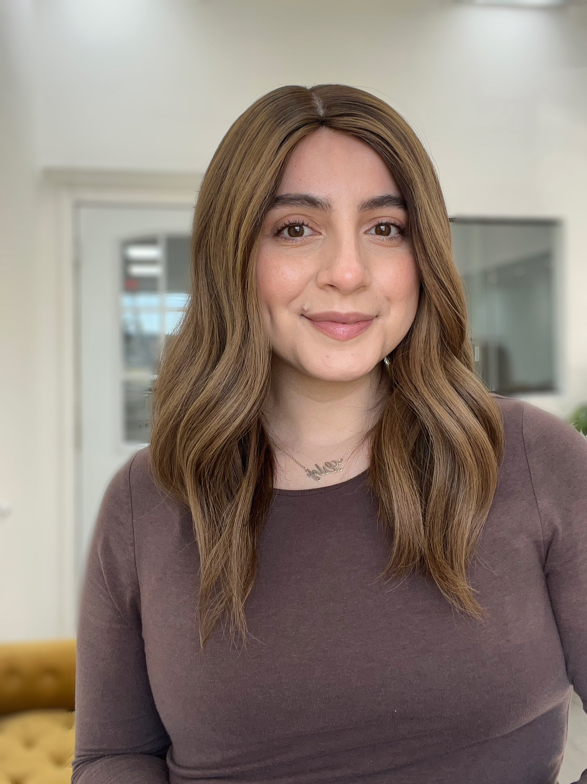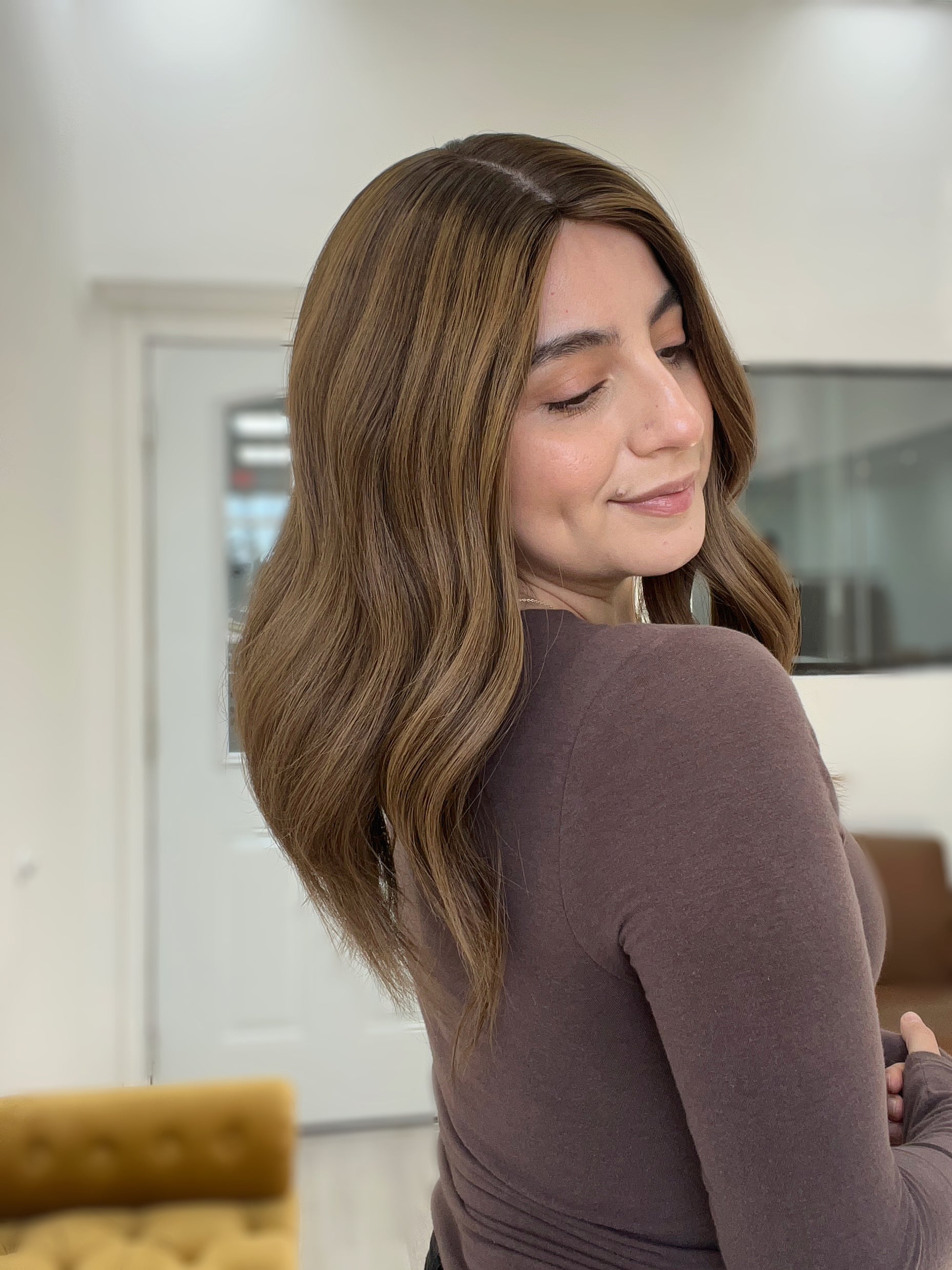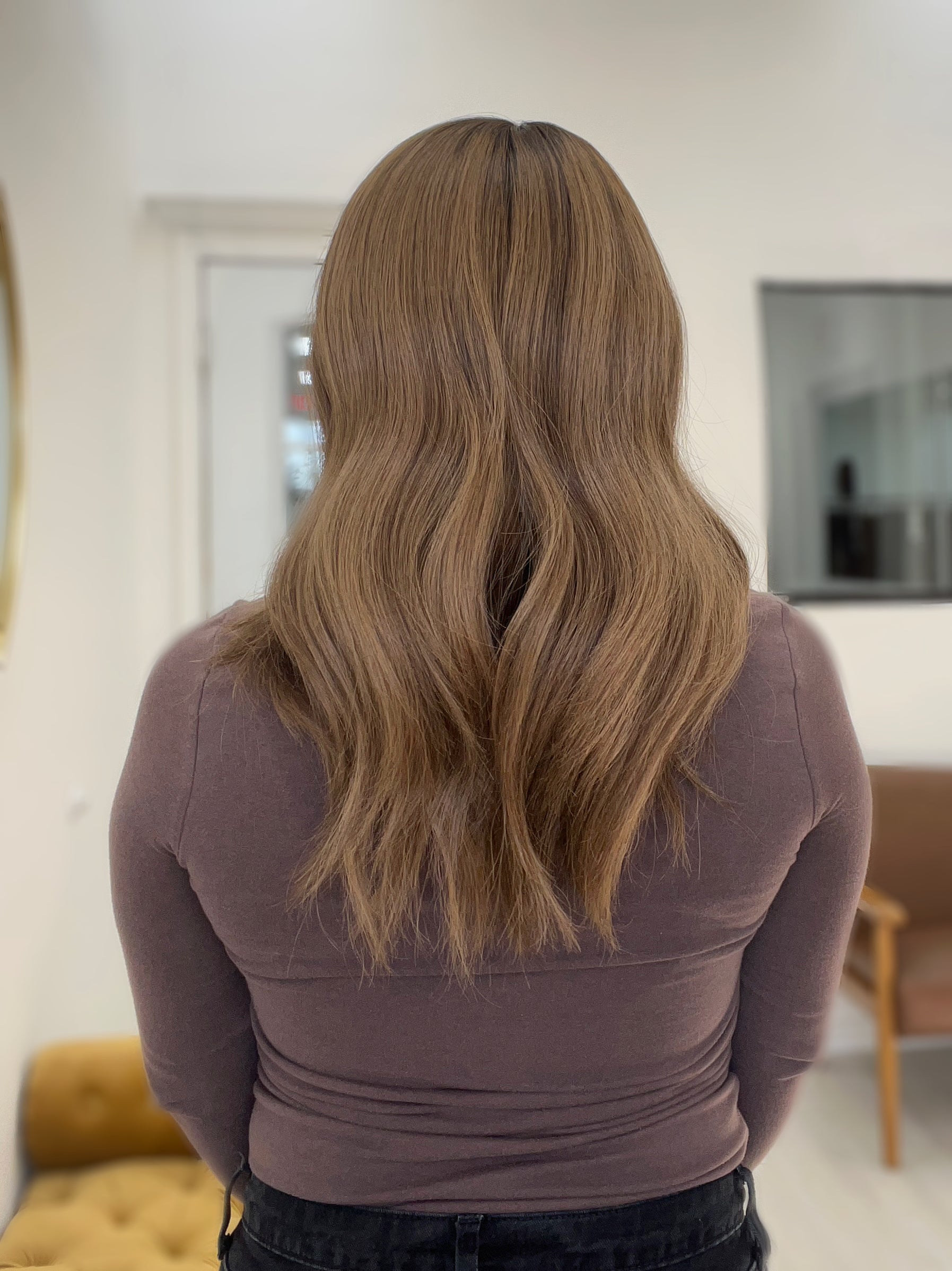 Color: Medium neutral brown root/base into a lighter neutral honey balayage with brighter honey baby lights and darker neutral brown lowlights