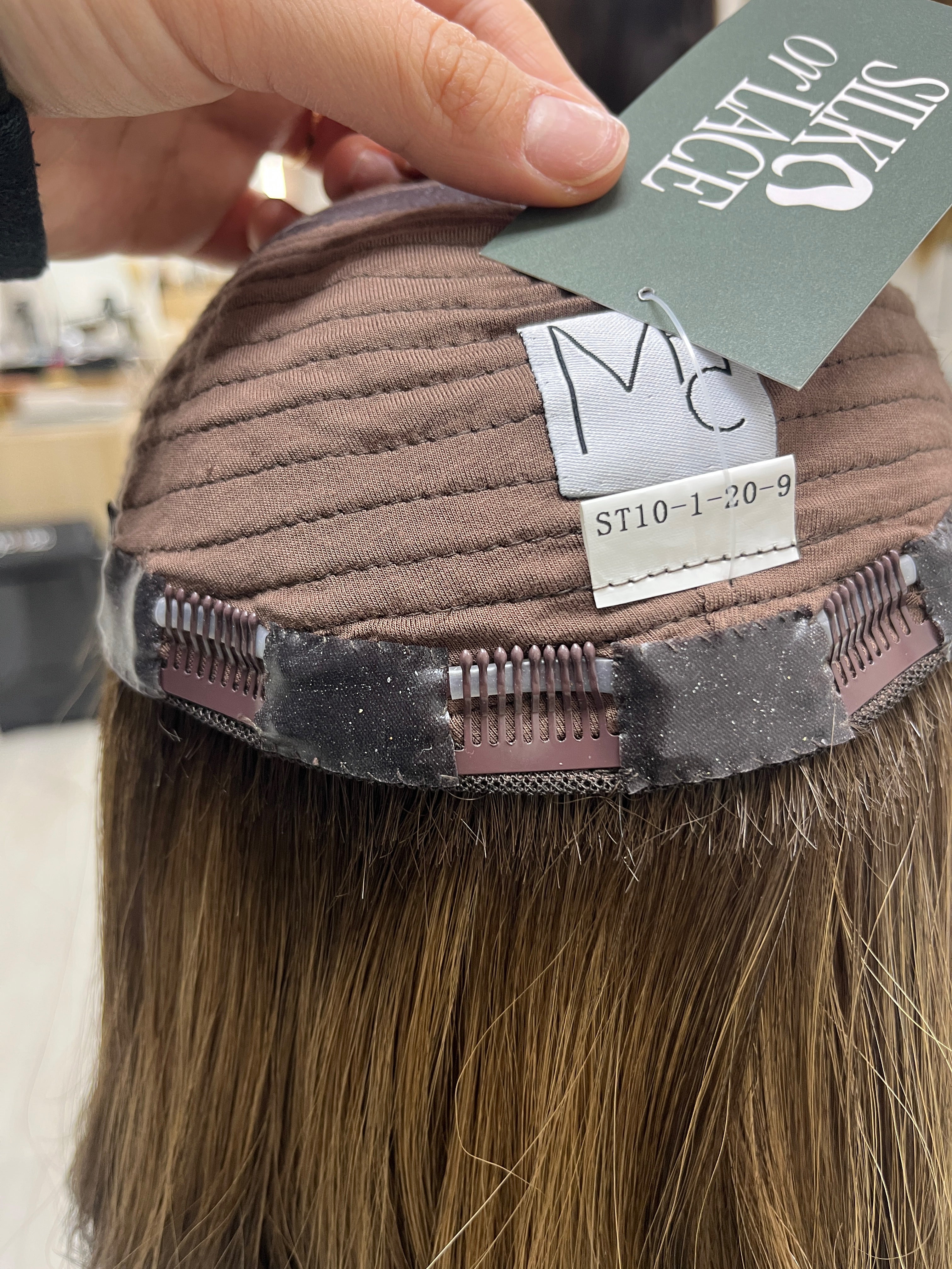 This is a beautiful silk top topper from Madison Hair Collection. The silicone lining and t-shirt like fabric makes this hair topper have a super comfortable fit with extra security. The bigger cap size is a great option for someone looking for lots of coverage that molds over the top of your head. If you've been looking for a neutral brunette topper for hair thinning then this one is for you!