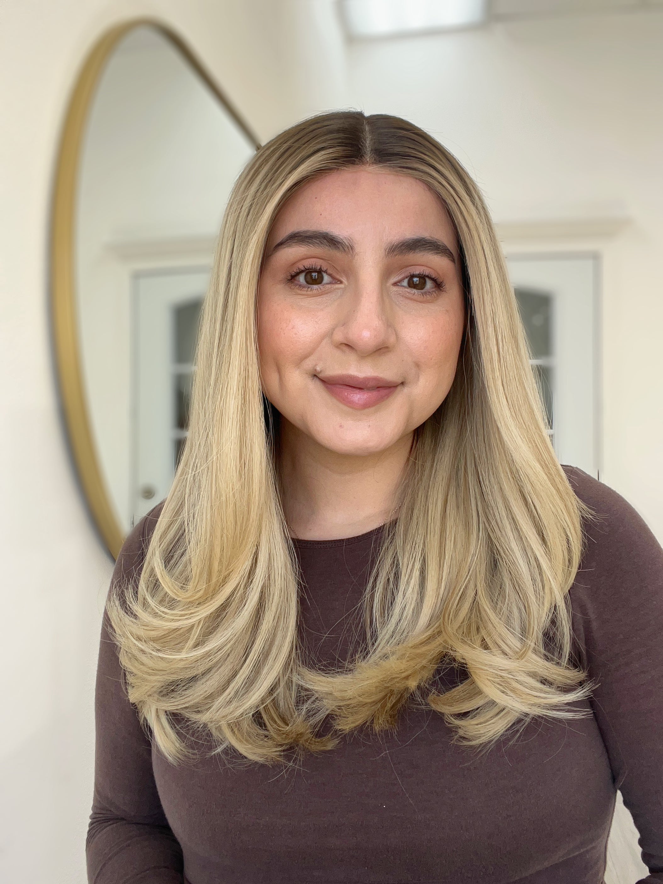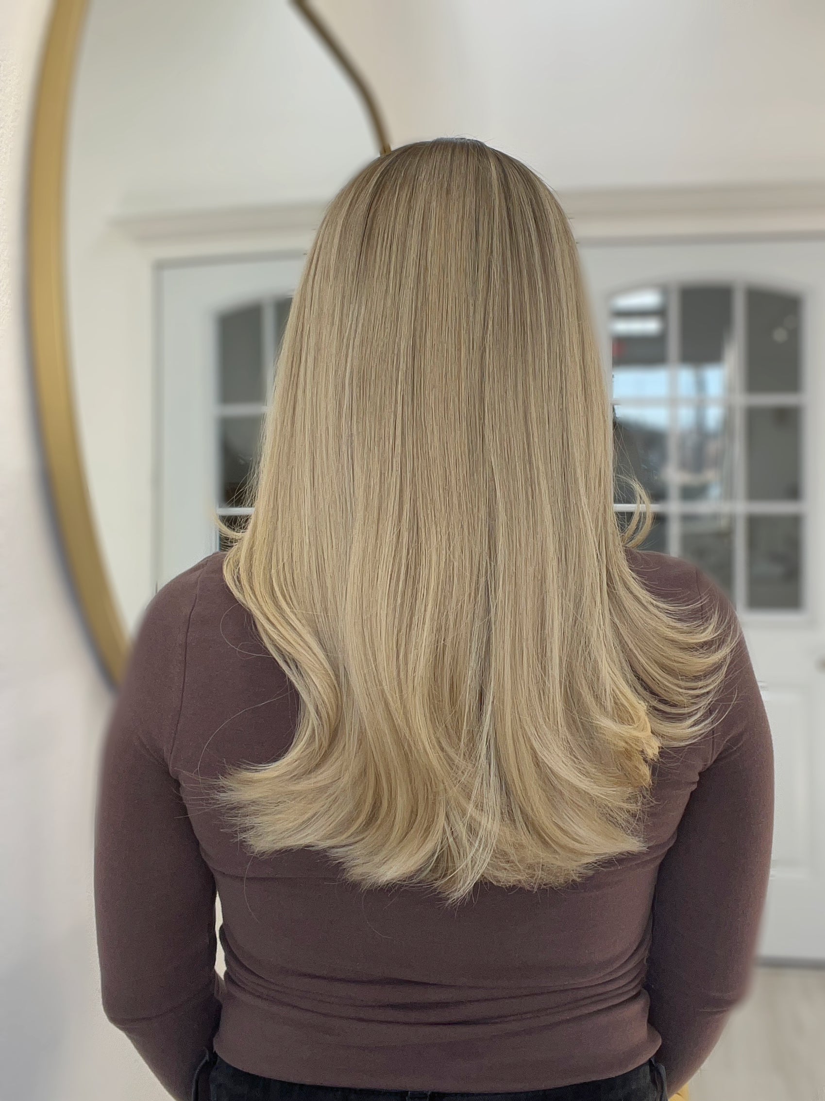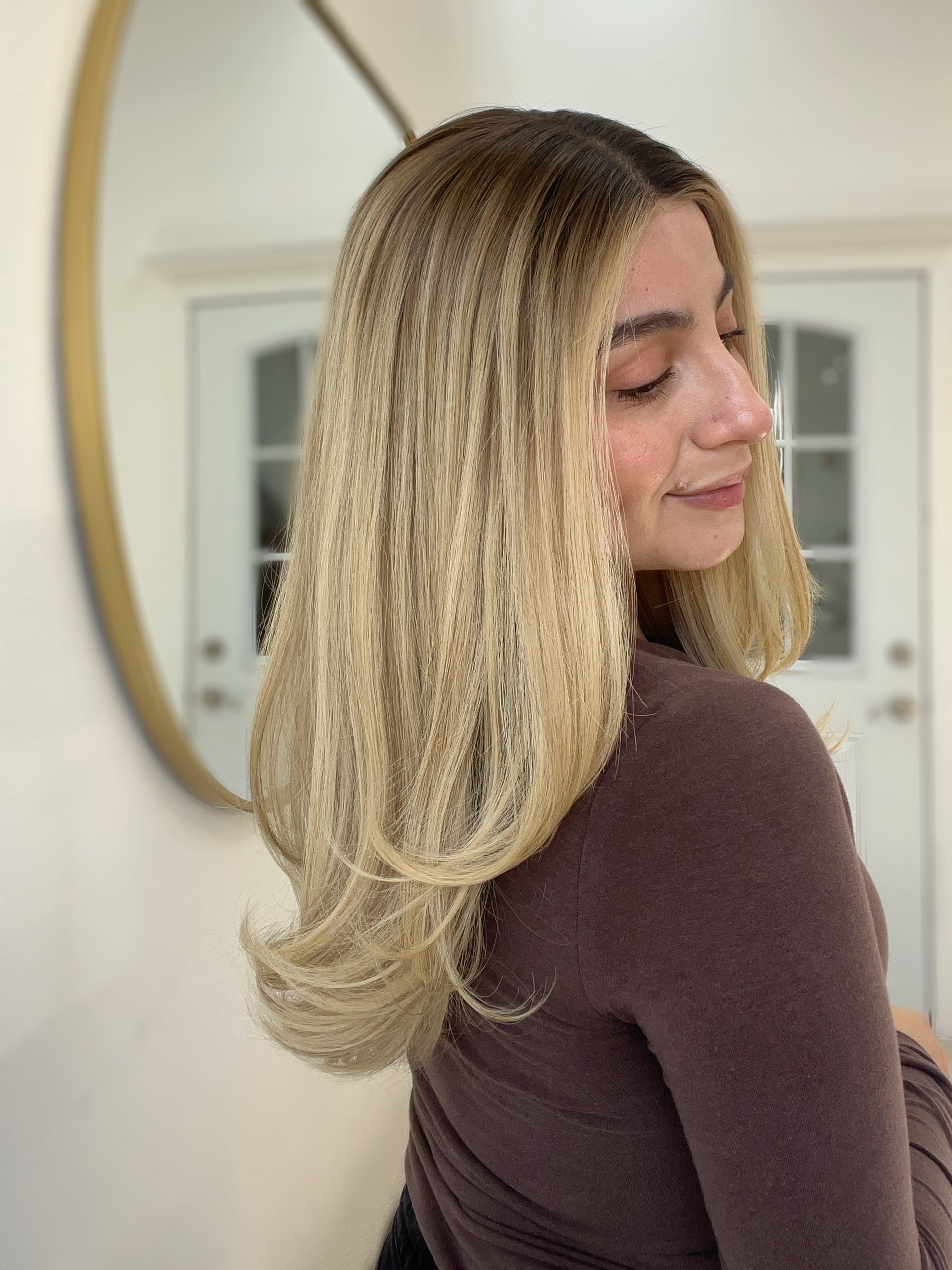 Color: Dark neutral brown root into a platinum buttery blonde with neutral lowlights and brighter face framing