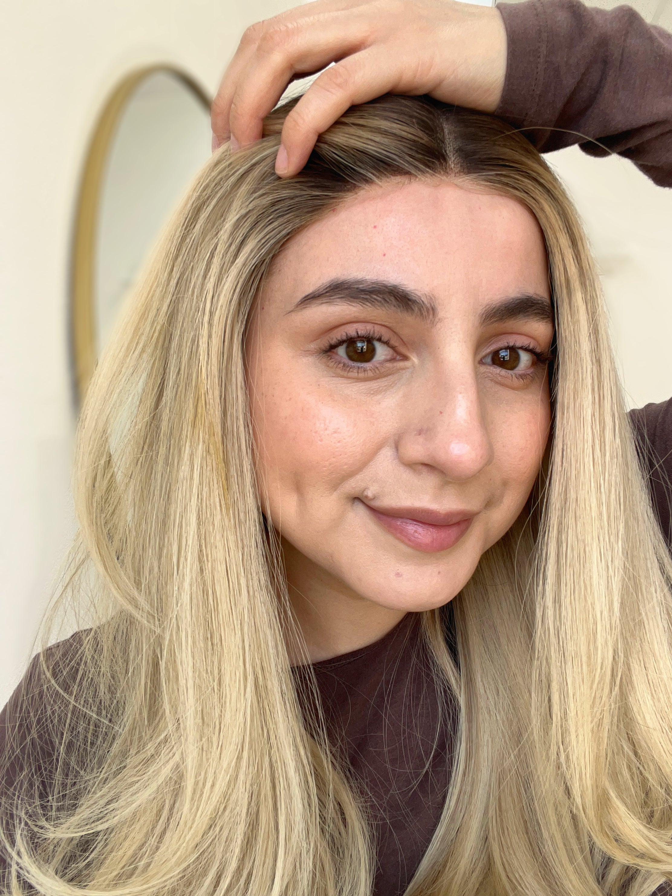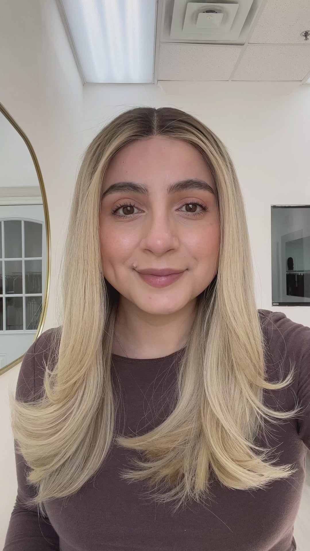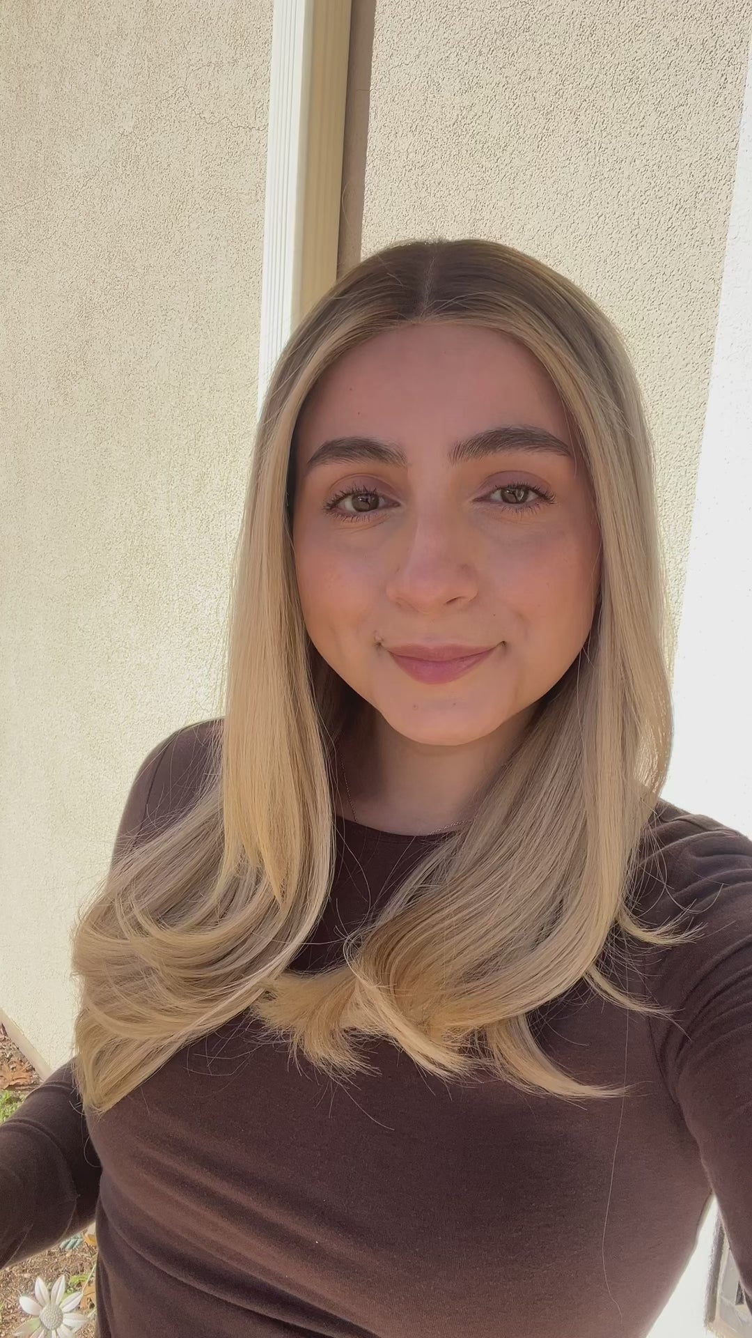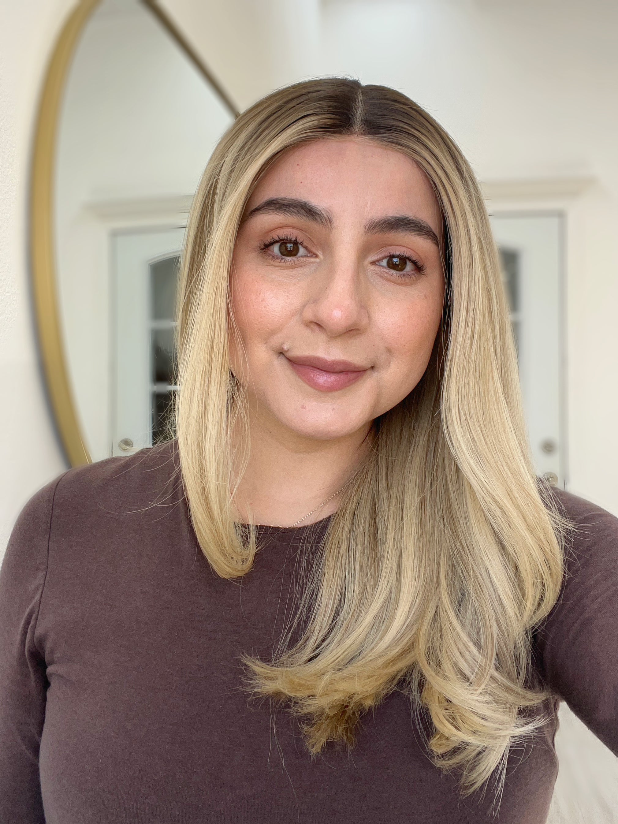 Color: Dark neutral brown root into a platinum buttery blonde with neutral lowlights and brighter face framing