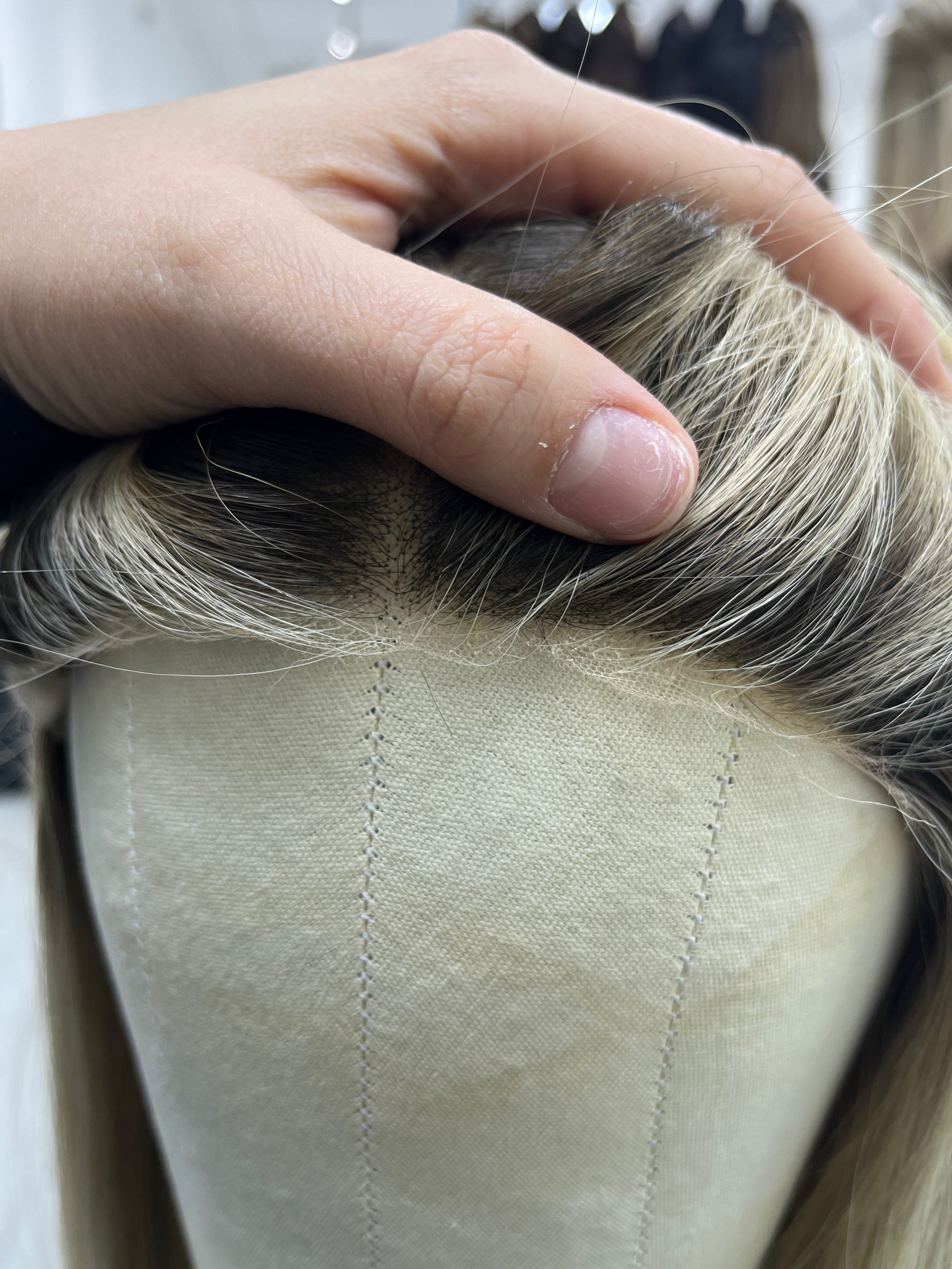 Other: Medium light density (about 120-125%). The lace is cut very close to the hairline in a jagged, uneven method with a bit of fraying. There is one small area where the lace is cut further in a zig zag way (pictured) that is only visible when parted in this area. Knots are naturally lighter due to the color/face framing near the front of the hairline about 1 cm in. The rest of the knots are not bleached. The silk liner is cut further back with fraying and loose thread that can be cut further down. There is a small hole on the silk liner in one area and staining that is not visible on the outside. Light makeup staining on the lace that is visible in those areas. One clip is loose and will need to be re-sewn.