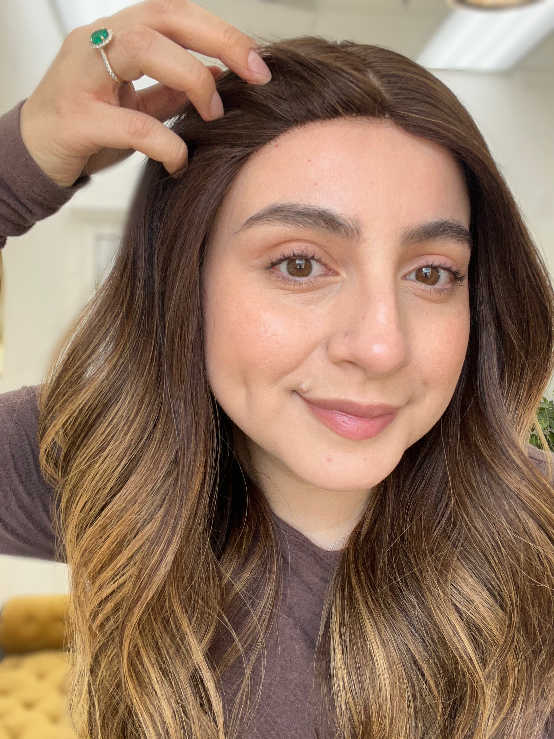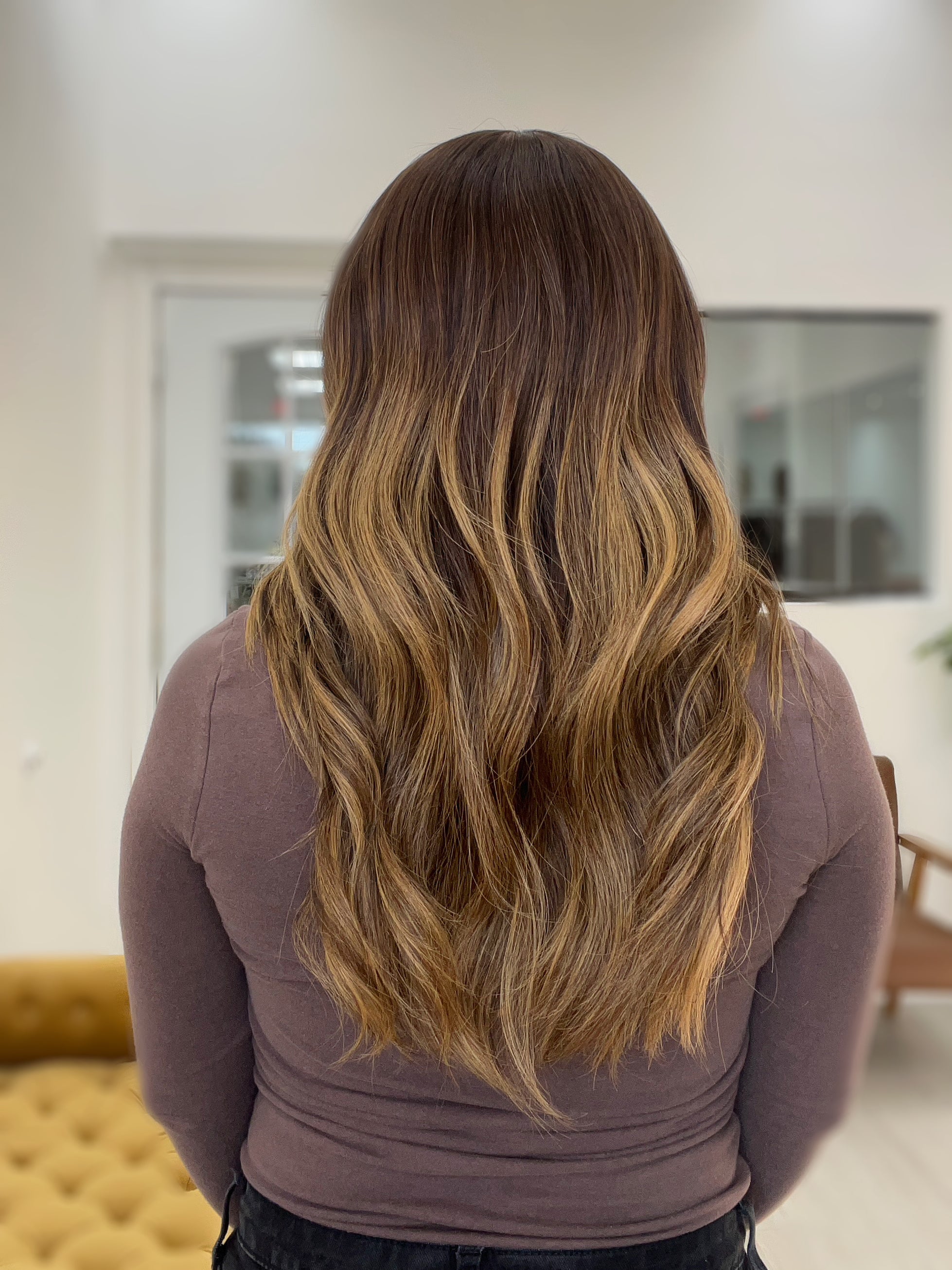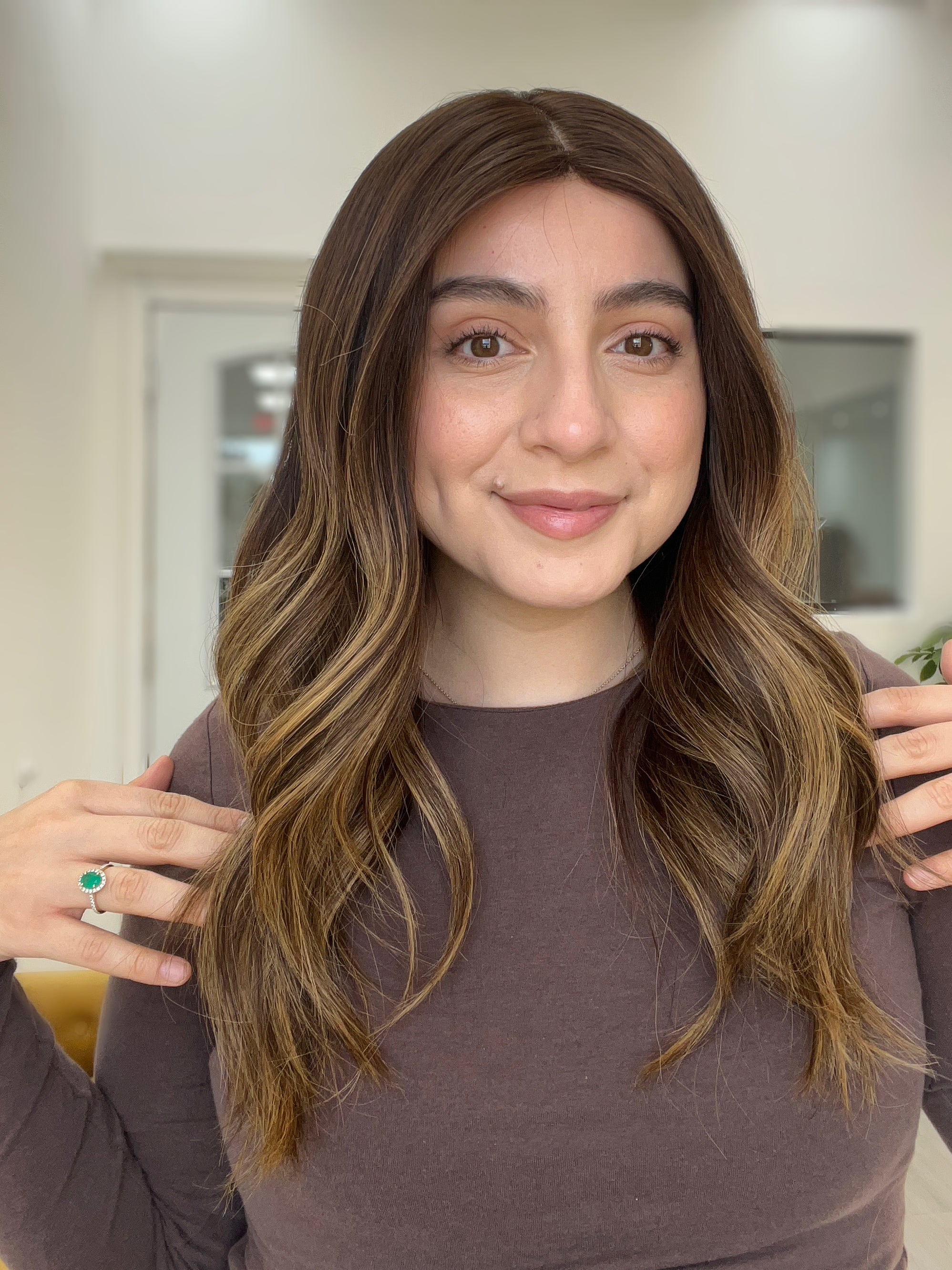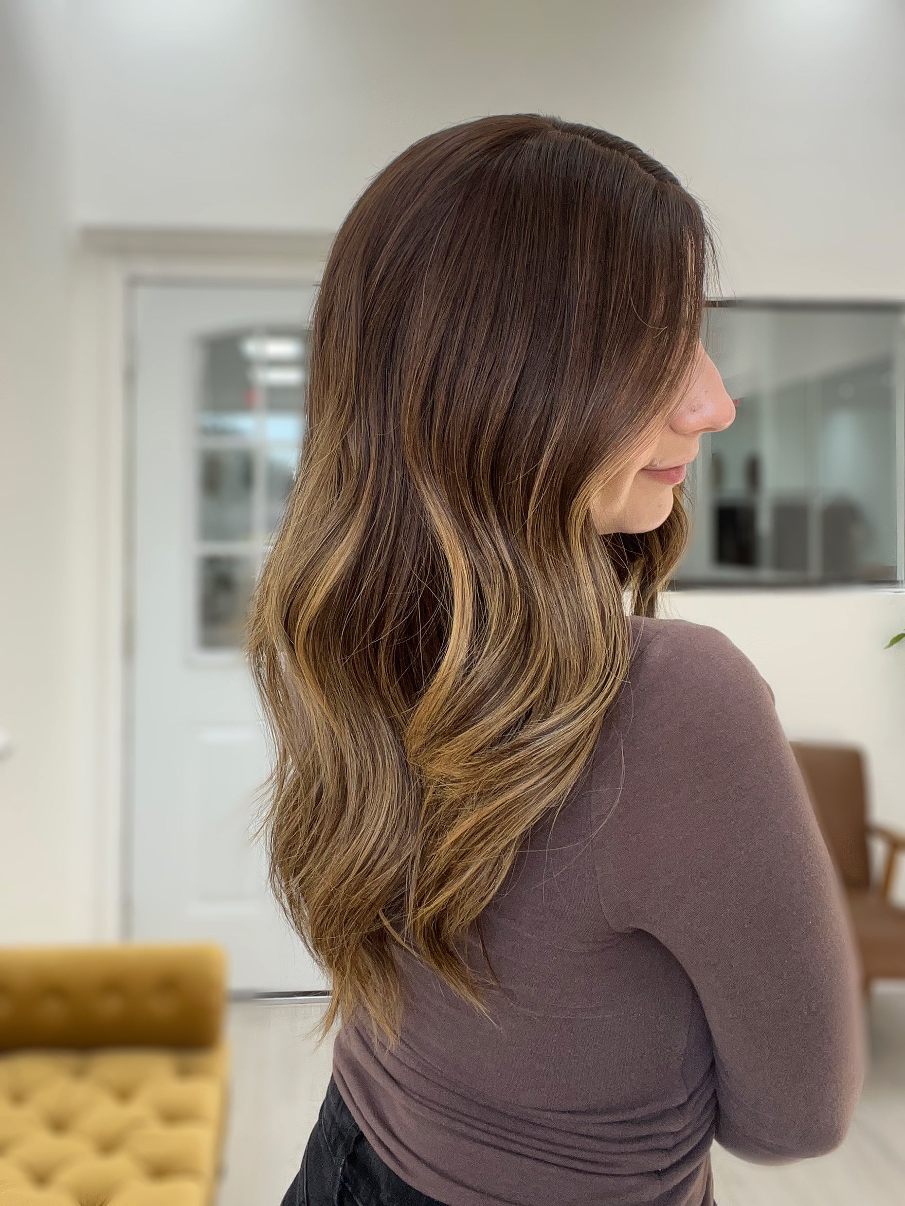 Color: Dark medium brown base with caramel blonde balayage
