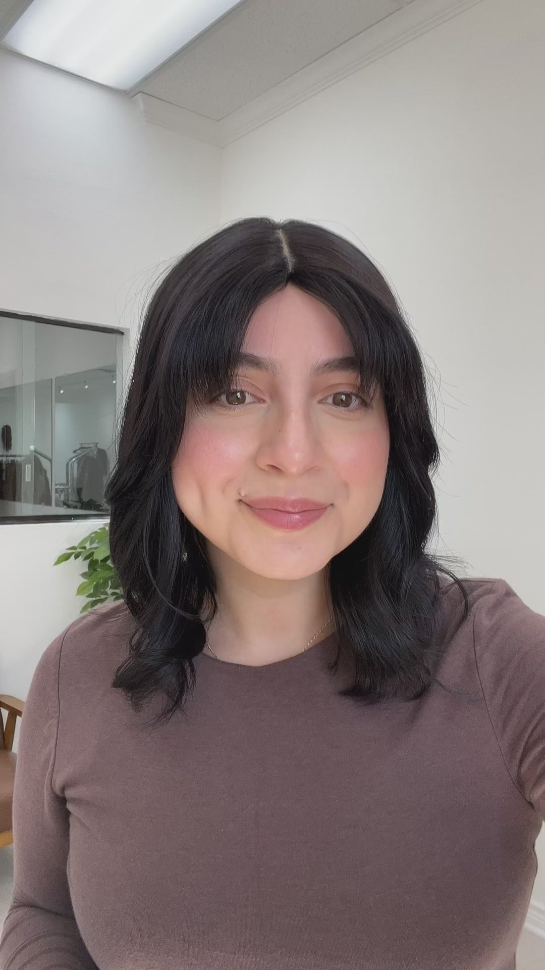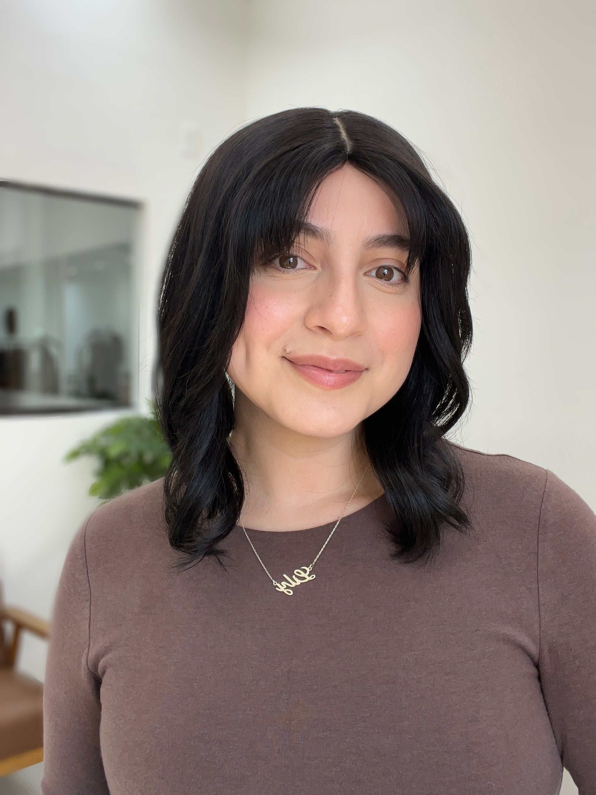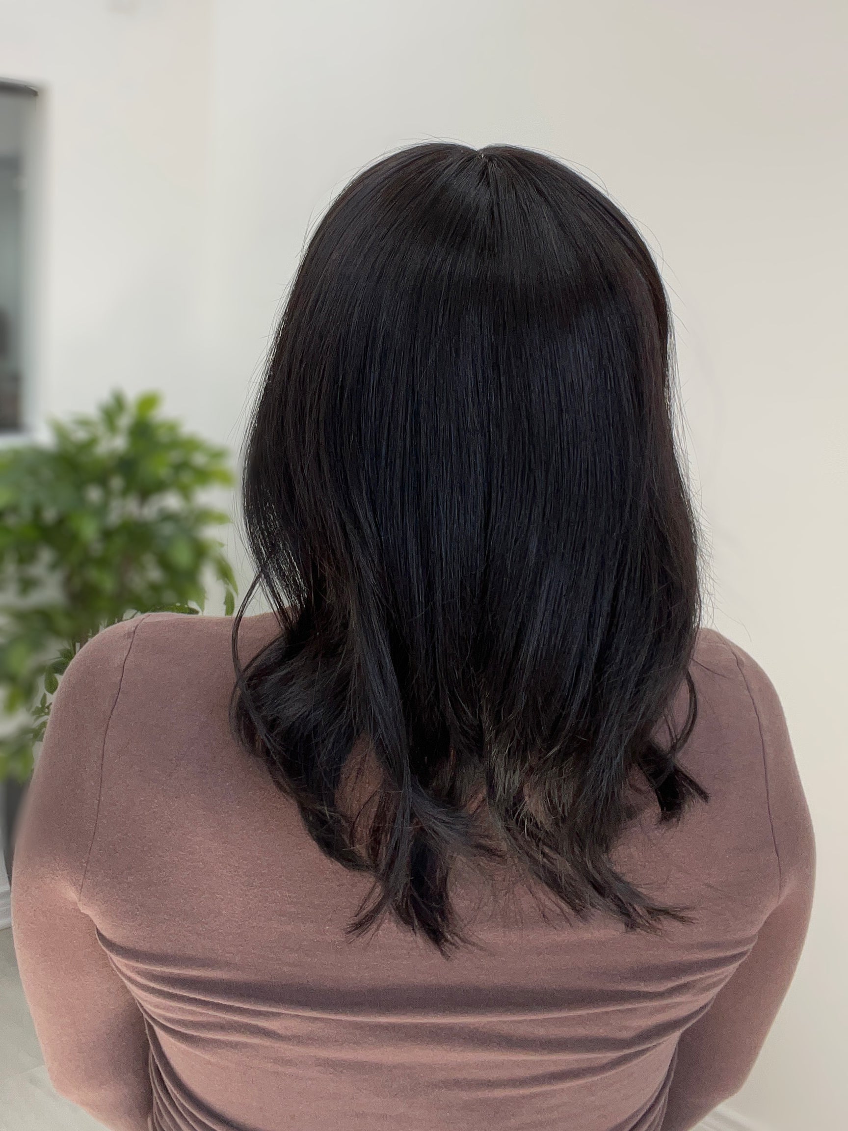 This a beautiful black topper! The soft layers with bangs adds lots of dimension. Hair is silky soft and this topper is a great option for someone looking for coverage with a lightweight fit.