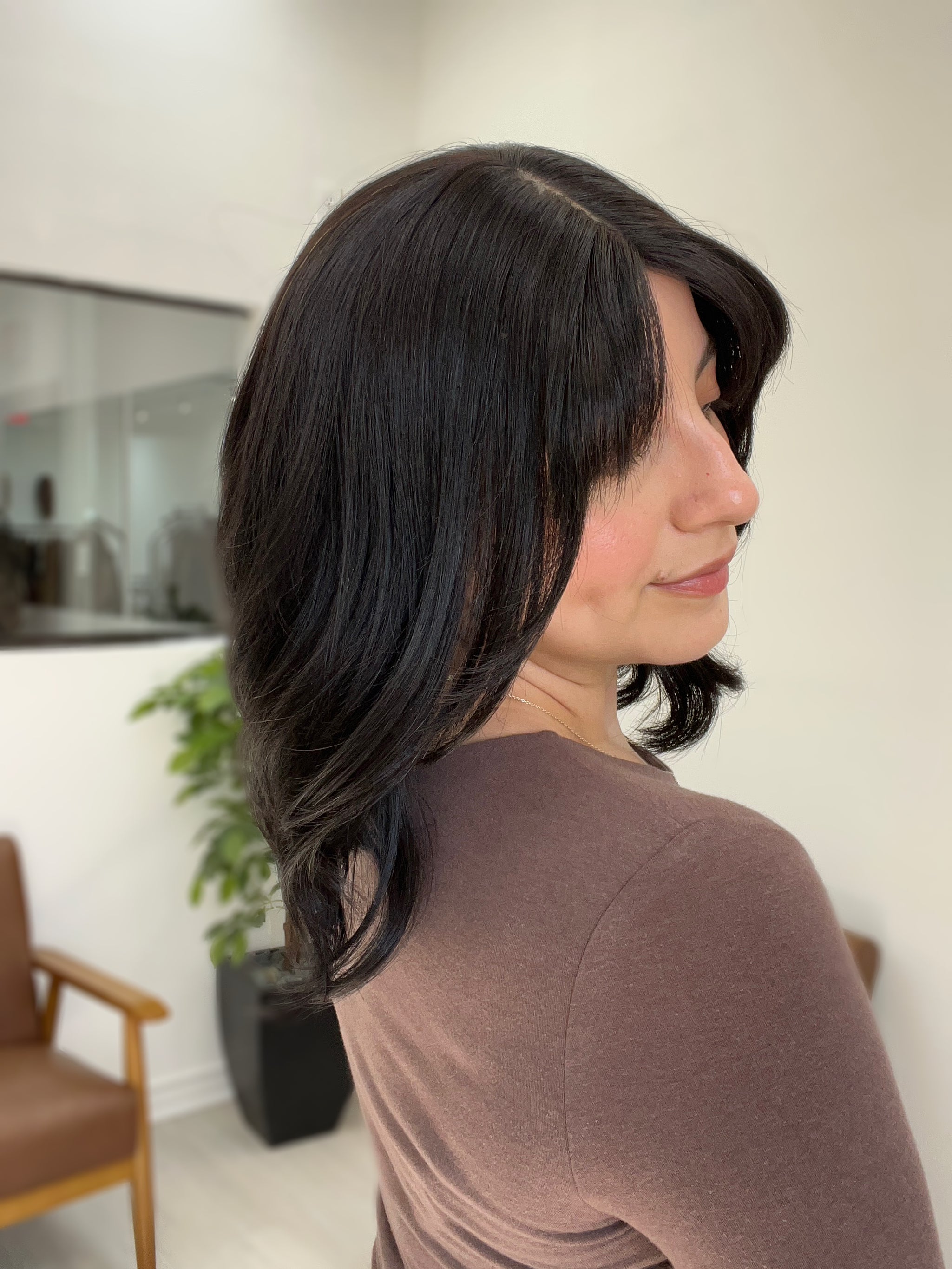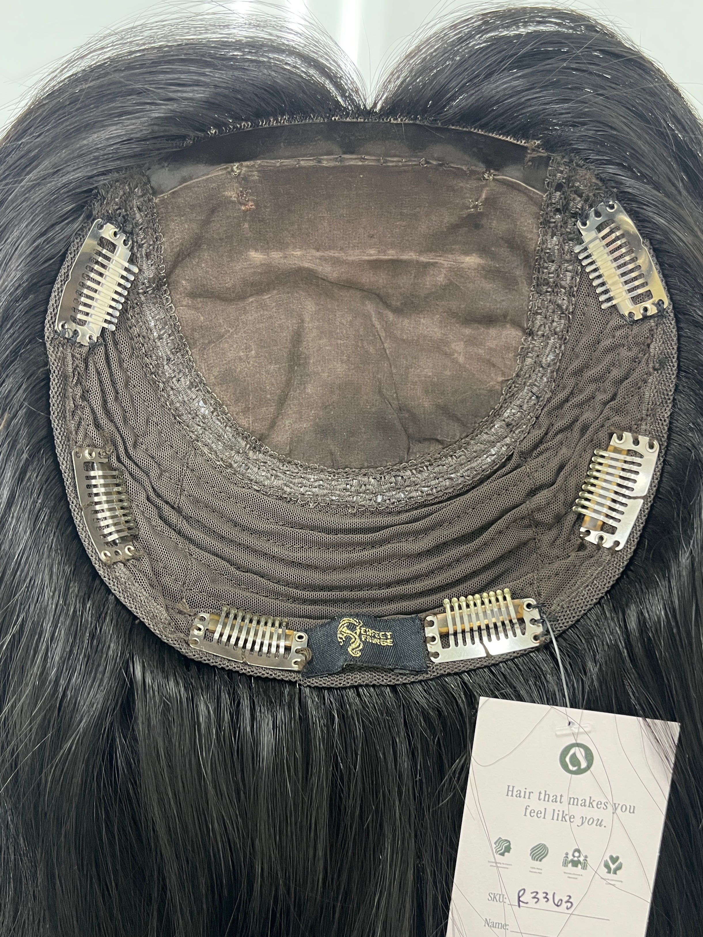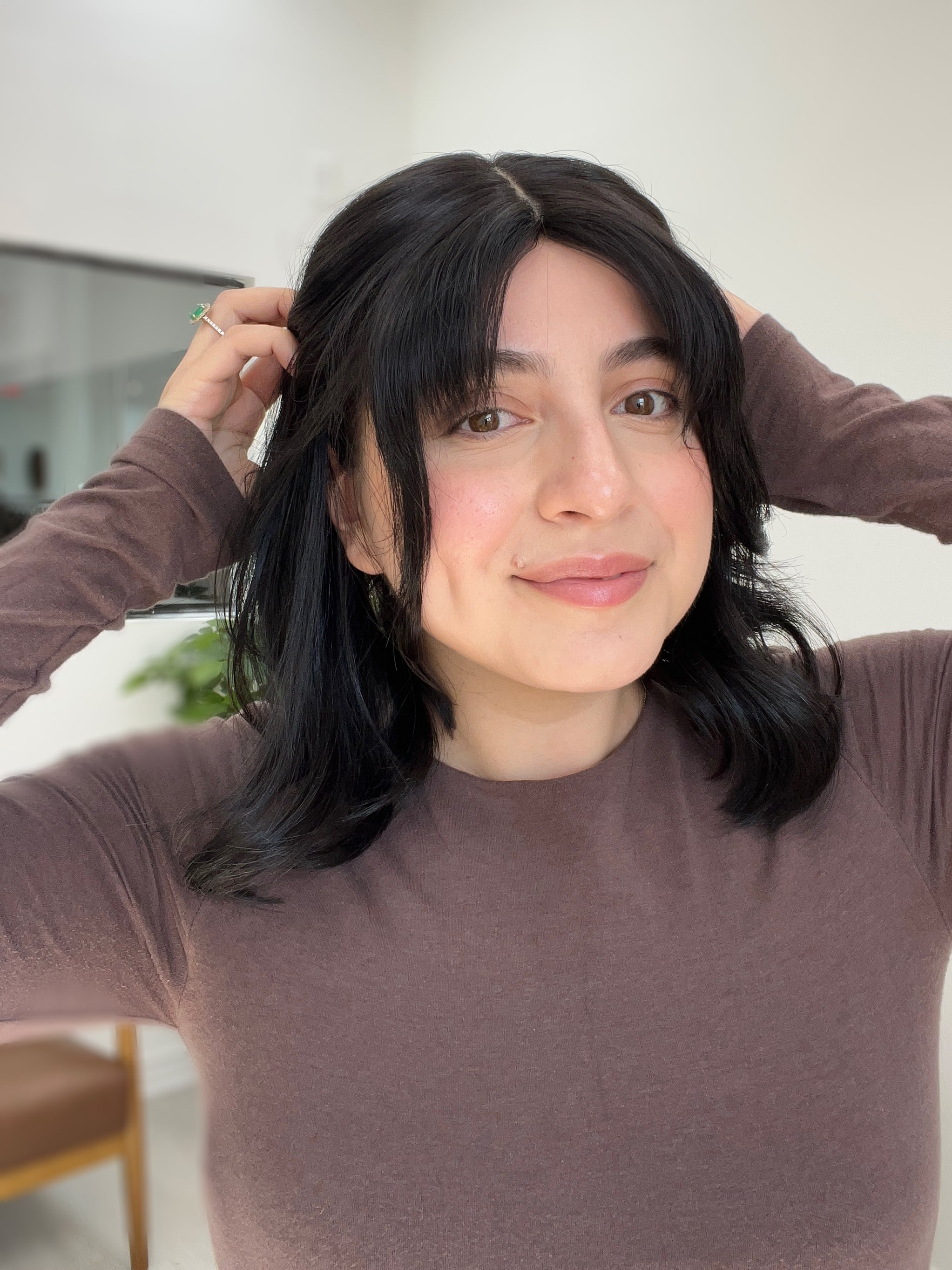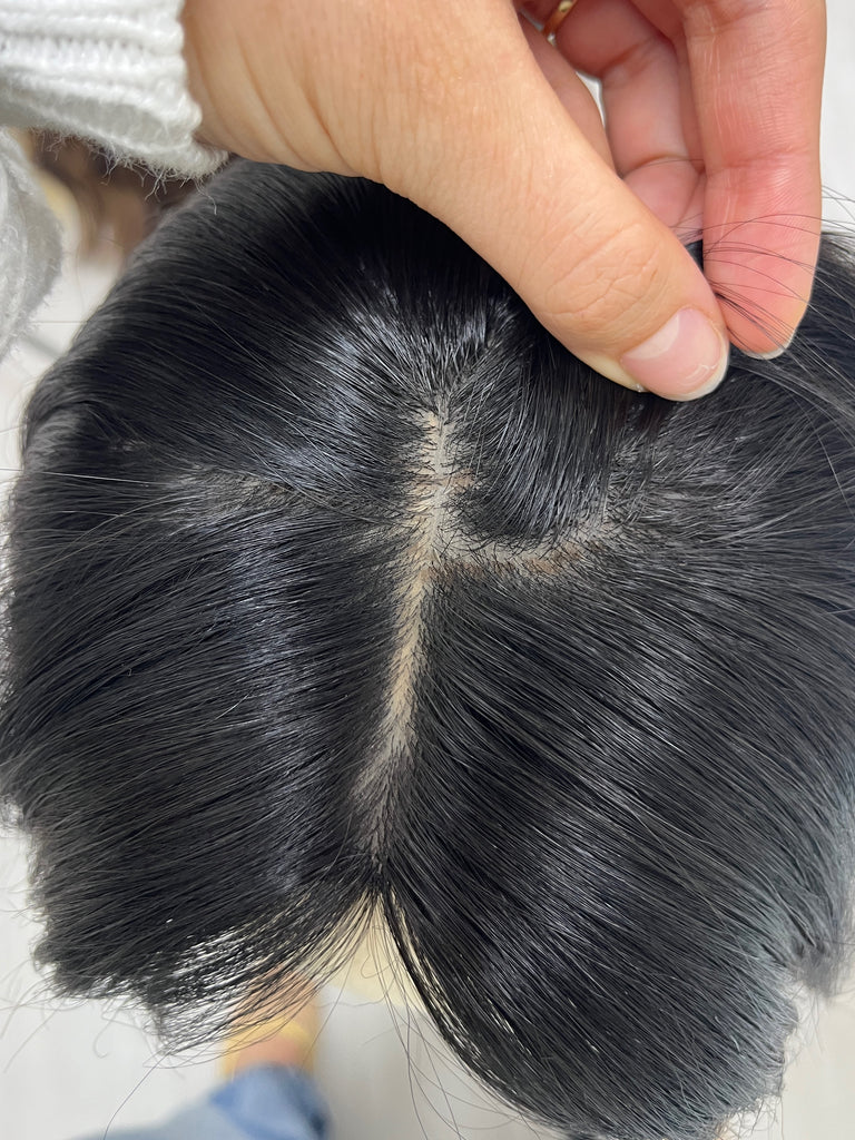 This a beautiful black topper! The soft layers with bangs adds lots of dimension. Hair is silky soft and this topper is a great option for someone looking for coverage with a lightweight fit.