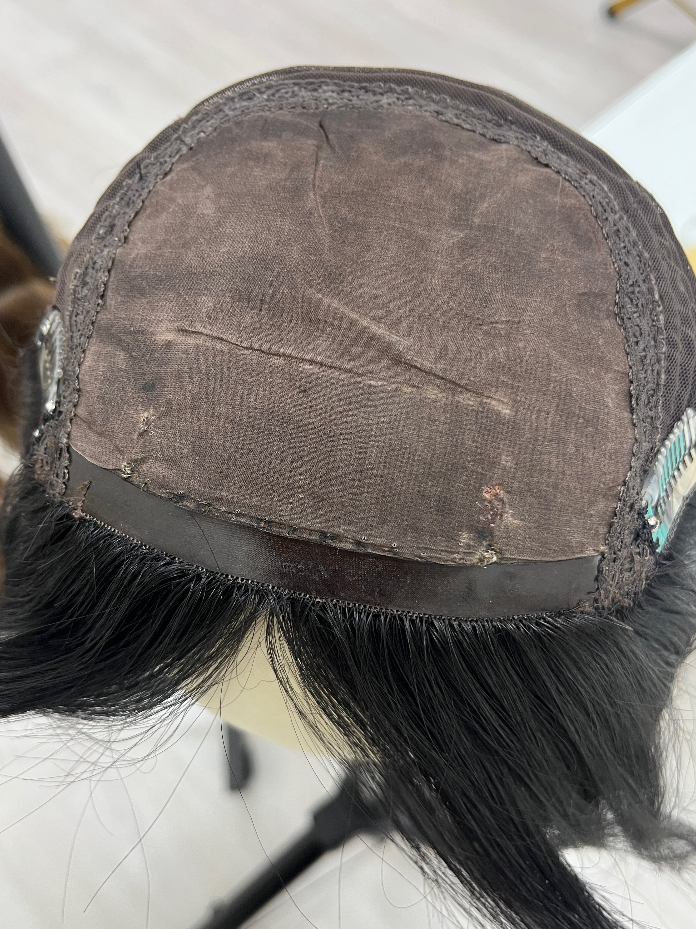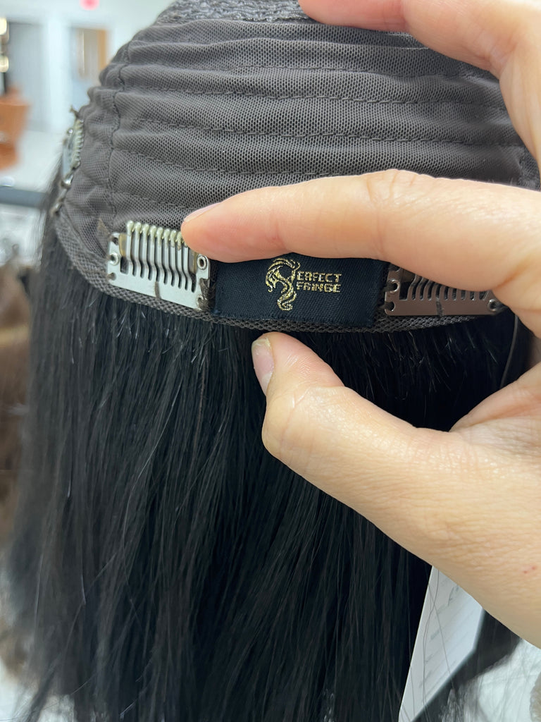 Other: Light density (about 115%). There is light discoloration on the silk top that is not visible on the outside. The comb has been removed by the Perfect Fringe team. One of the clips is very slightly loose and may need to be re-sewn/tightened over time. The silk top has blue-ish staining and light makeup staining that is visible in those areas (see photos for reference).