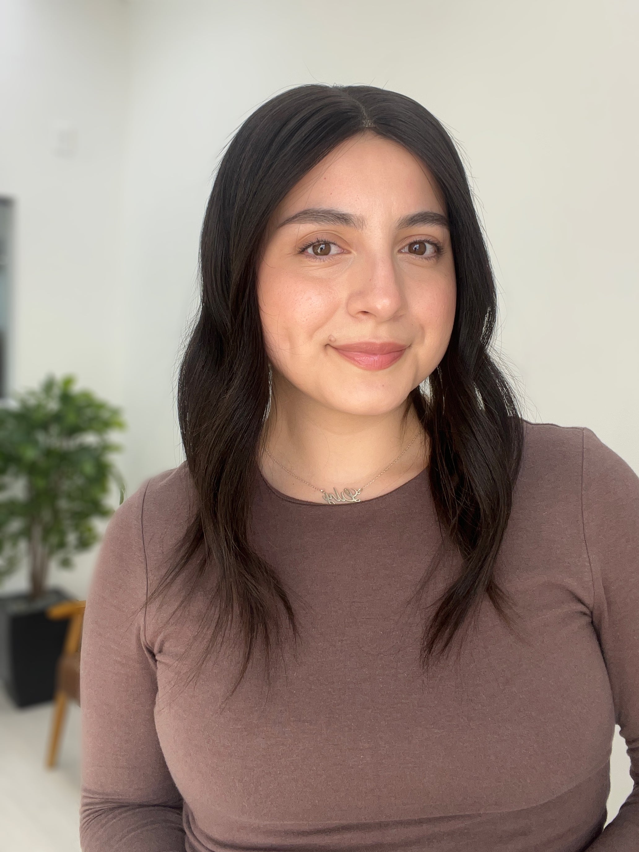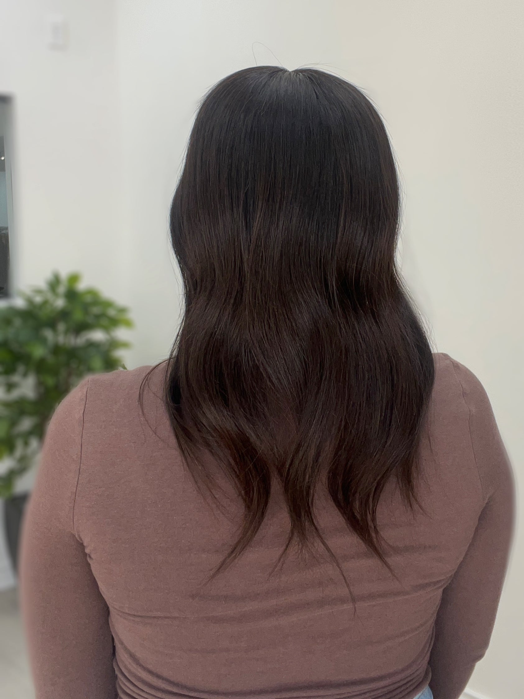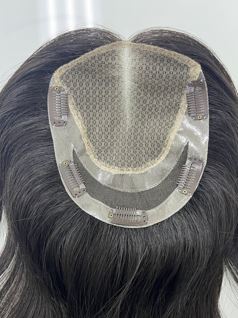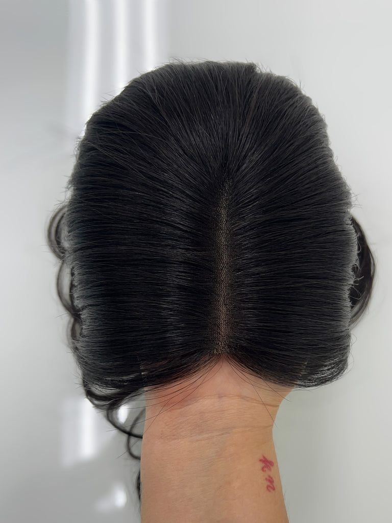 This silky soft closed lace topper features a smaller cap size that focuses on coverage primarily on the top of the crown. It is fully hand tied with PU lining that provides a very lightweight feel and the option to use adhesives to bond. In new, pristine condition - this is a great find for someone looking for a mini topper in a classic soft black color to blend with their hair.