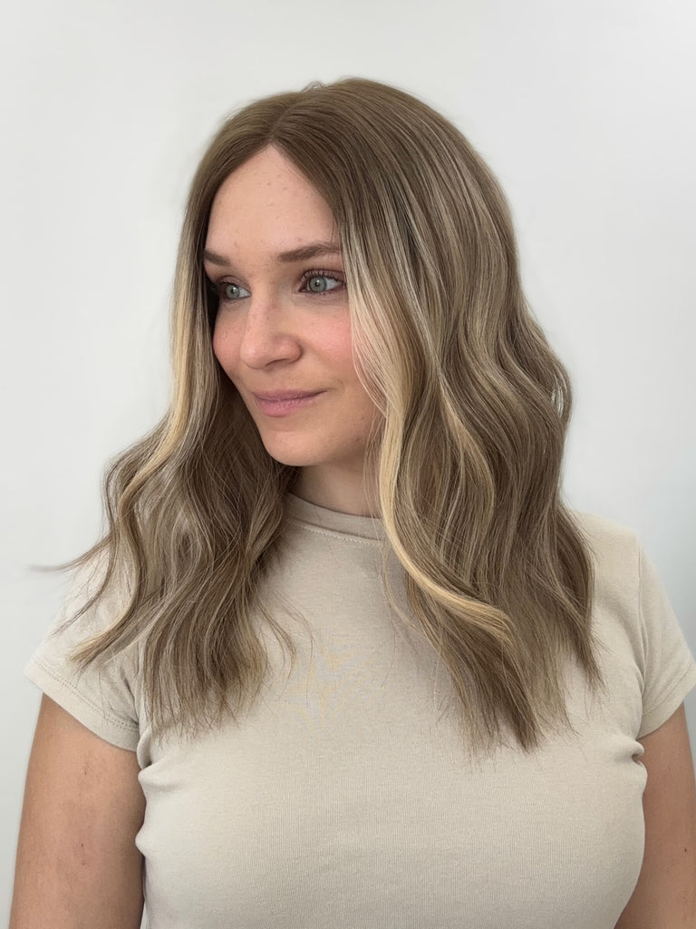 Color: Dimensional, 90s blonde highlights with warm dirty-blonde base