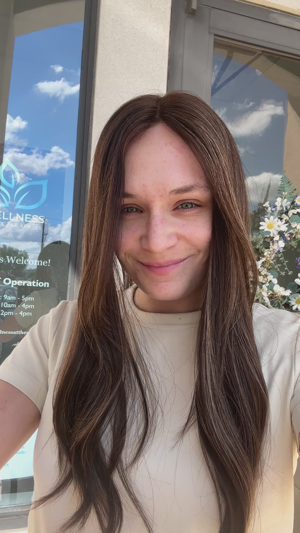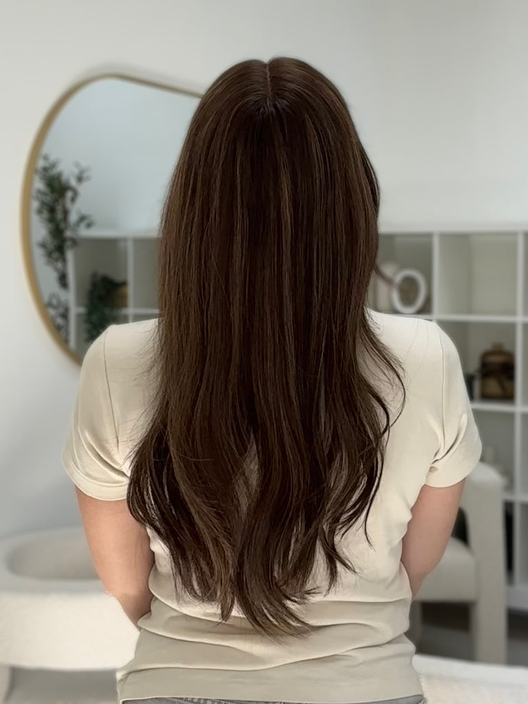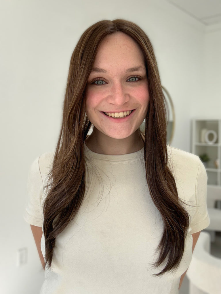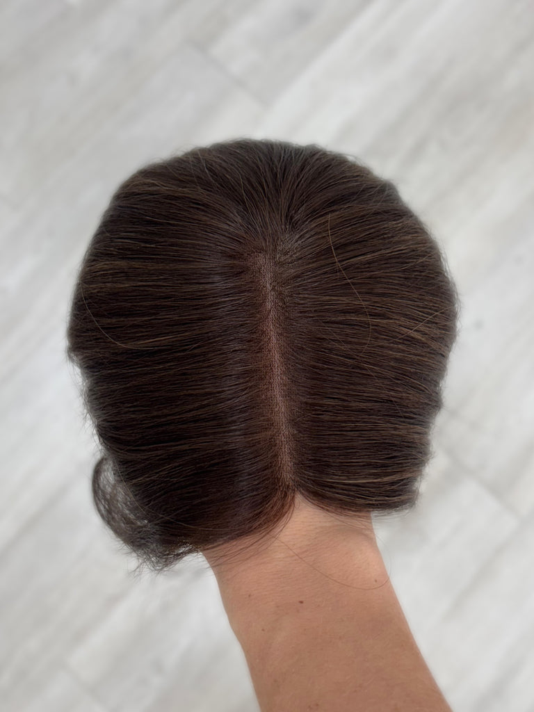 Color: Ashy dark brown base with toffee highlights. A slightly darker but same level of ash base than our Josephine topper