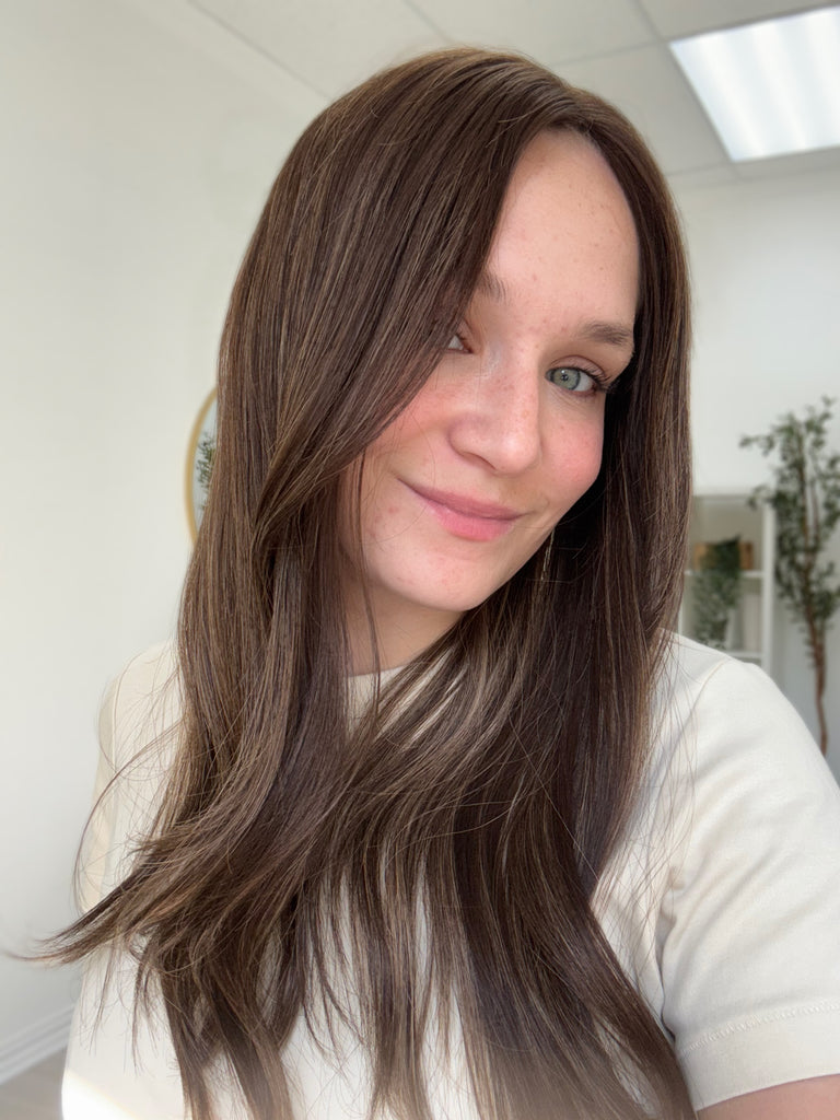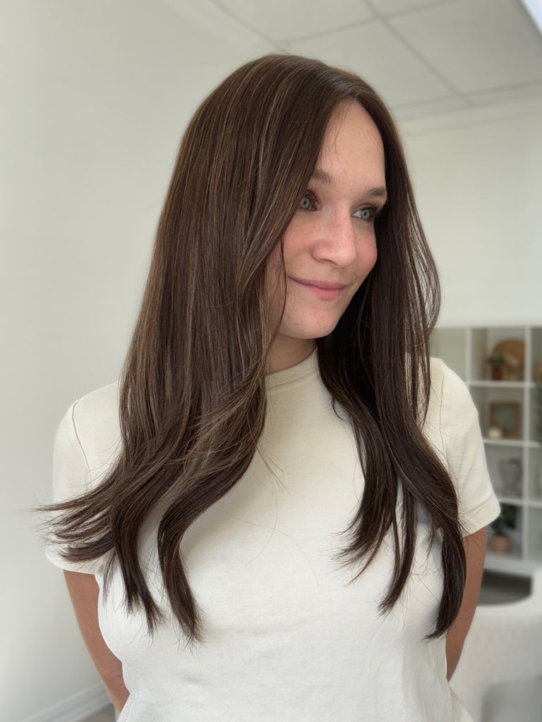 Annabelle's cool brown root is darker than Josephine but not as dark as Kim. If you have light colored eyes, this color will make them pop!