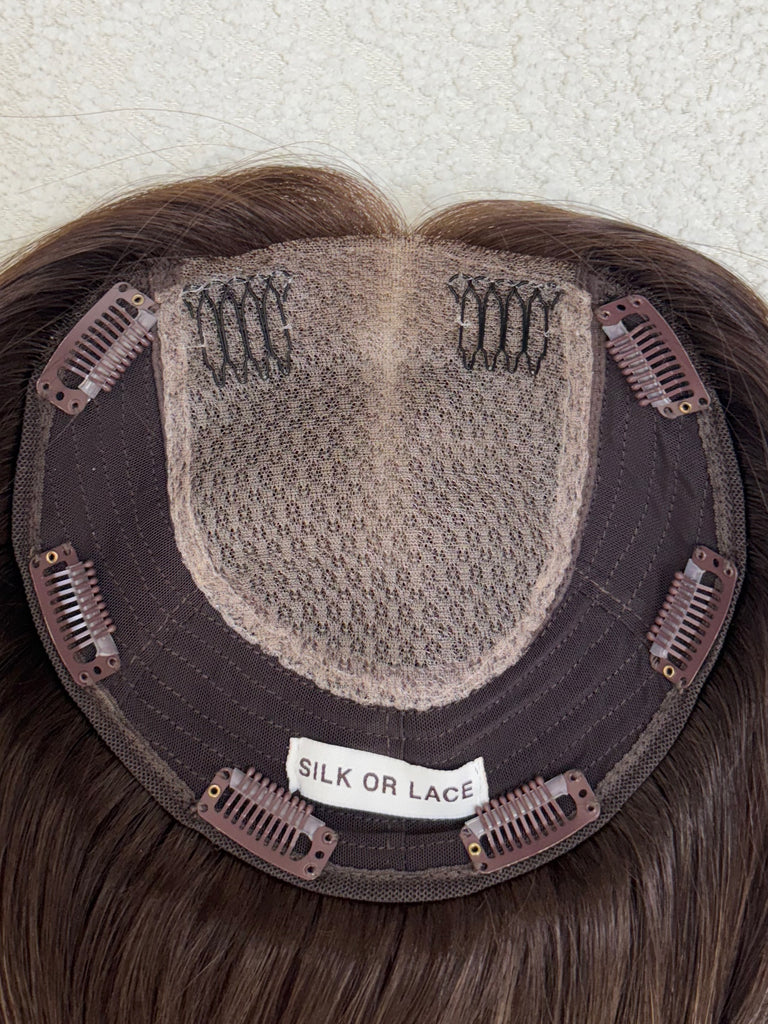 Silk or Lace Collection closed lace hair toppers function as your hair, but better! They are ultra low density, lightweight, and have a paper thin rim for an easy seamless, realistic blend for every day wear. Take note of our carefully designed details, such as our durable double lace, secure mini combs in front, and soft fine Brazilian hair!