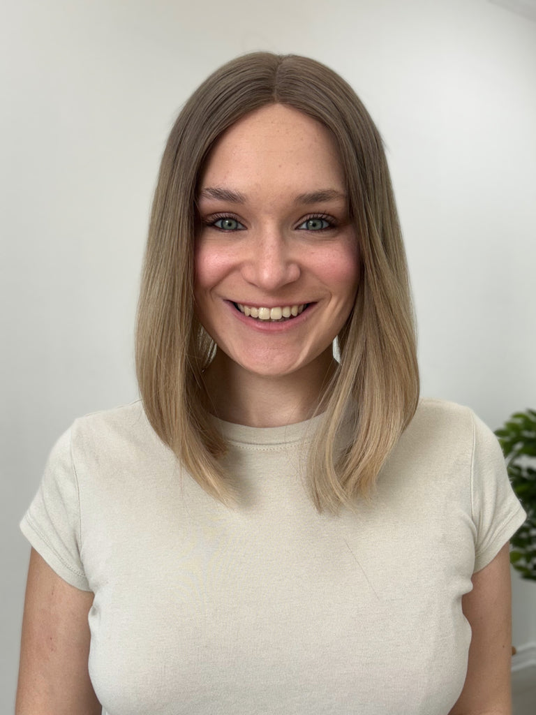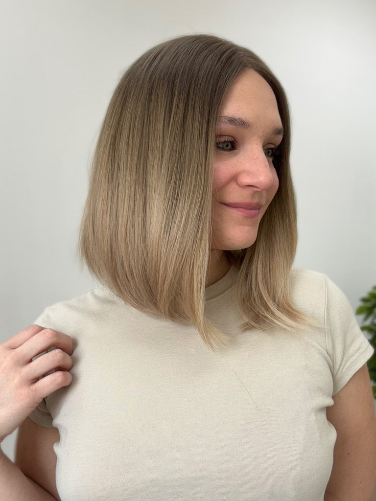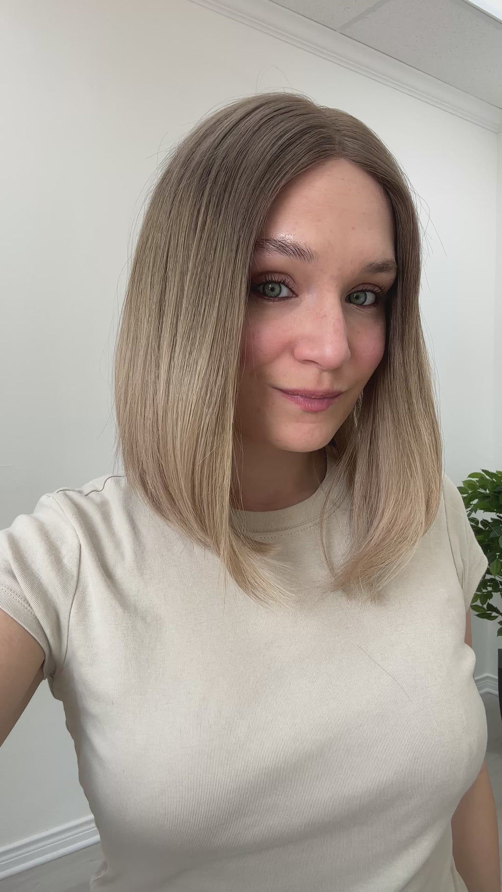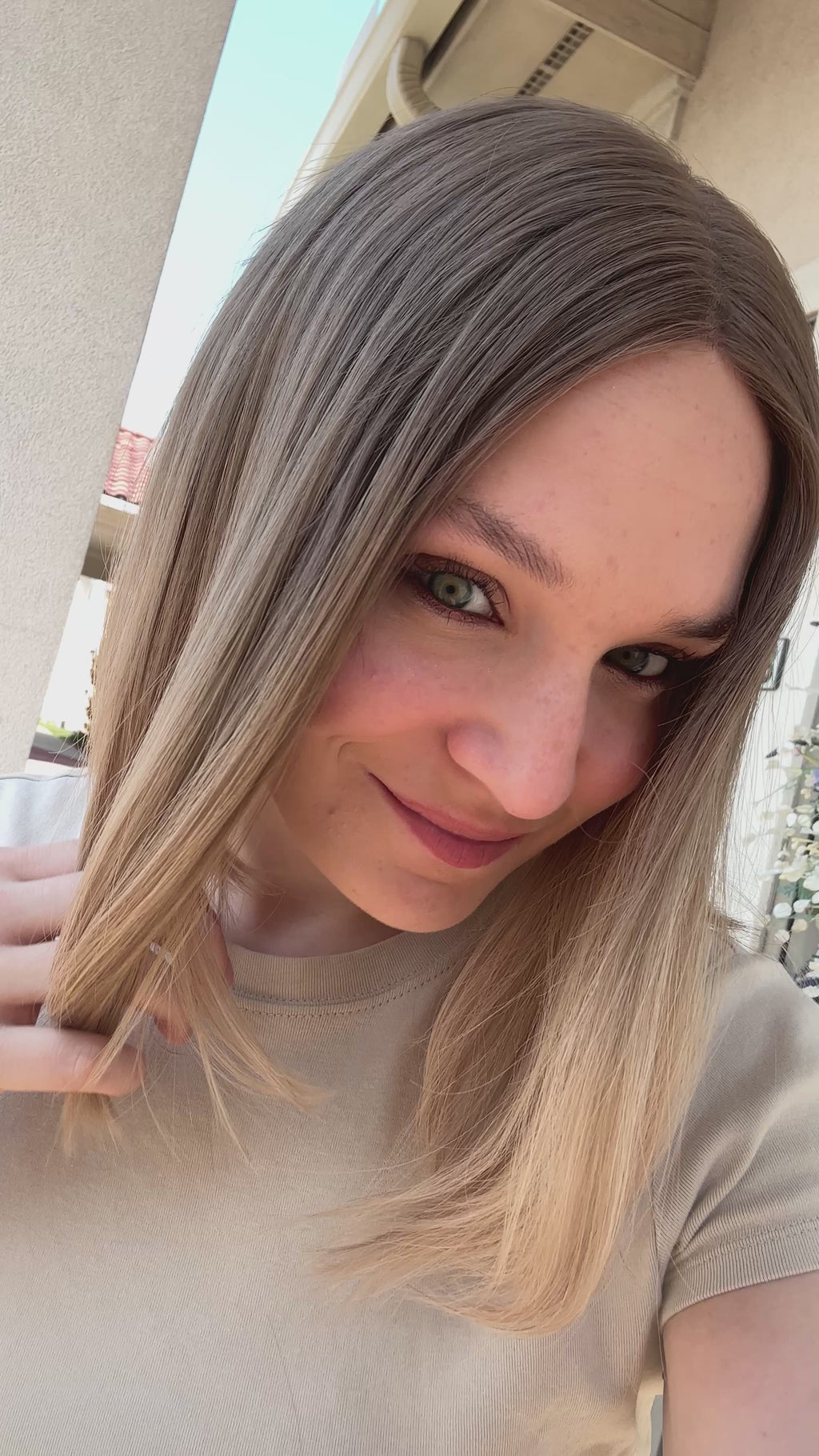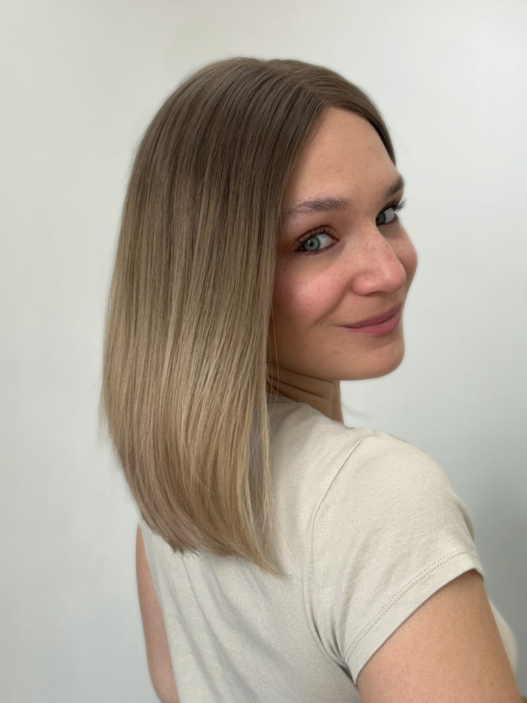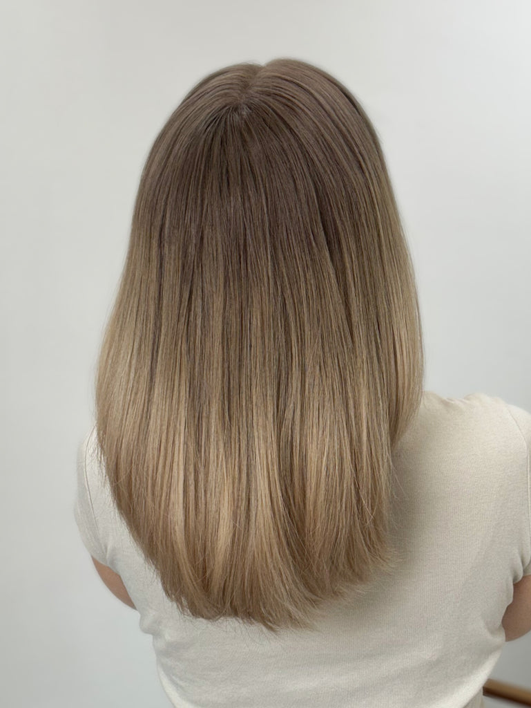 Color: Overall cool-toned with a mousse brown root, closest to a level 8, that has a subtle ombre effect to a lighter ash blonde