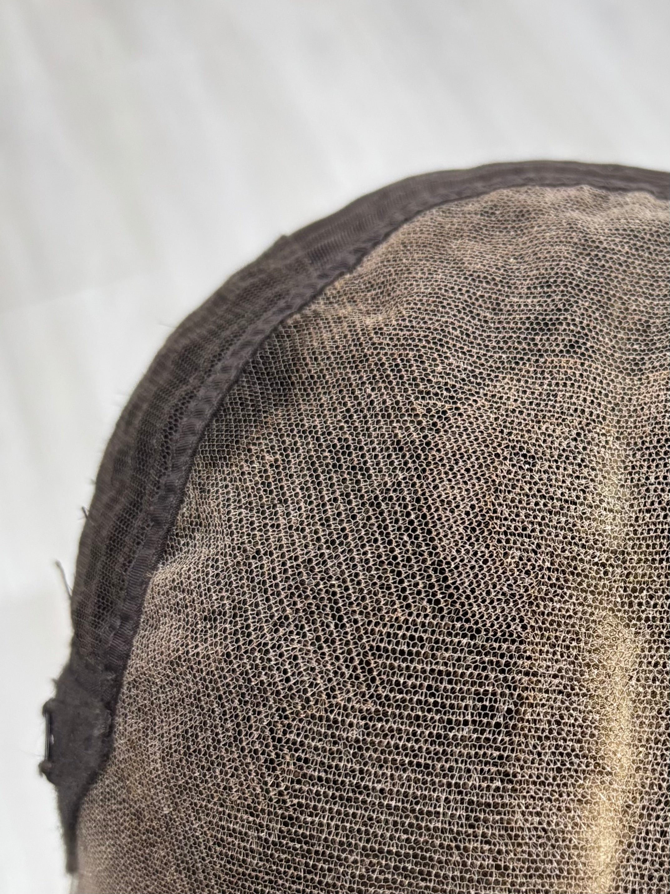 Other: Medium to medium high density (about 130-135%). Lace is uncut. Knots are not bleached due to Bijoux's coloring technique; however, they are naturally a lighter, almost white color. Knots are plucked. This piece comes with loop holes to add a wig strap (which can be purchased on Amazon). There is staining on the lace top that is visible on the knots in those areas. (pictured)