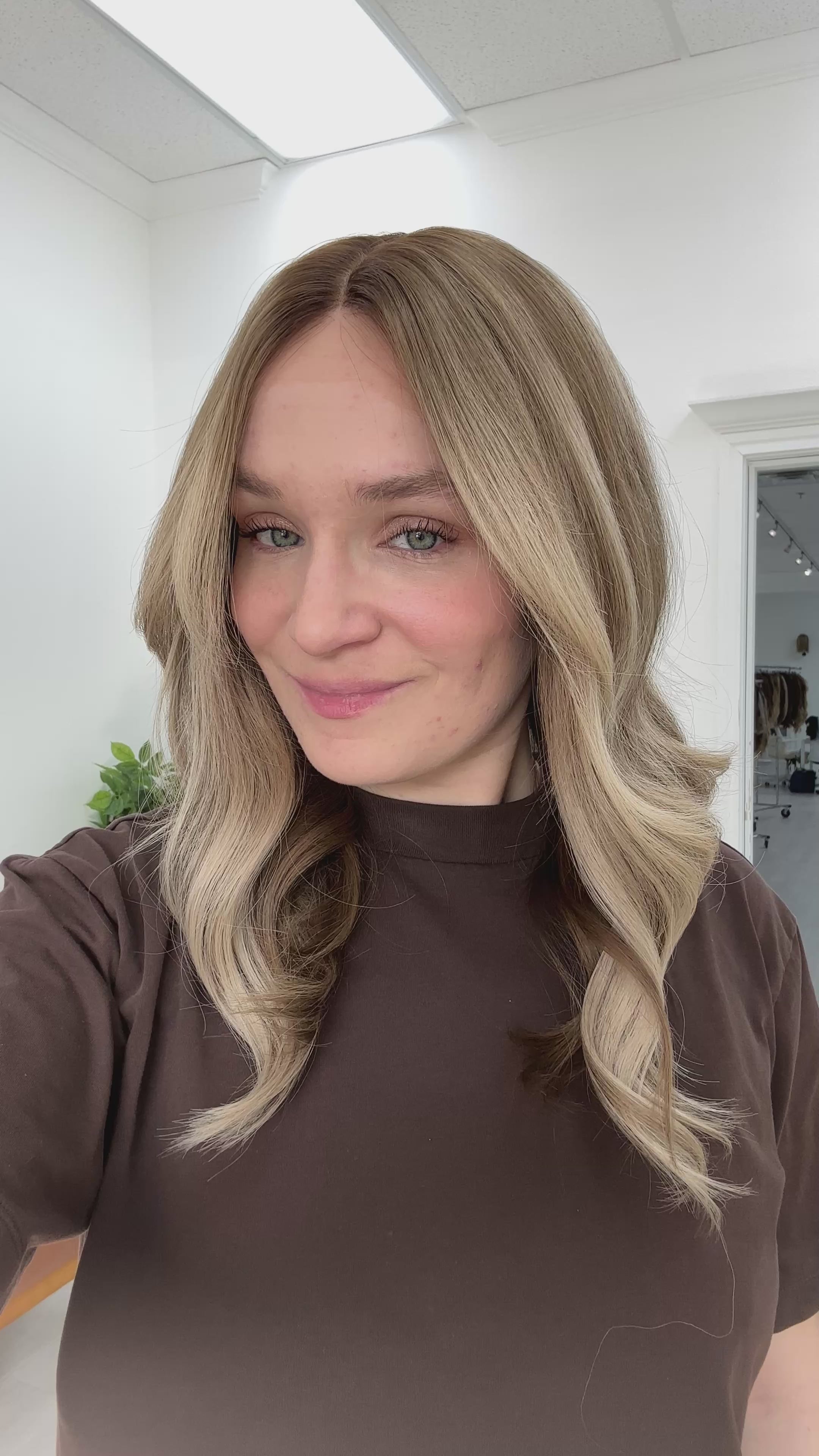 Color: Subtle medium brown root & base into an ashy champagne blonde with dark blonde lowlights