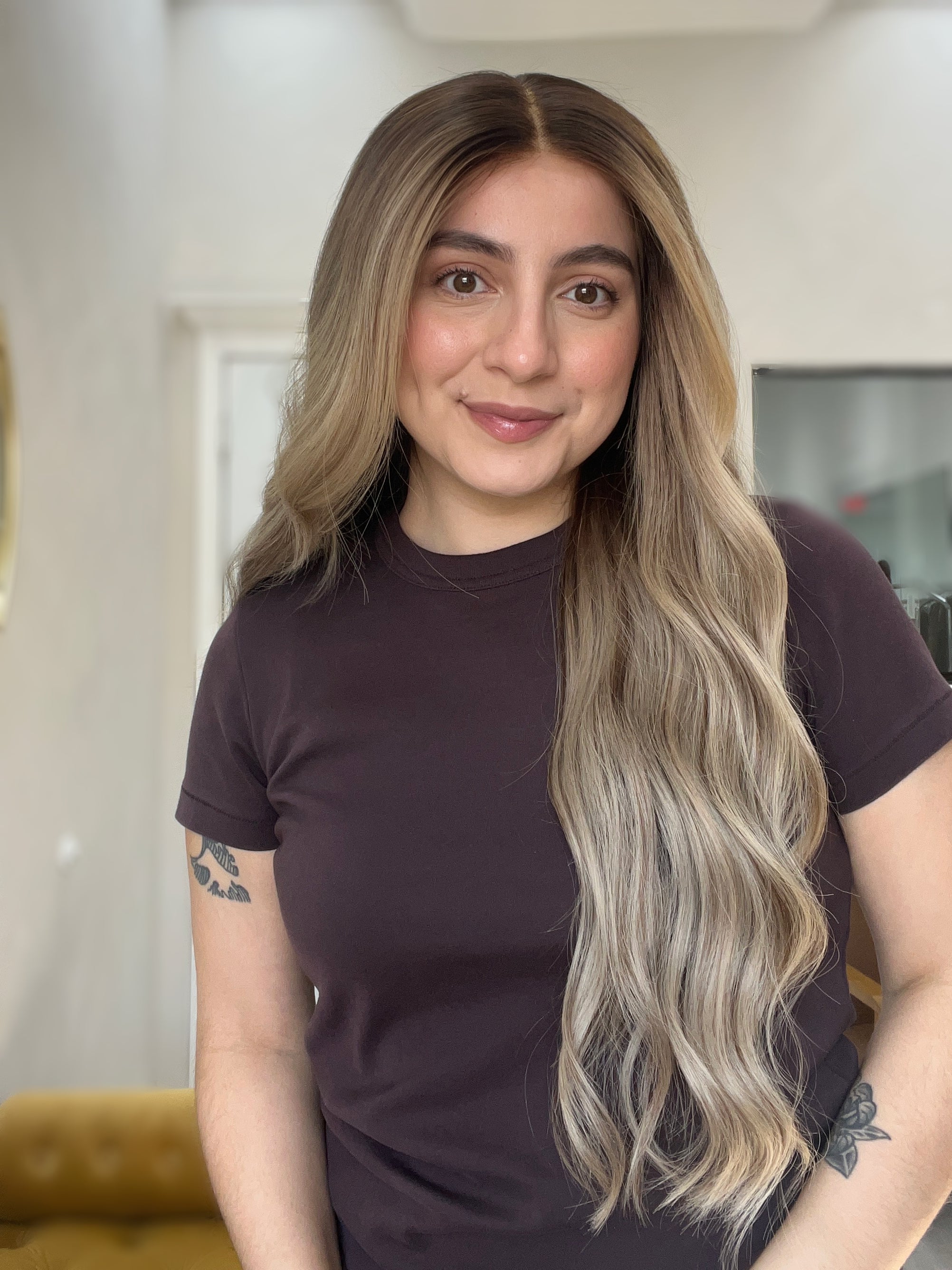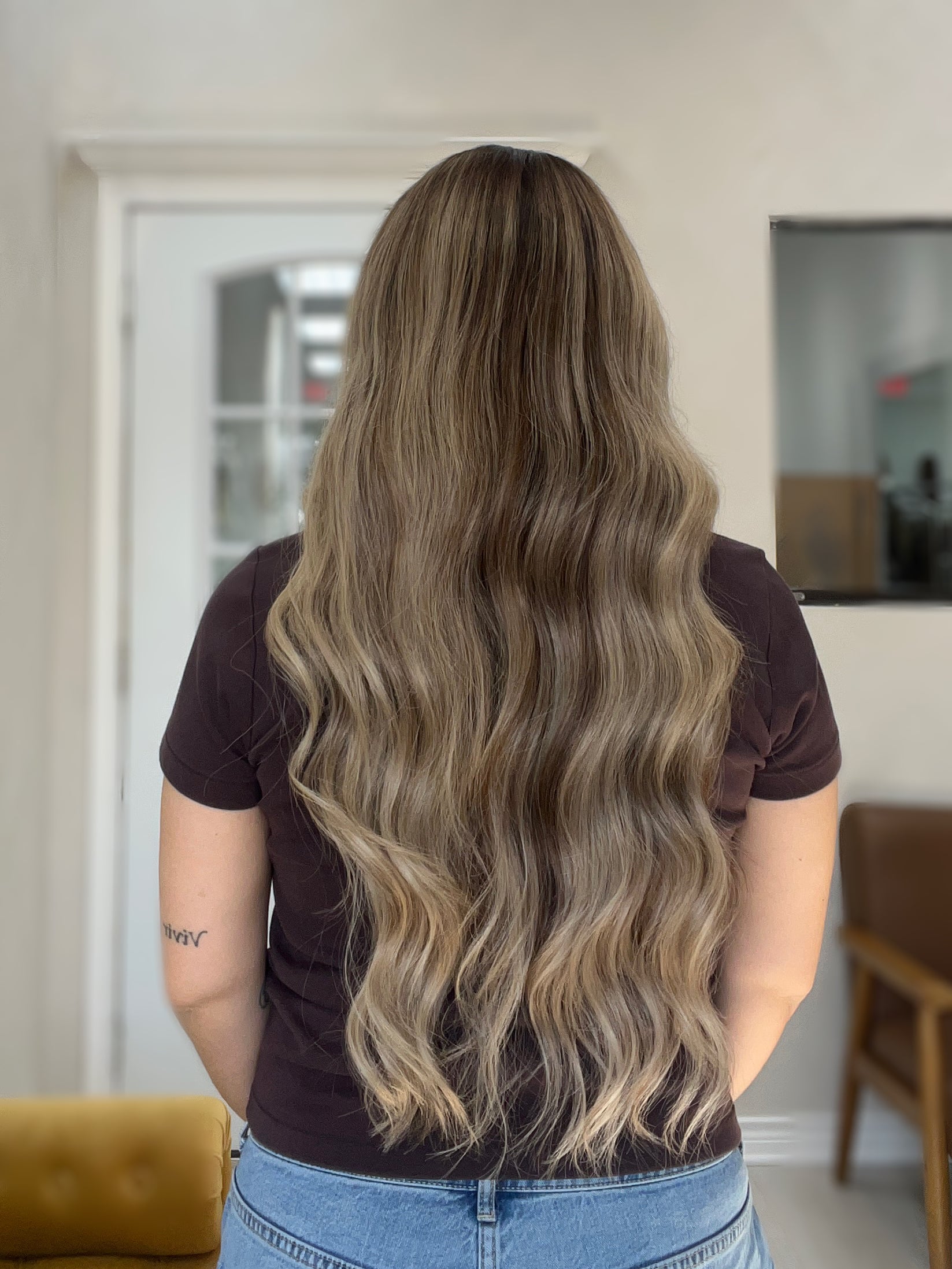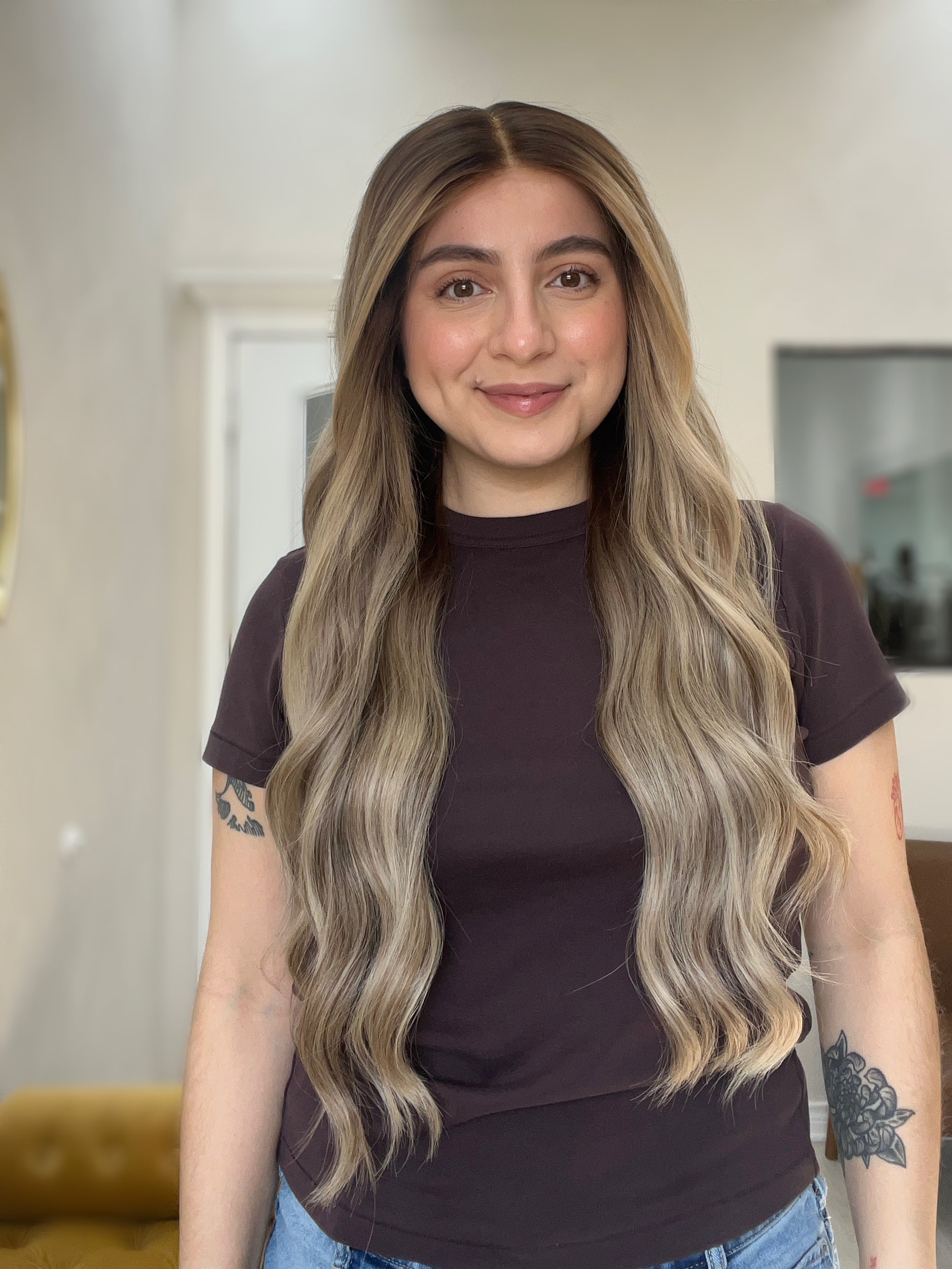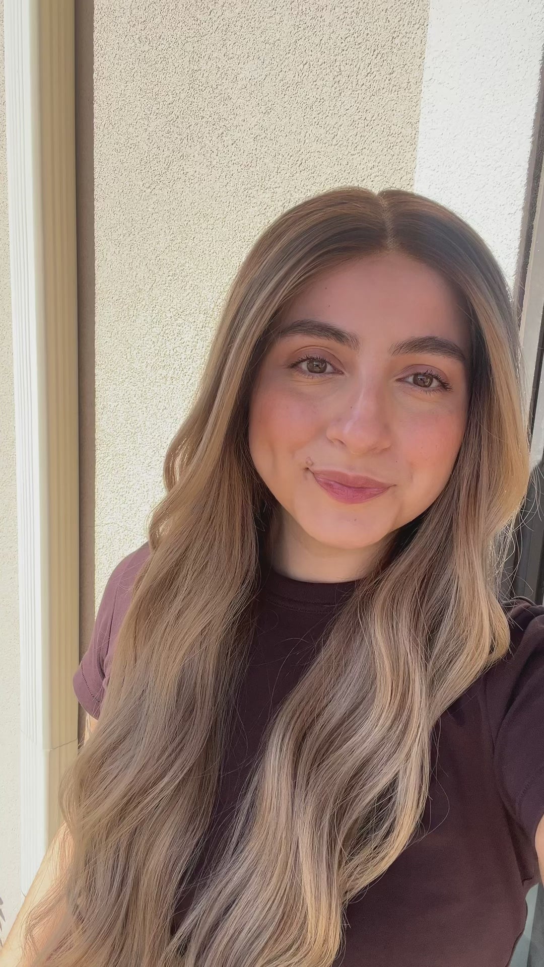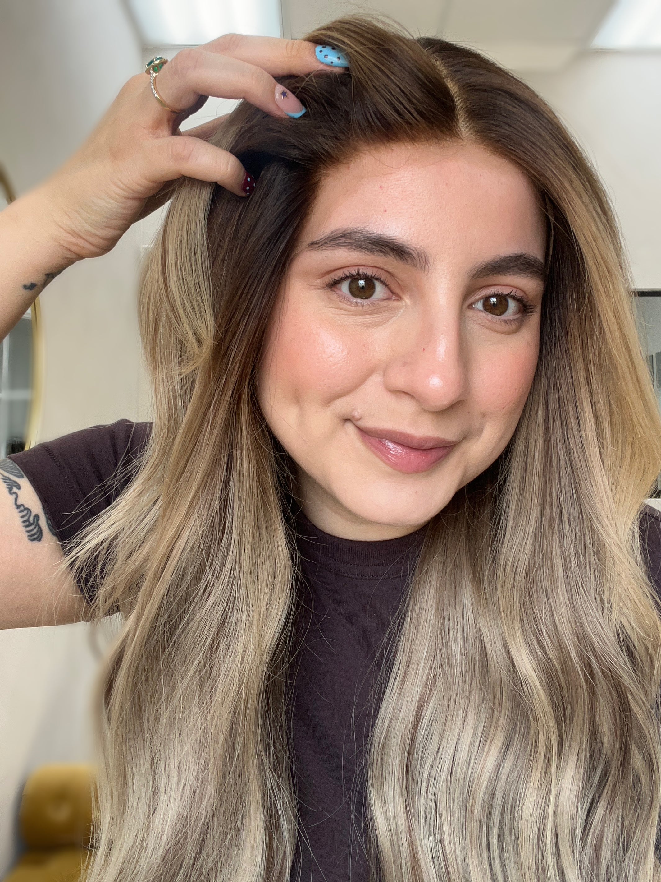 Color: Dark neutral brown root into a light ashy champagne beige blonde with darker lowlights and brighter face framing